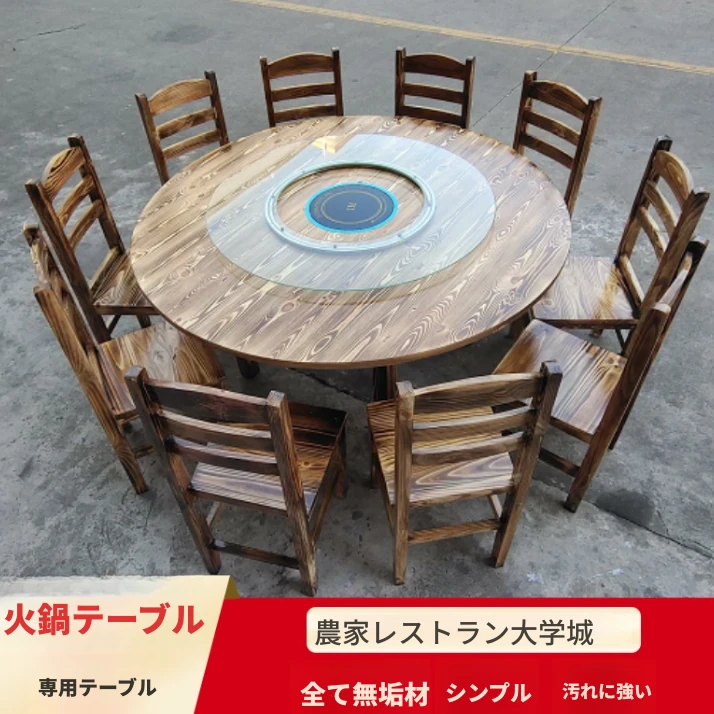 農家レストラン新作!炭化加工のダイニングテーブルセット - 高品質の無垢材使用、火鍋や大人数向けに最適なラウンドテーブルと椅子の組み合わせ。快適な個室も完備!おしゃれで温かみのある空間を演出します。