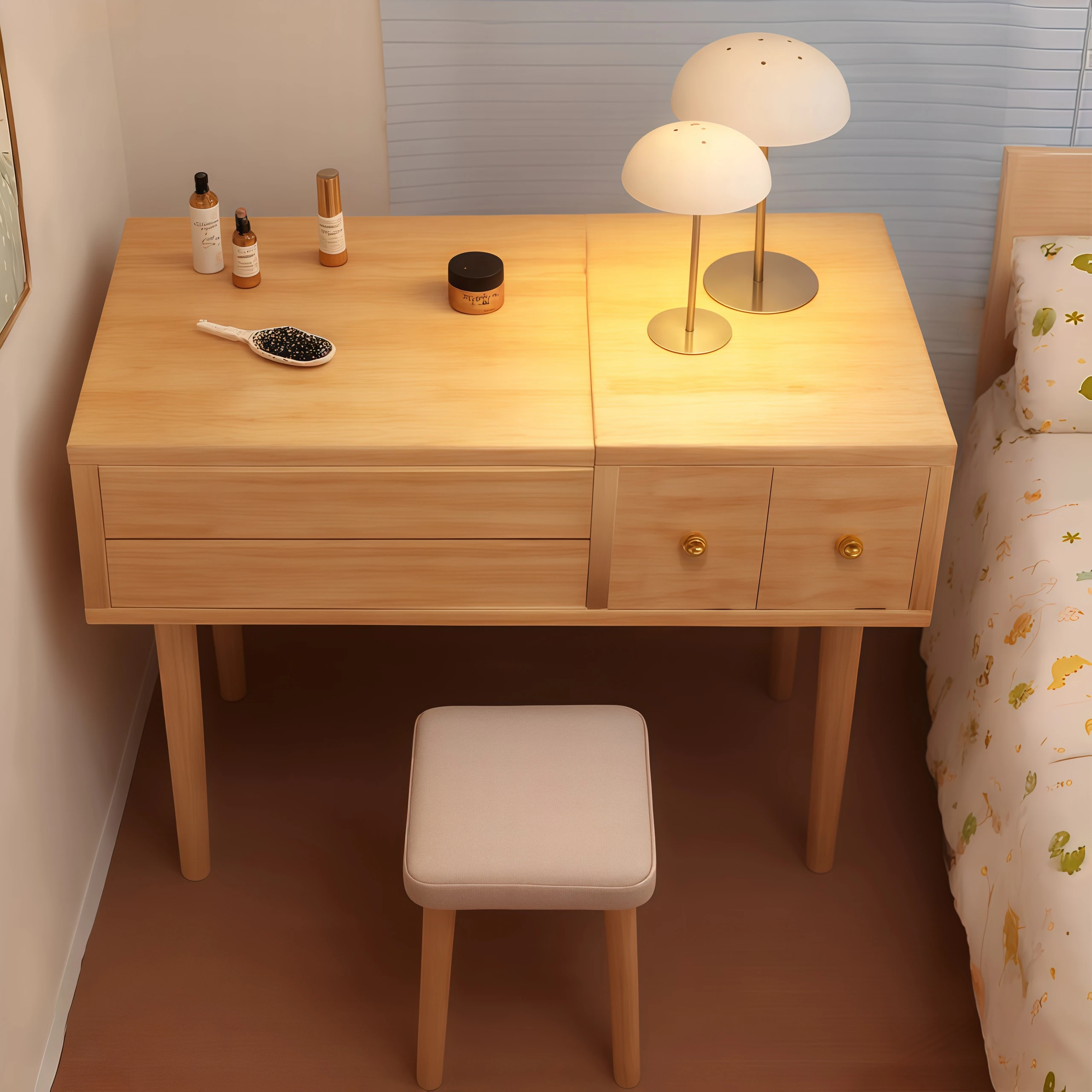 2025 New Wooden Style Solid Wood Flip-Top Vanity Table - Compact Multi-Functional Nightstand & Makeup Desk for Small Spaces