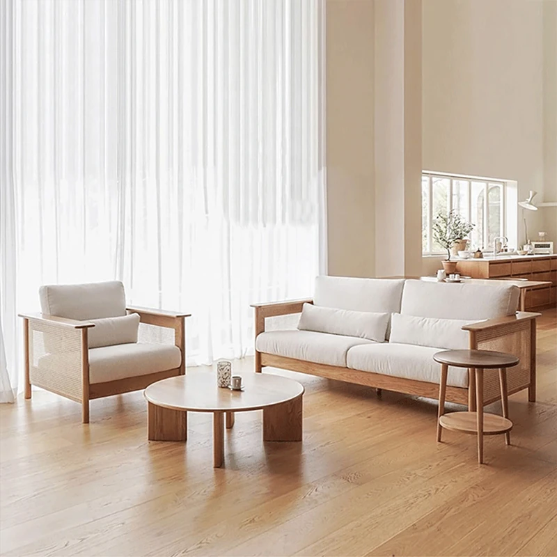 Modern Japanese Rattan Sofa Set for Small Spaces – Natural Oak Wood and Fabric Couch Combination, Perfect for Minimalist Living Rooms