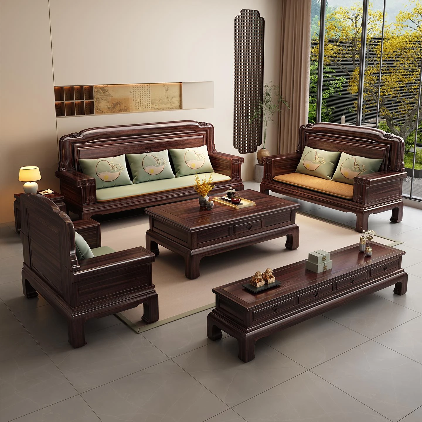 Elegant New Chinese Style Blackwood Sofa Set – All Solid Wood Frame, Luxurious Chaise Lounge for Spacious Living Rooms, Perfect for Year-Round Comfort in Winter and Summer.