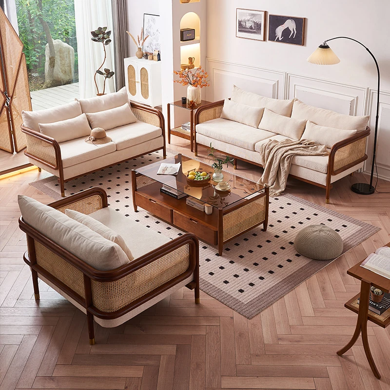 Nordic Vintage Rattan Sofa Set - Minimalist Designer Solid Wood Lounge Chairs for Living Room, Retro Recliner Combo, Perfect for Cozy Spaces