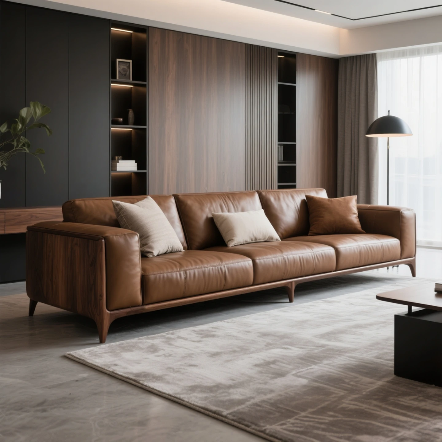Modern Chinese Black Walnut Leather Sofa – Sleek Designer Style for Hotels, Airbnb, Offices, and Luxury Showroom Furniture