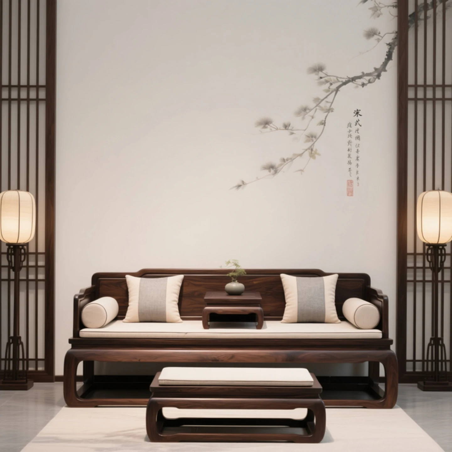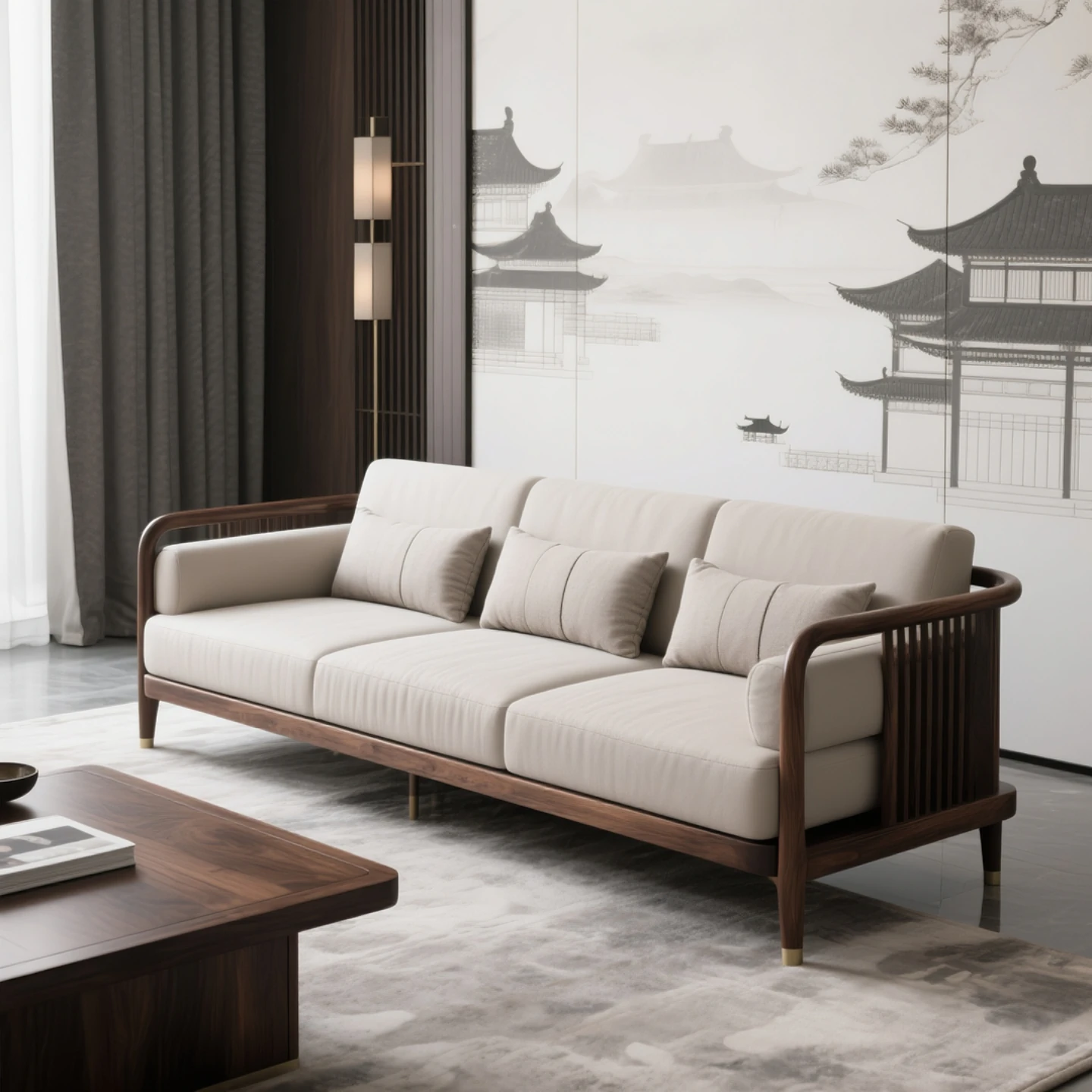 New Chinese Style North American Black Walnut Sofa - Elegant Song Dynasty Aesthetic for Zen-Inspired Office and Villa Living Room, Embracing Wabi-Sabi Design Principles
