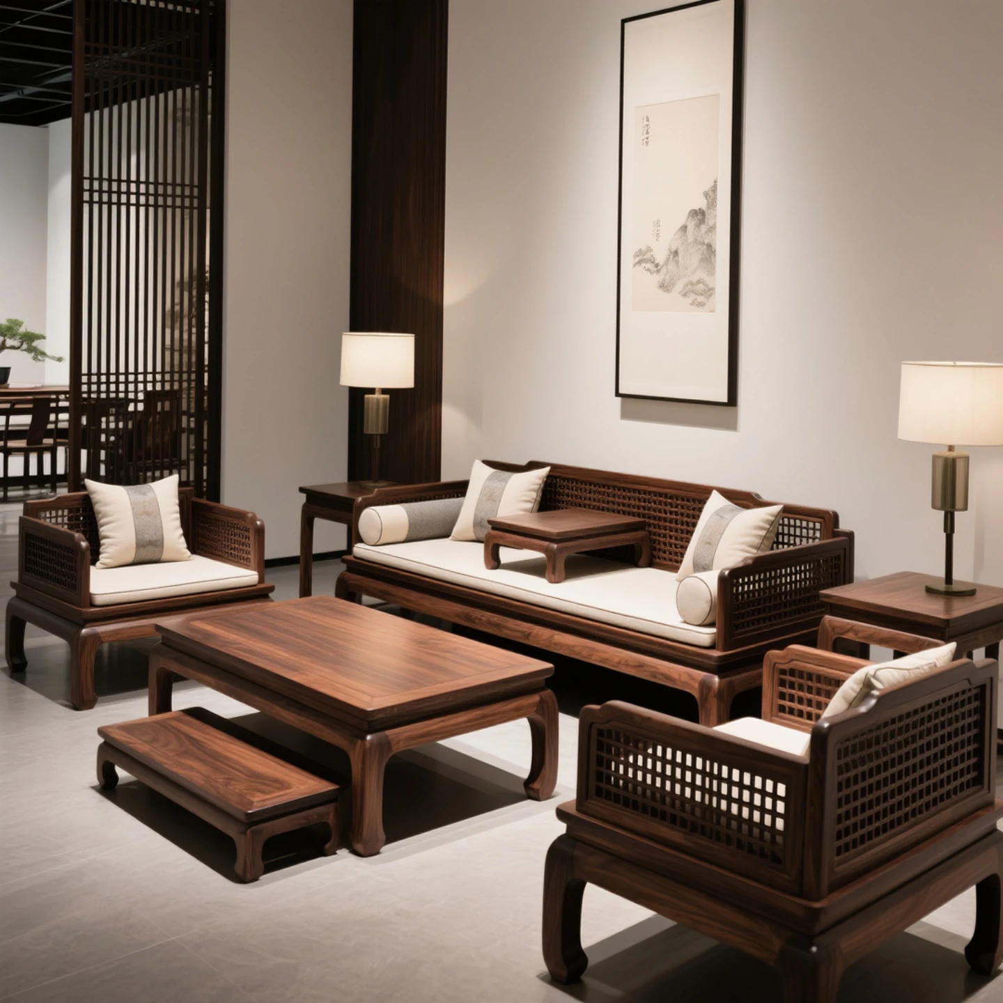 Modern New Chinese Style Black Walnut Solid Wood Sofa Set - Embrace Wabi-Sabi Aesthetics for Your Spacious Home with Timeless Elegance.