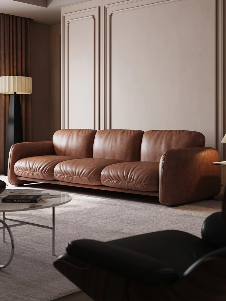 Genuine Leather Modern Luxury Sofa for Small Living Rooms - Vintage Style Top-Grain Cowhide Sofa with Straight Design