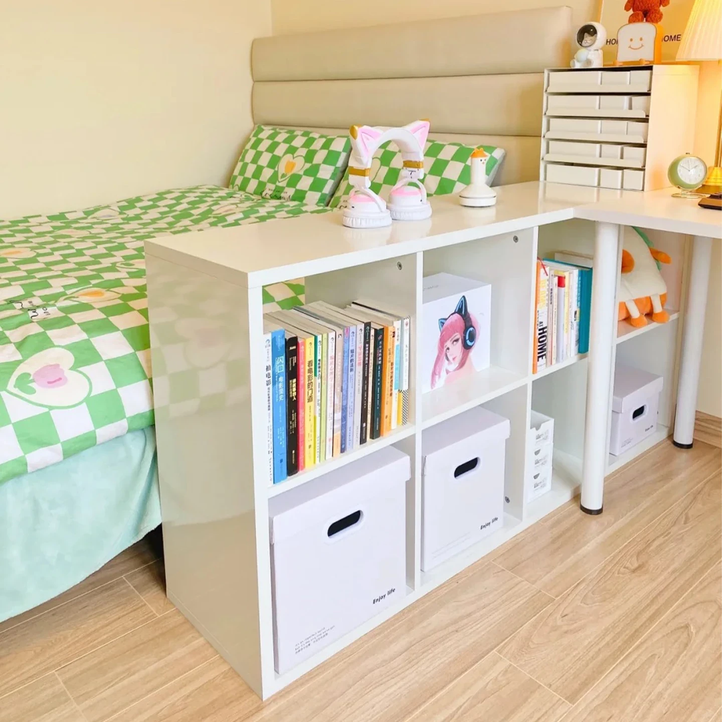 Cream Style Half-Enclosed Nightstand - Versatile Bookshelf and Storage Cabinet for Bedroom, Wall-Mounted Organizer and Room Divider, Perfect for Stylish Home Décor and Efficient Space Management.