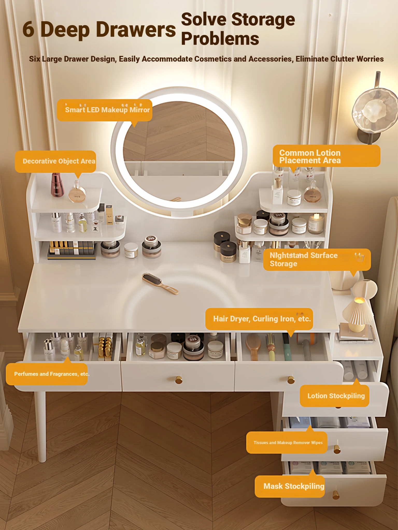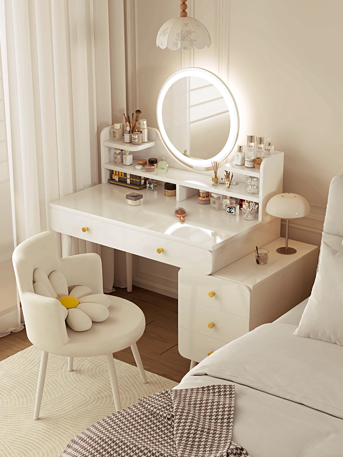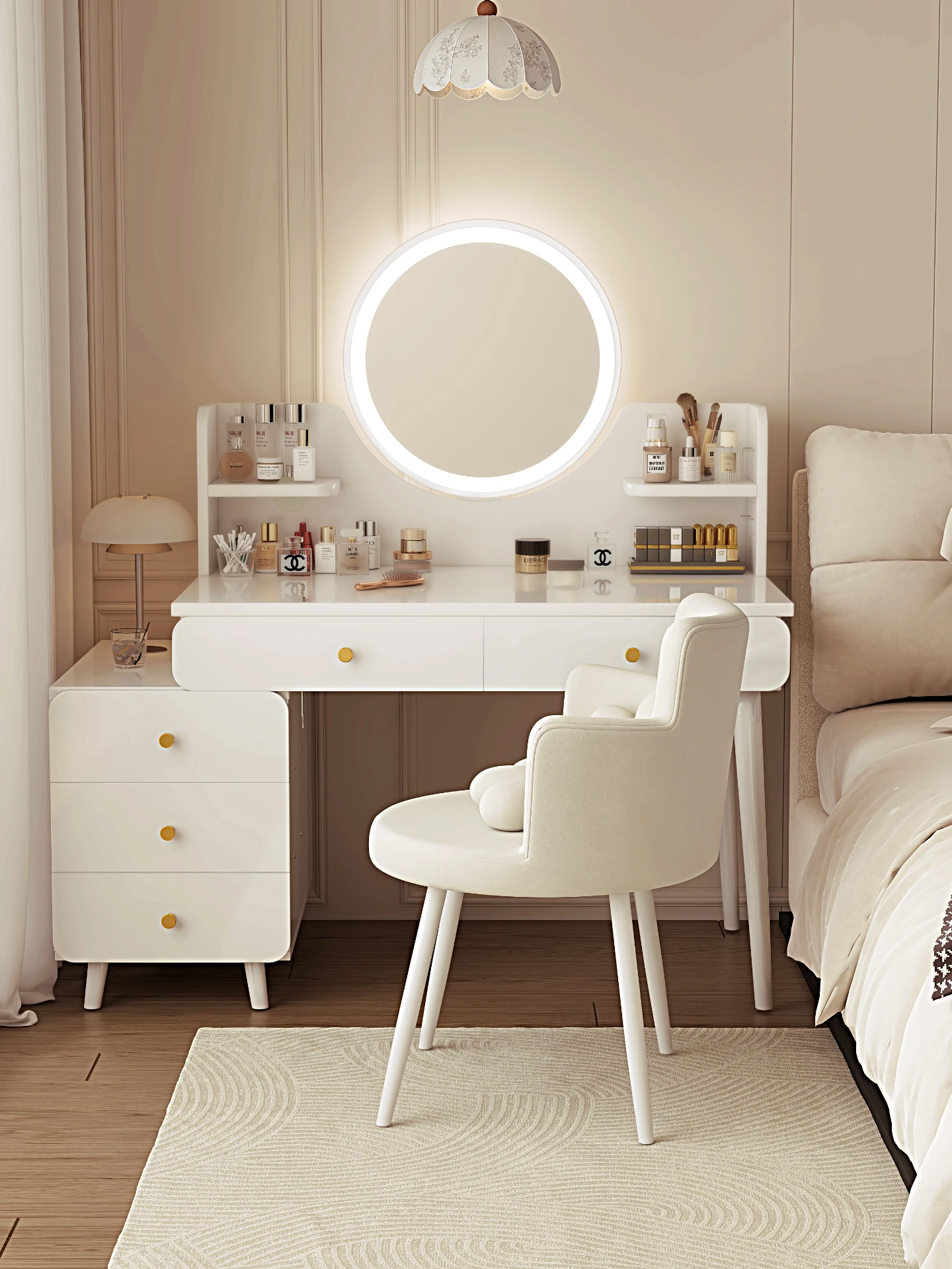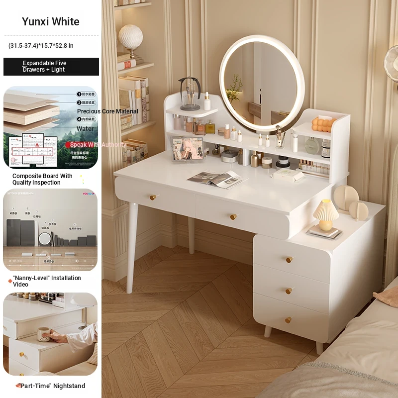 Main drawing✅[Five draw + LED intelligent mirror + small flower chair] 31.50in-37.40in Cloud Creek White