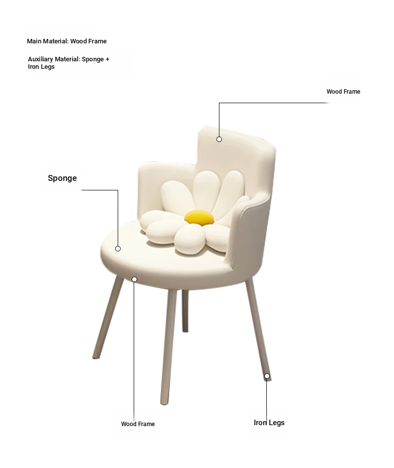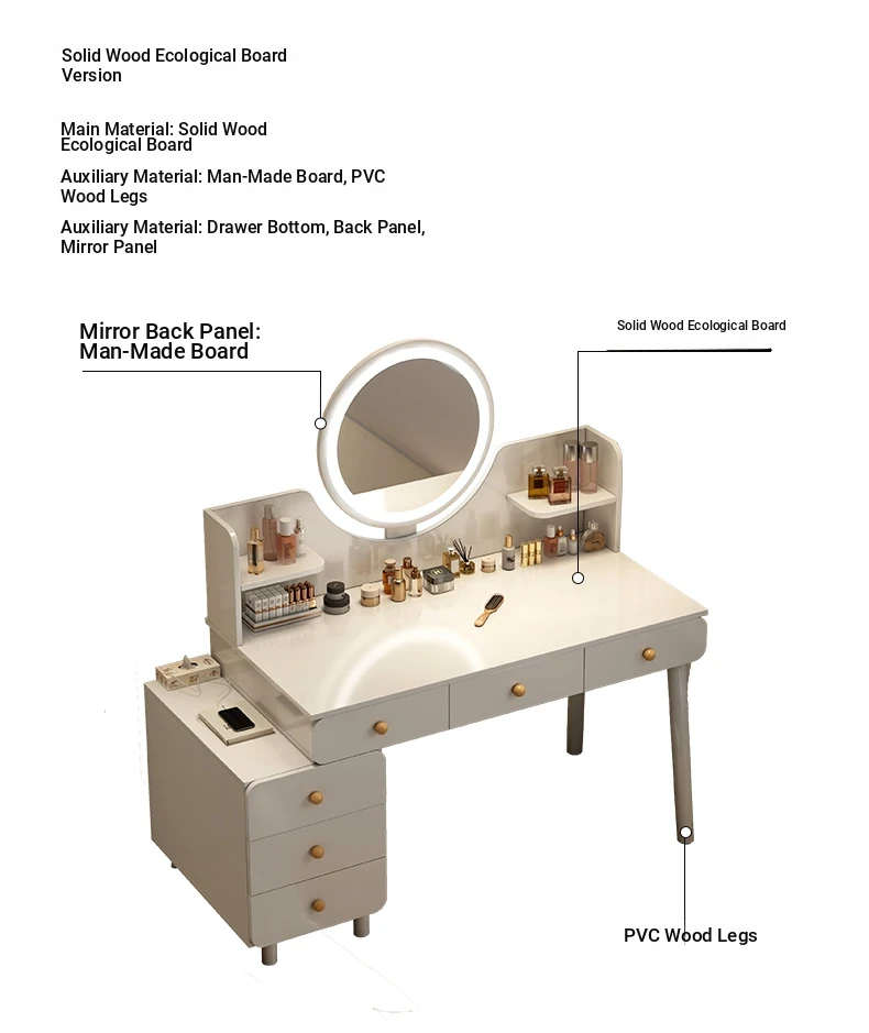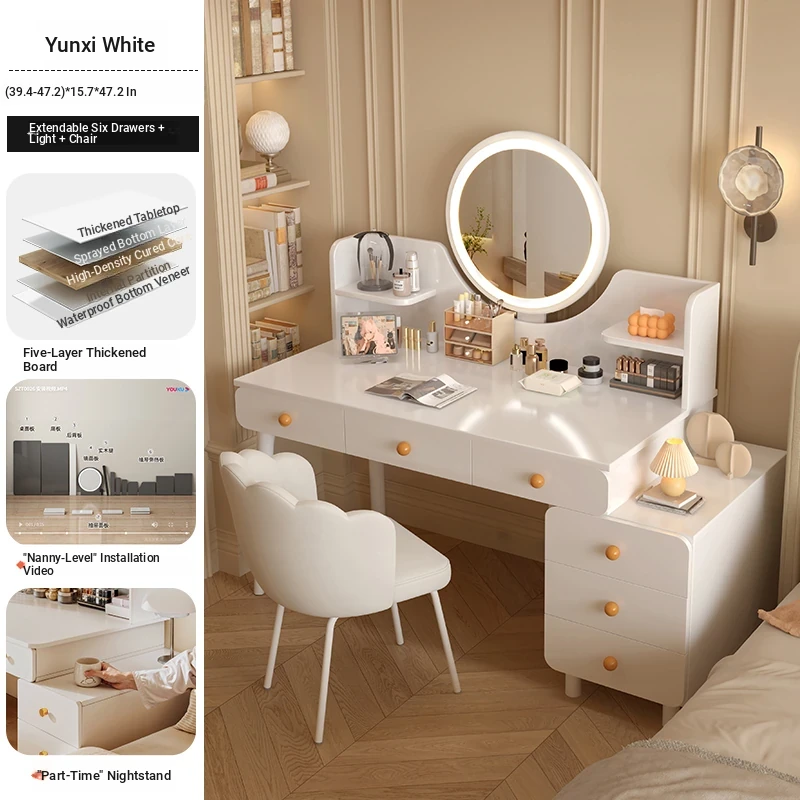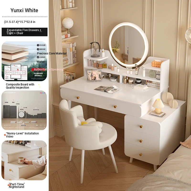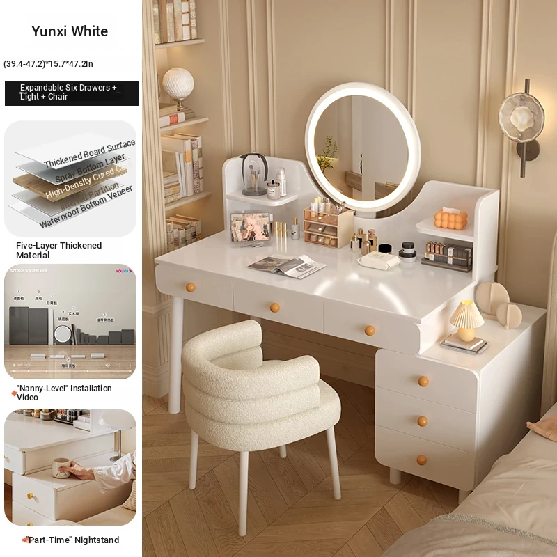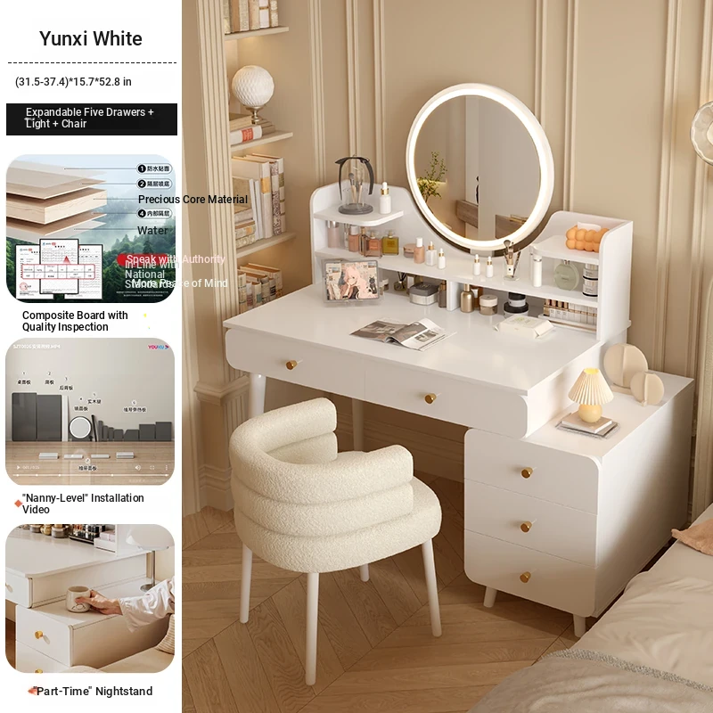 Solid Wood ecological board⭐[Five draw + side cabinet + LED intelligent mirror + petal chair] 31.50in-39.37in Yunxi White