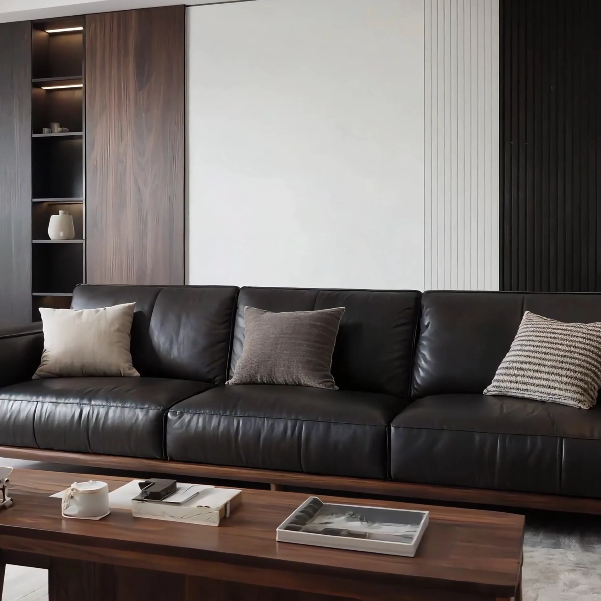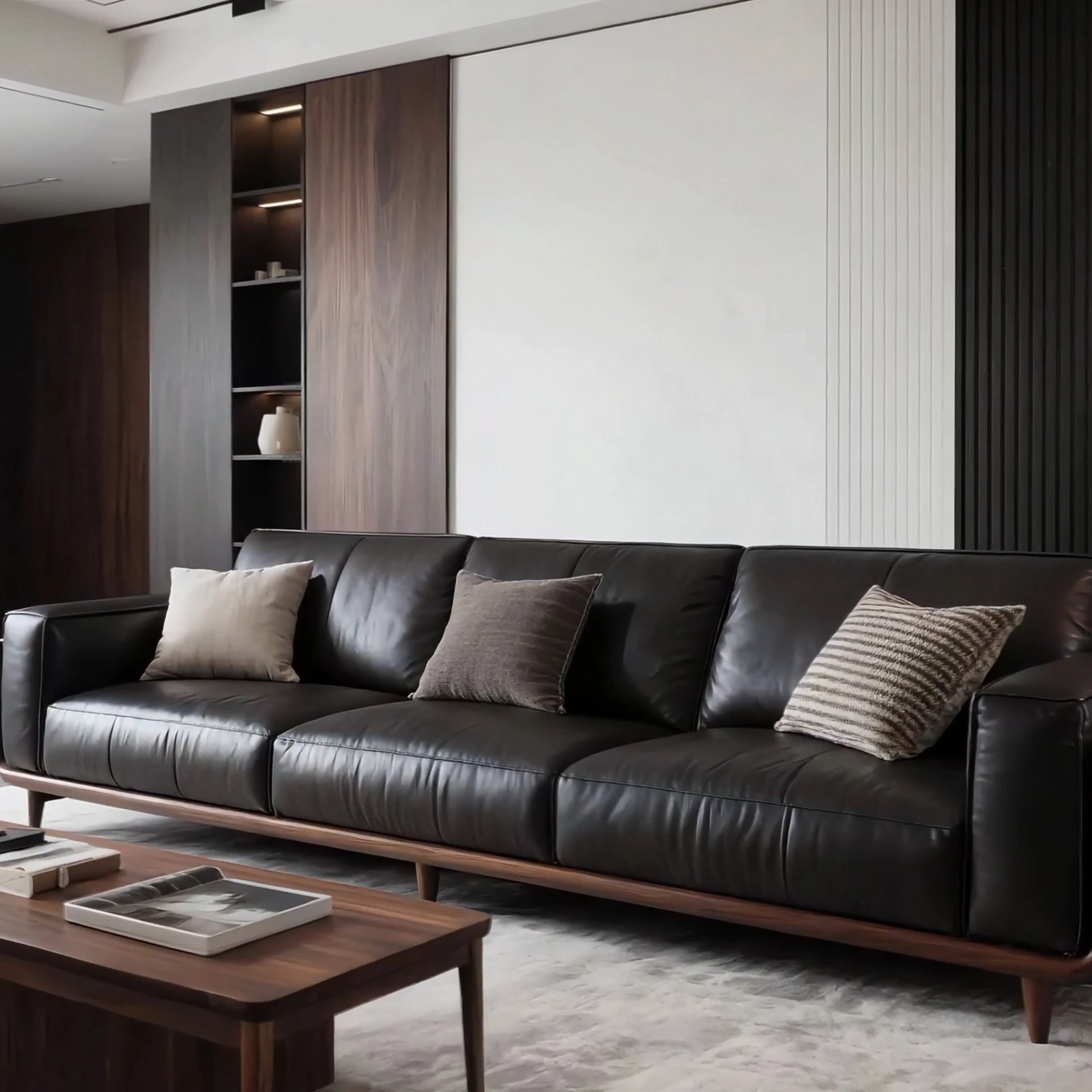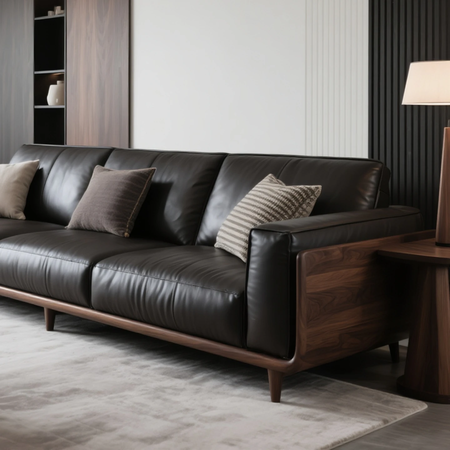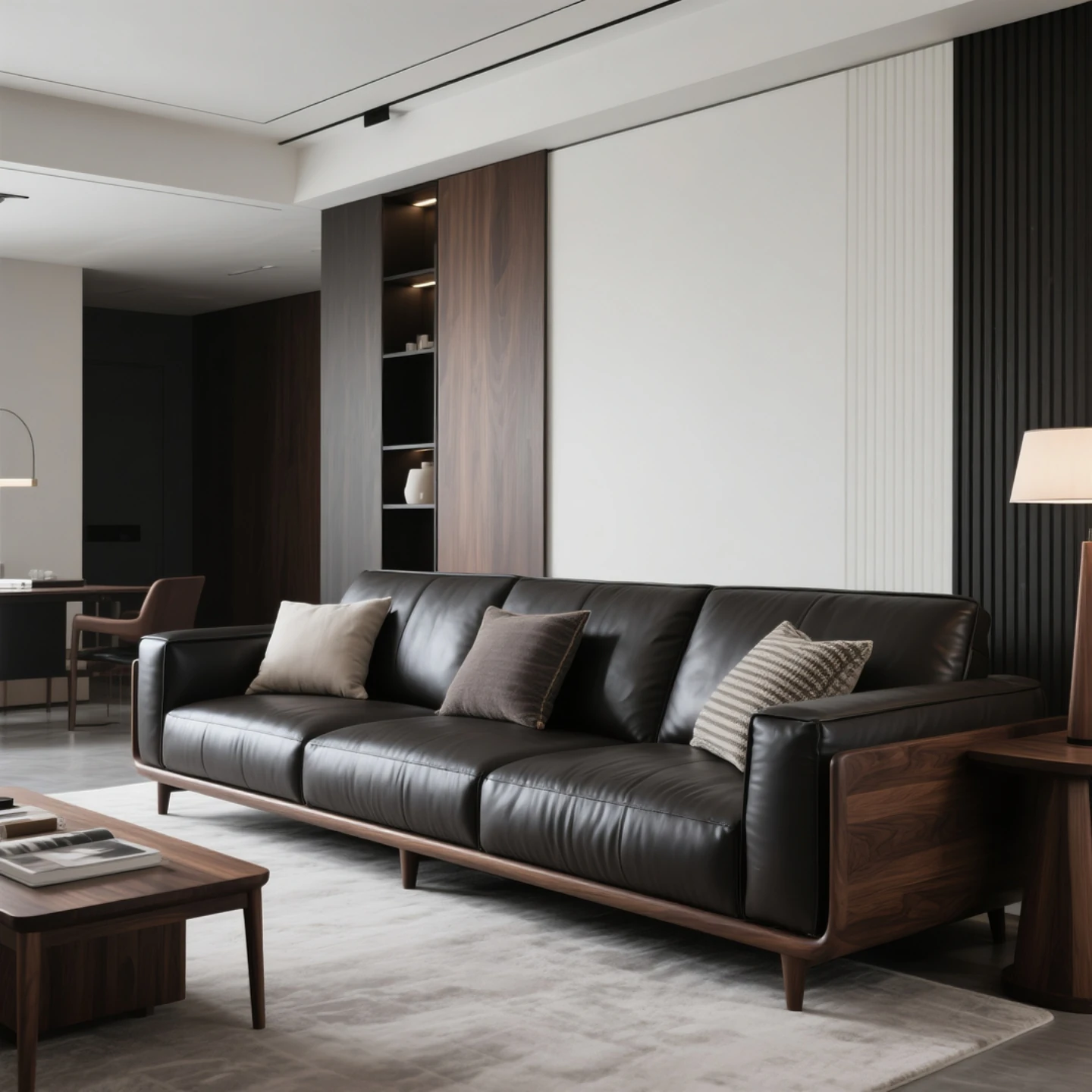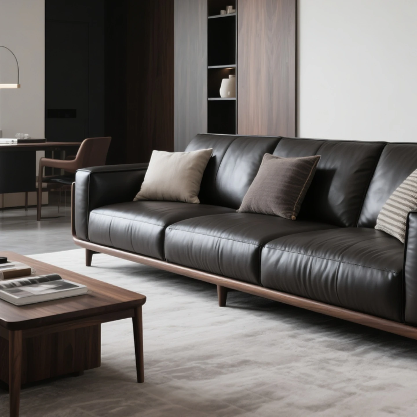 Elegant New Chinese Style Black Walnut Leather Sofa - Sleek Design for Hotels, Guesthouses, and Offices. Perfect for Luxurious Model Rooms and Modern Interiors.