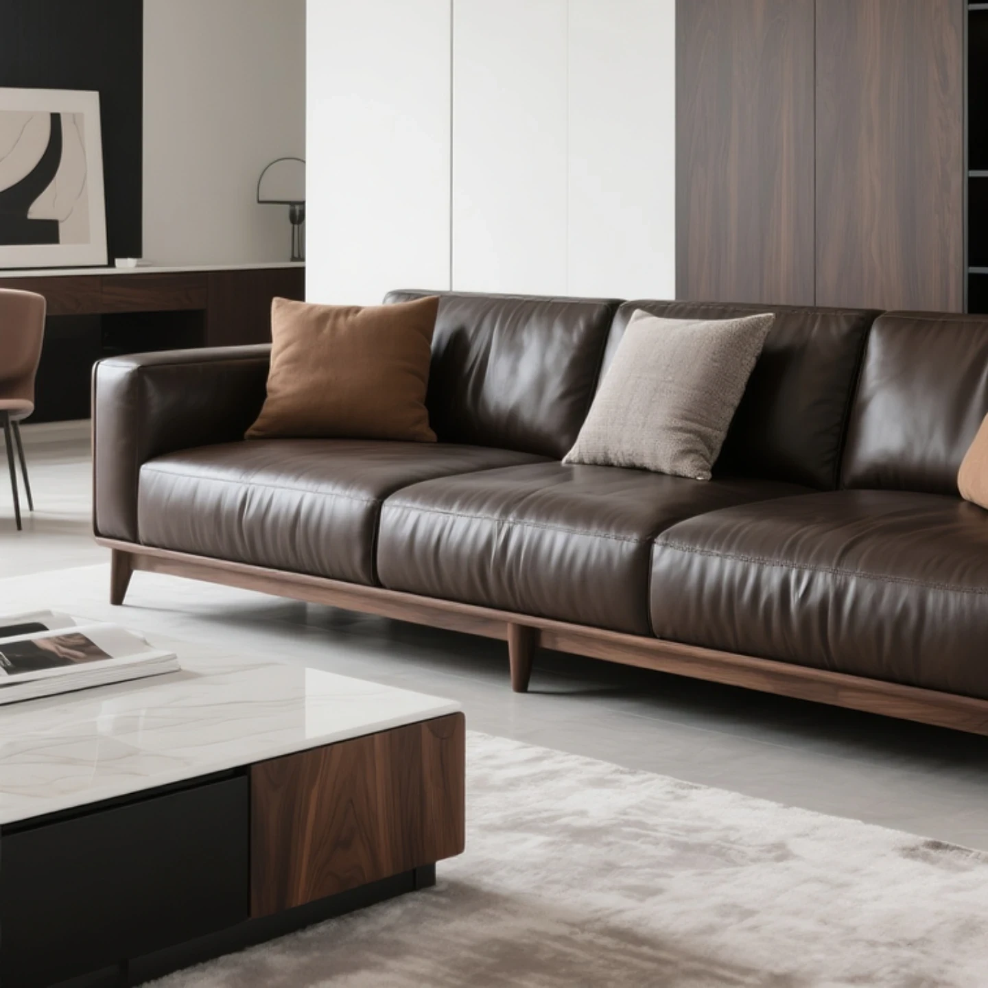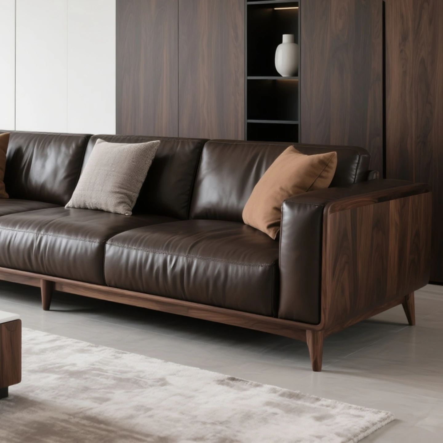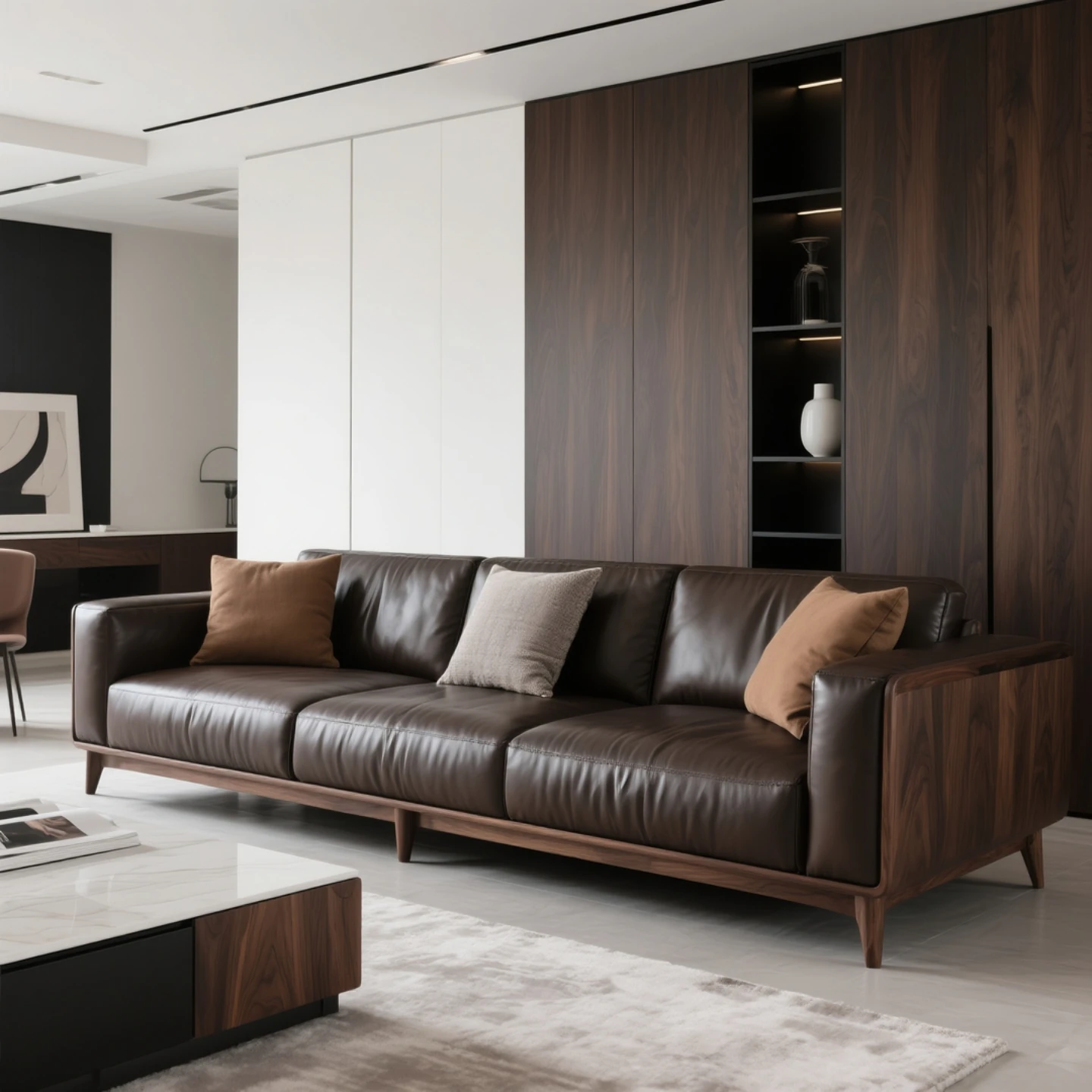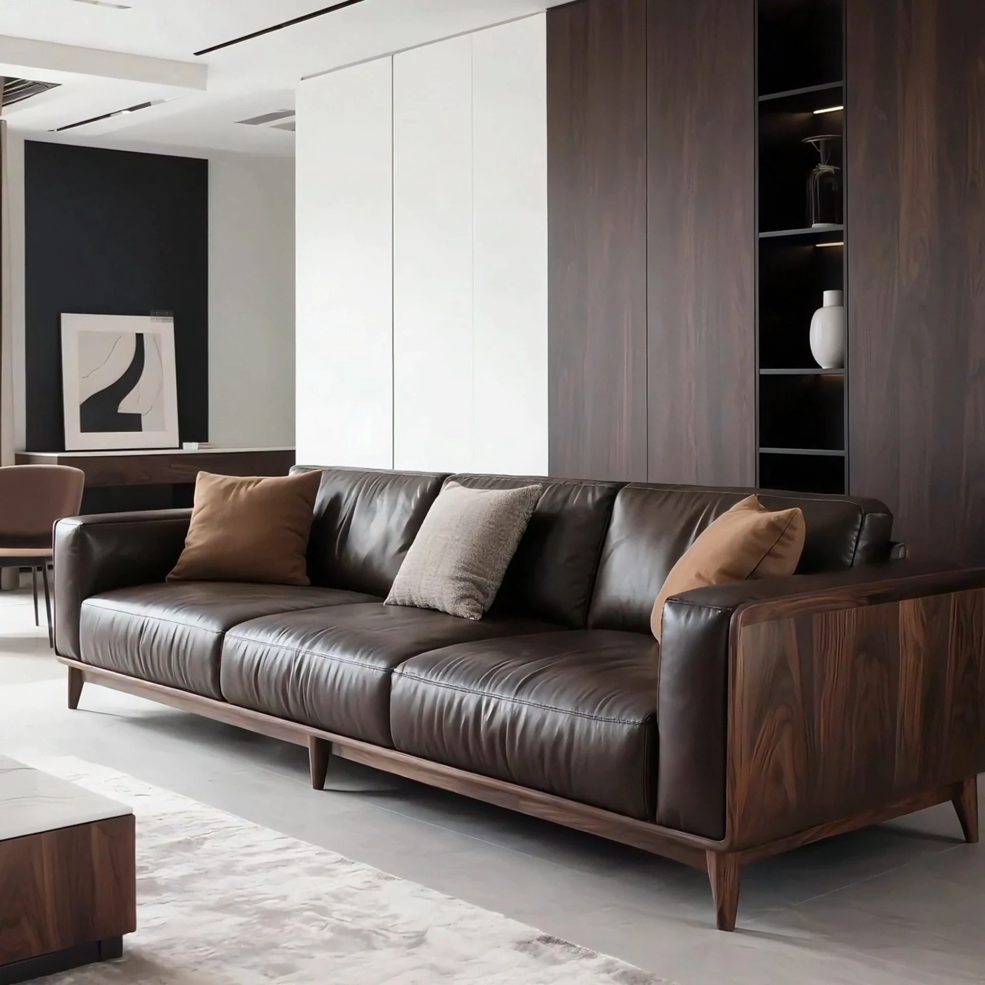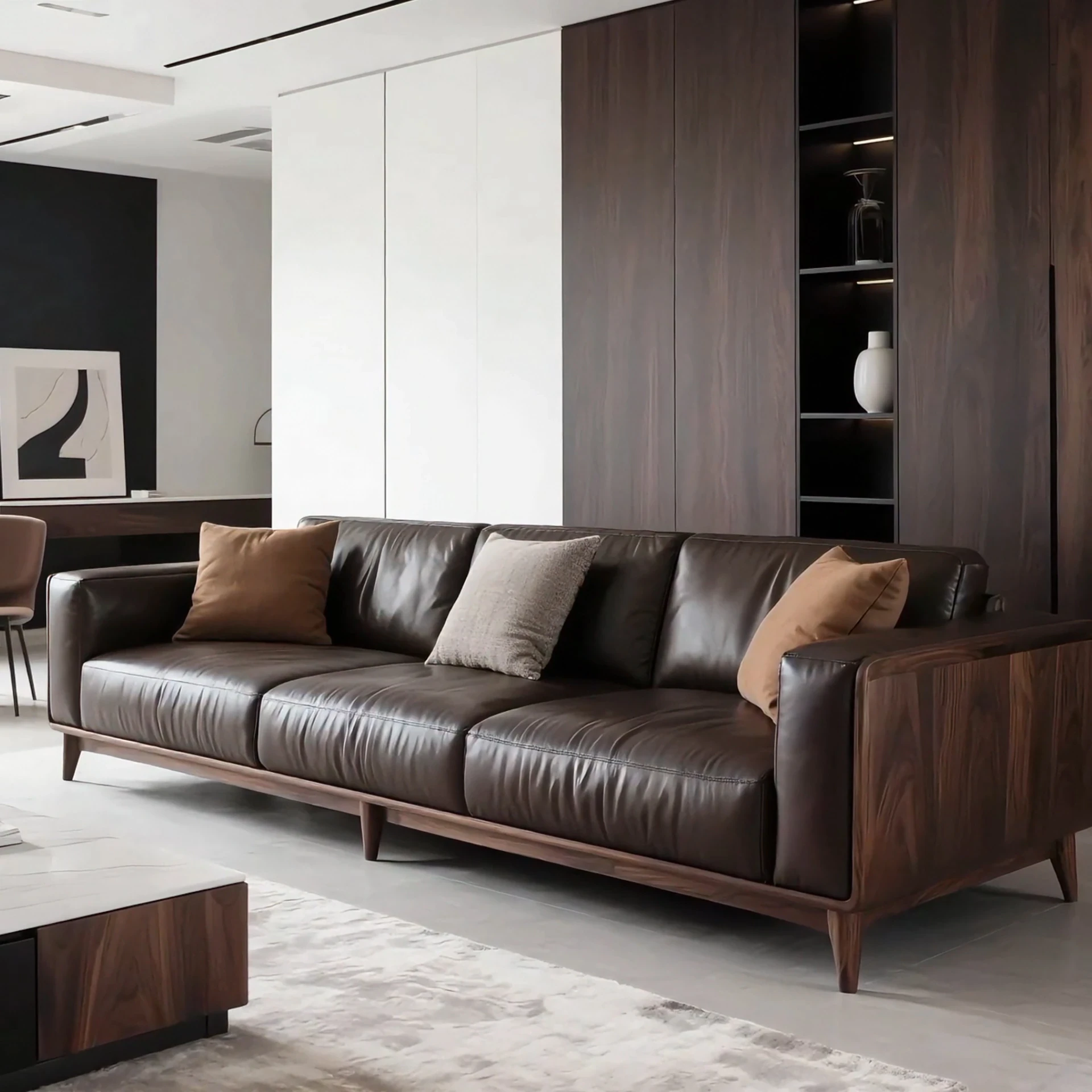 "Elegant New Chinese Style Black Walnut Leather Sofa - Straight Line Design for Hotels, Boutique Lodgings, and Offices - Perfect for Luxury Showrooms and Modern Living Spaces"