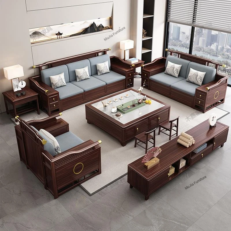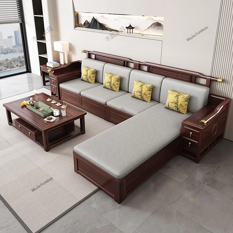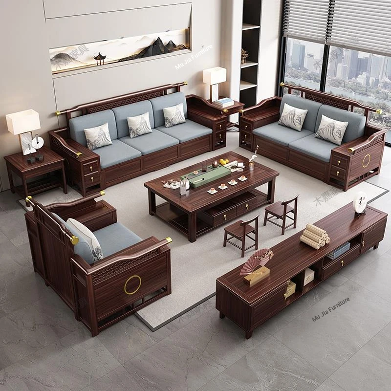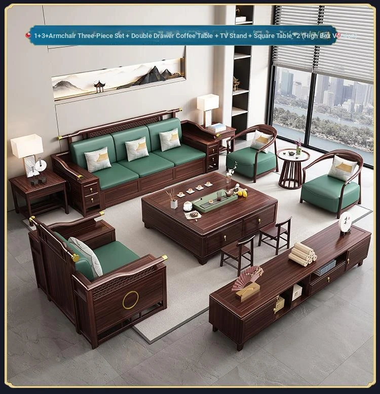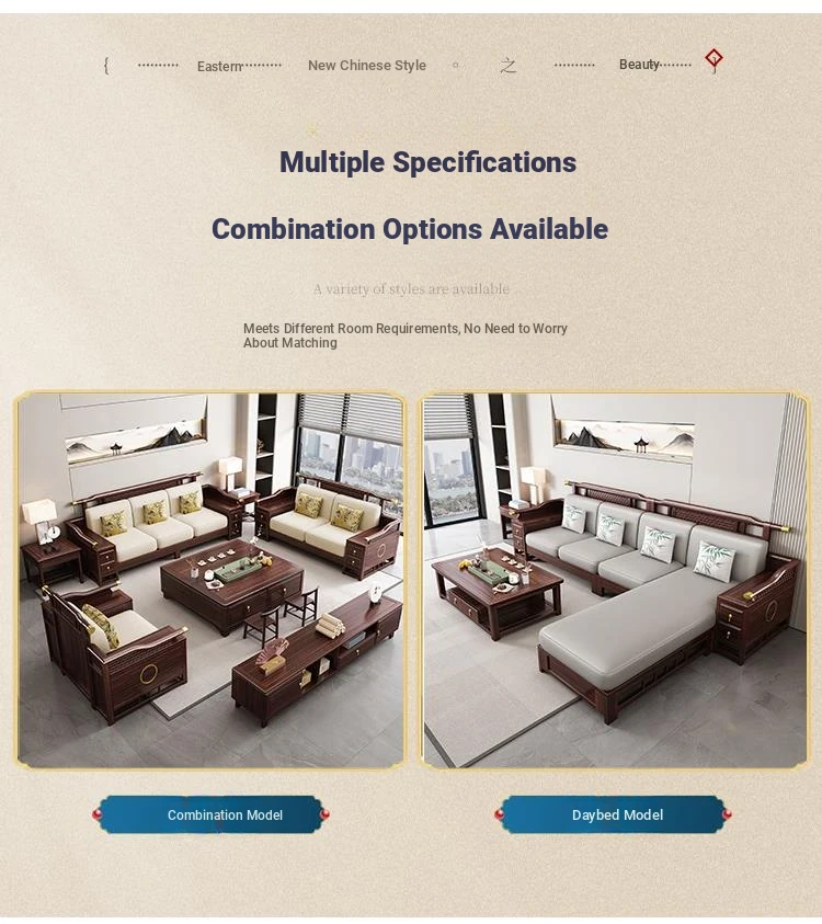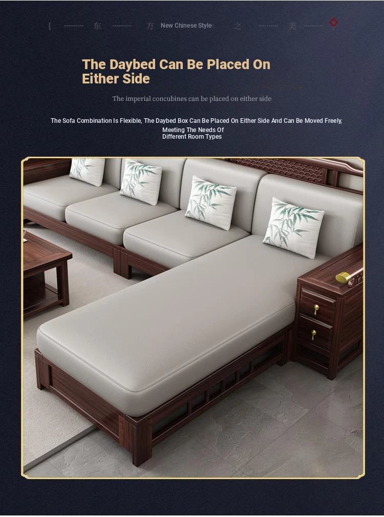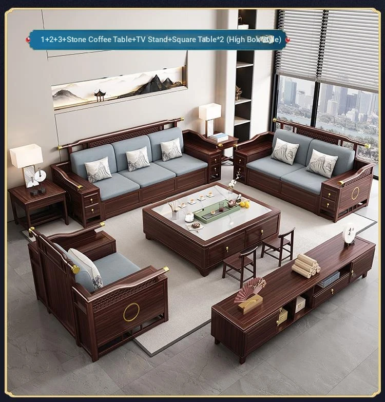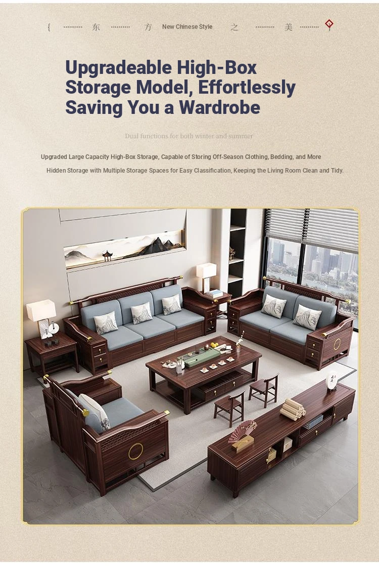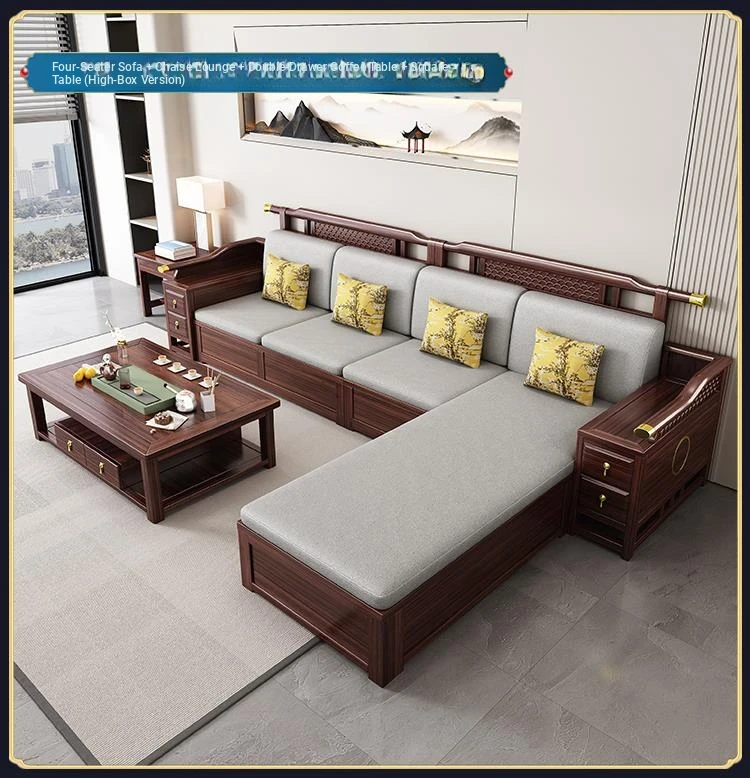 Elegant New Chinese Style Blackwood Sofa Set – All Solid Wood Frame, Luxurious Chaise Lounge for Spacious Living Rooms, Perfect for Year-Round Comfort in Winter and Summer.