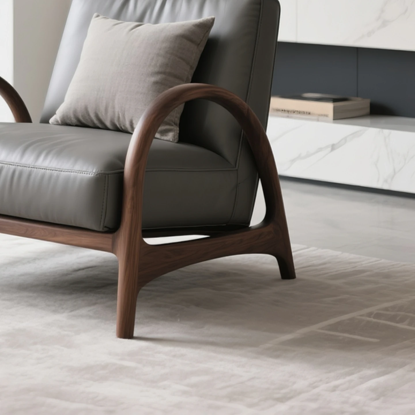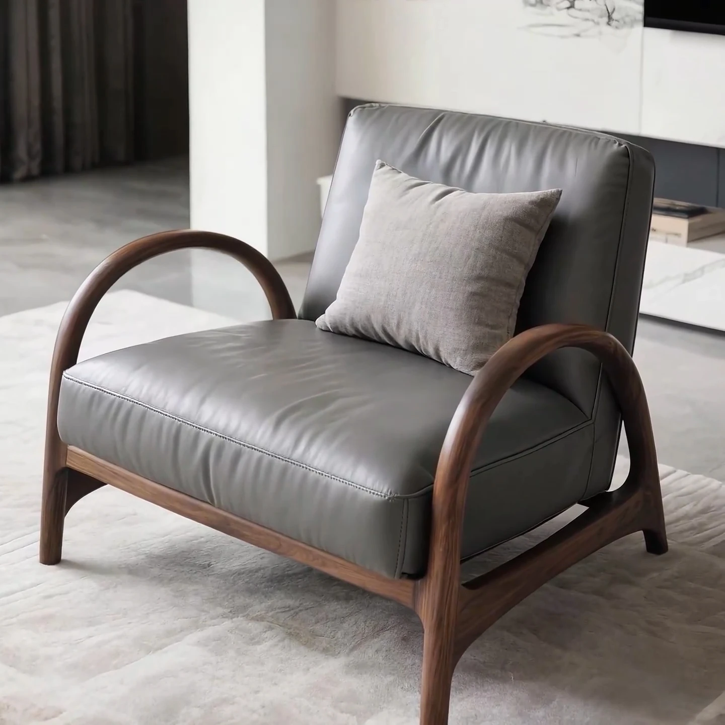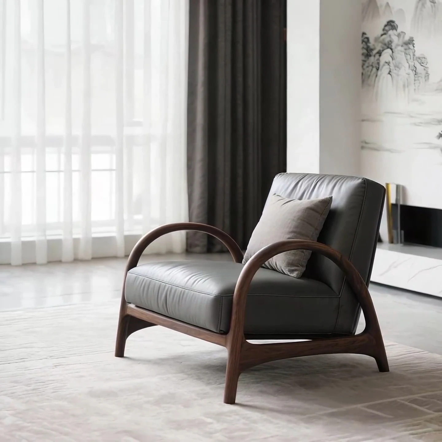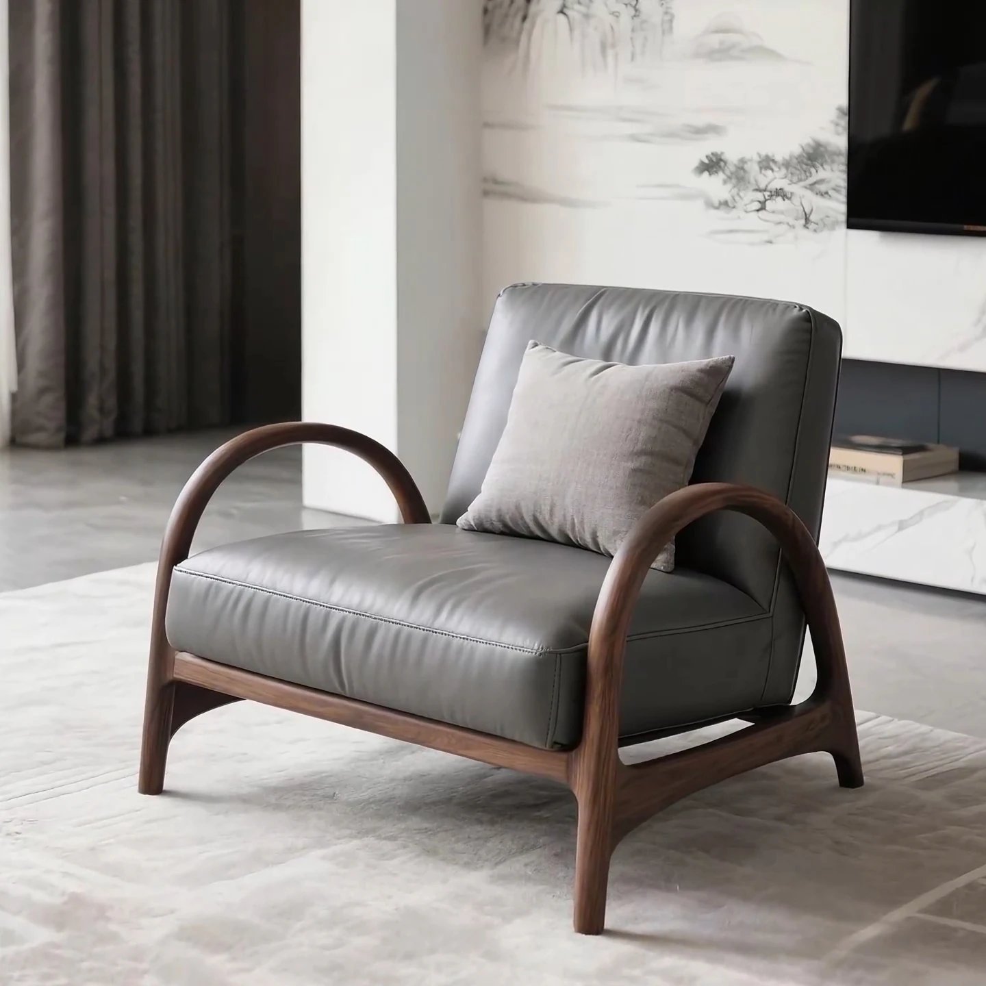 Luxurious Black Walnut Leather Armchair - Solid Wood Single Sofa Chair for Elegant Study or Tea Room, Comfortable Recliner for Relaxation