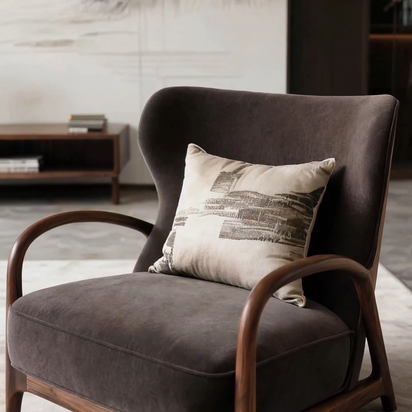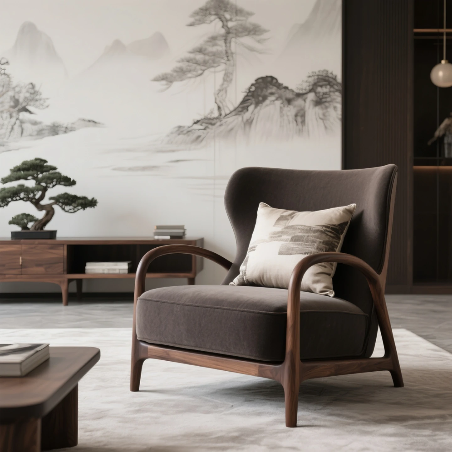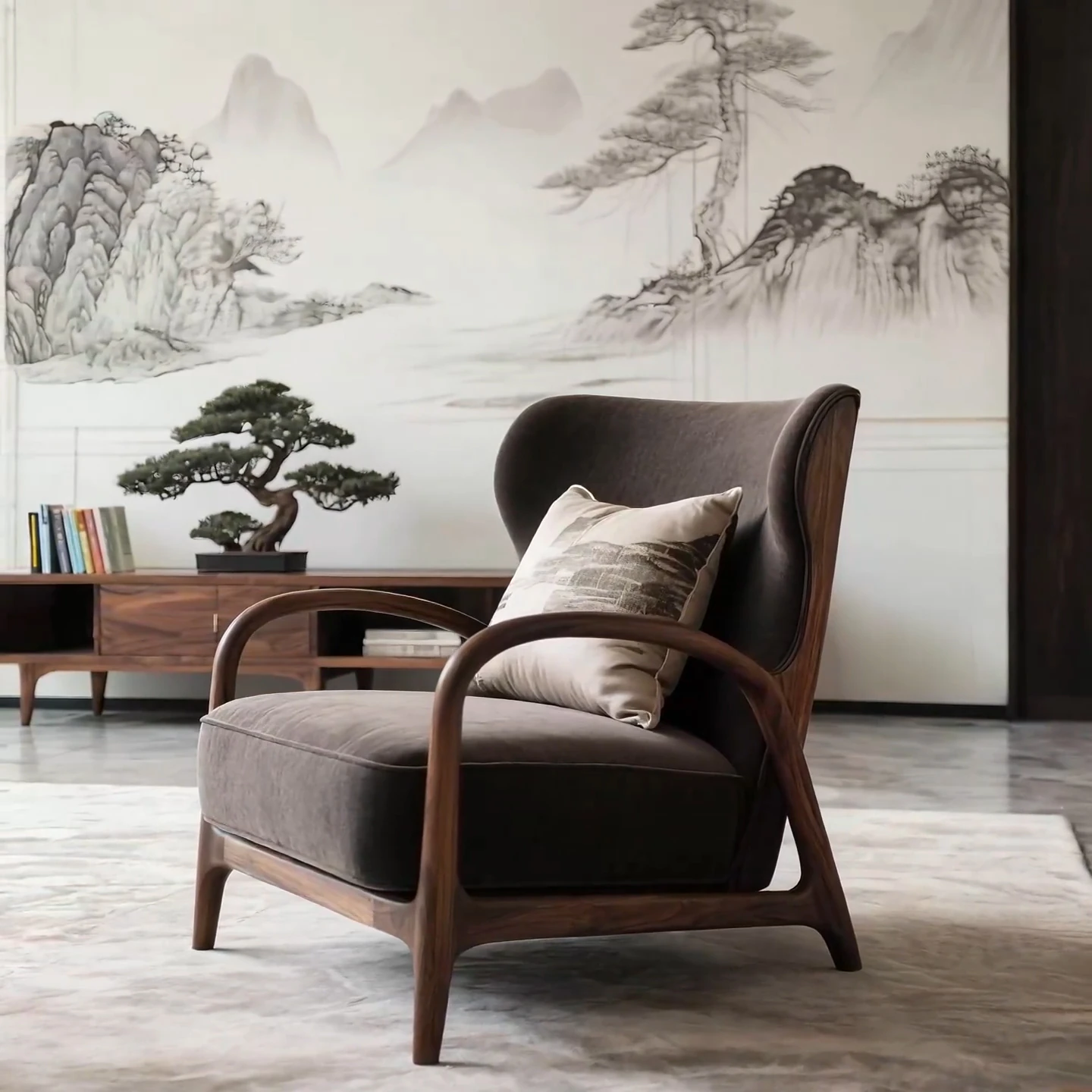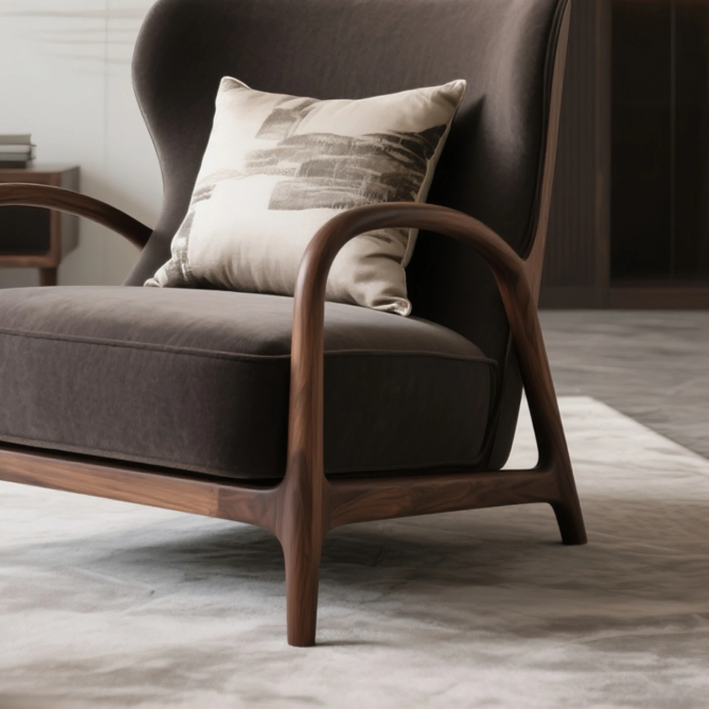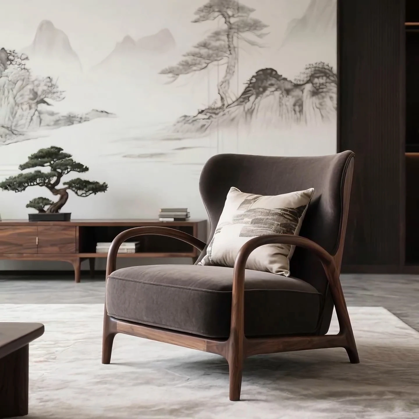 Luxury Black Walnut Leather Lounge Chair - Solid Wood Single Sofa for Home Office and Tea Room, Comfortable Recliner for Relaxation