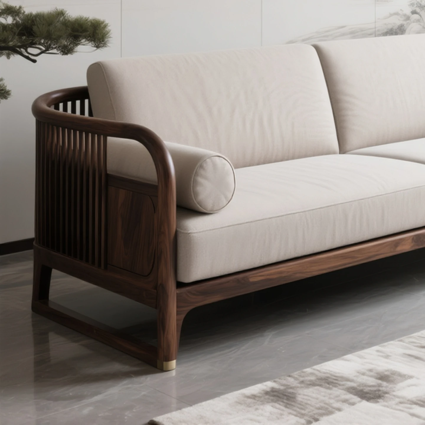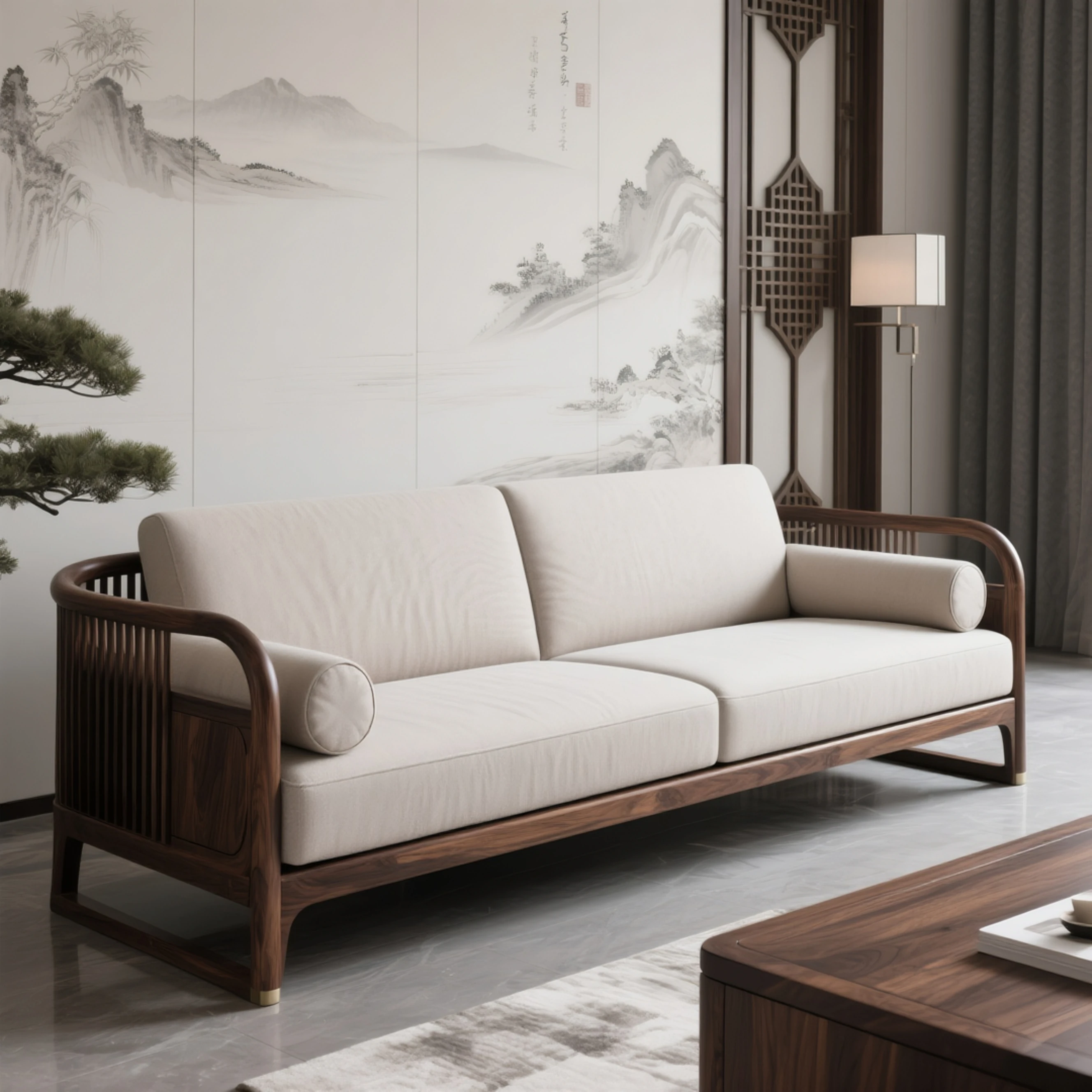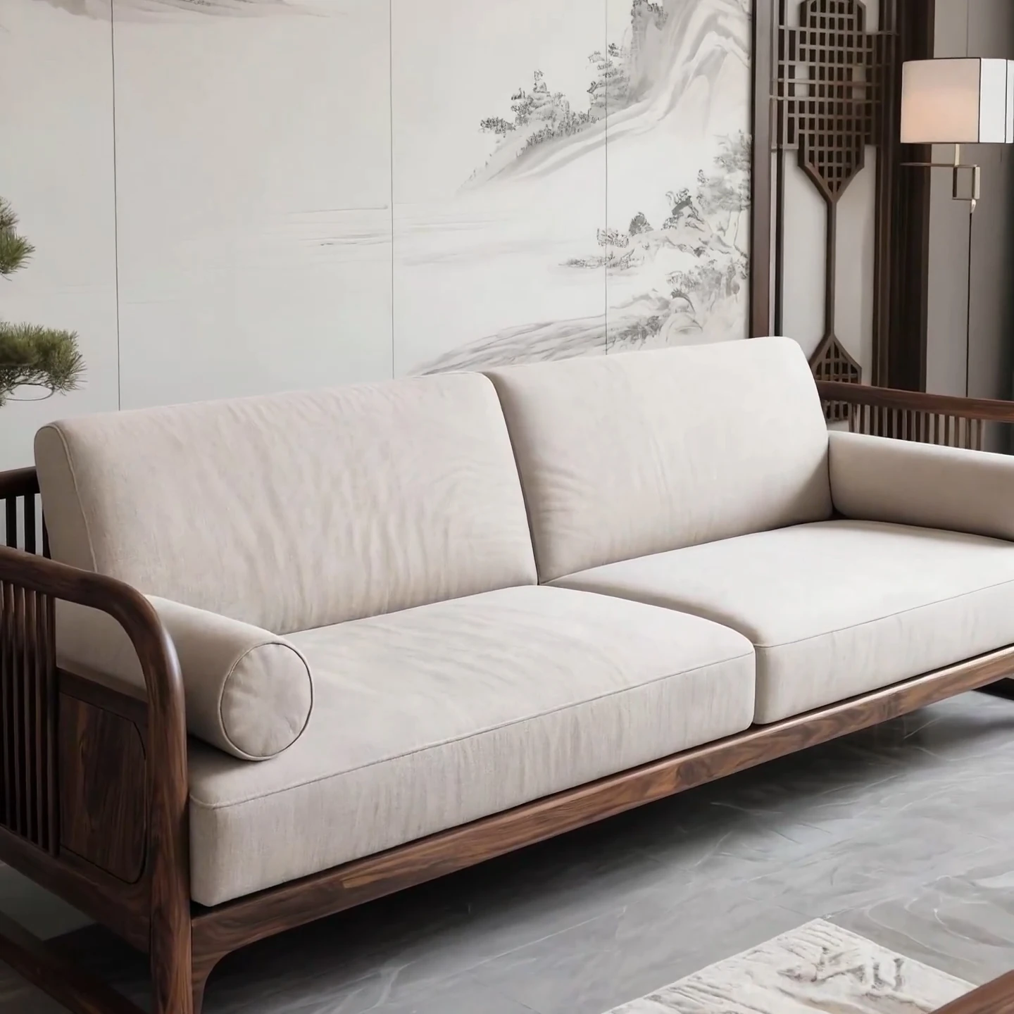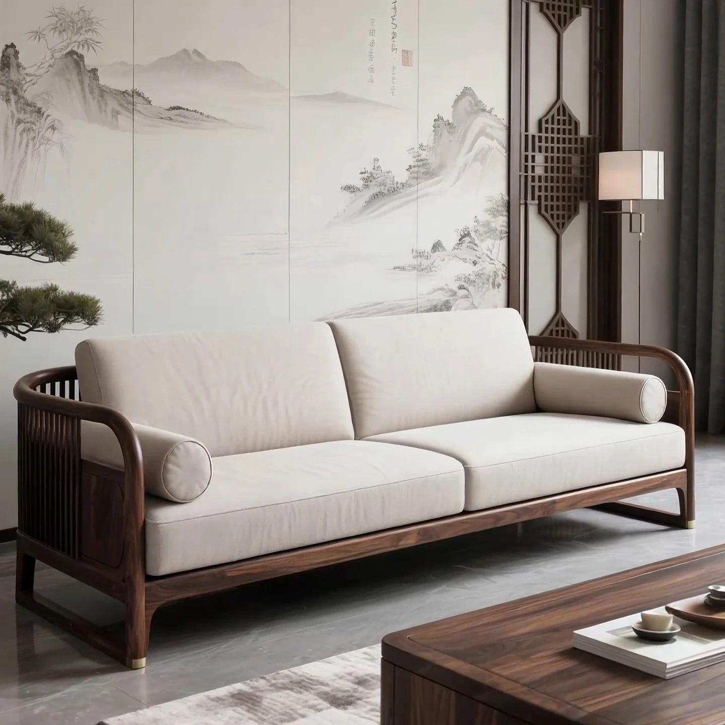 Luxury Modern Chinese-style Solid Black Walnut Sofa Set for Spacious North American Villas - Elegant Fabric Sofa for Stylish Living Rooms