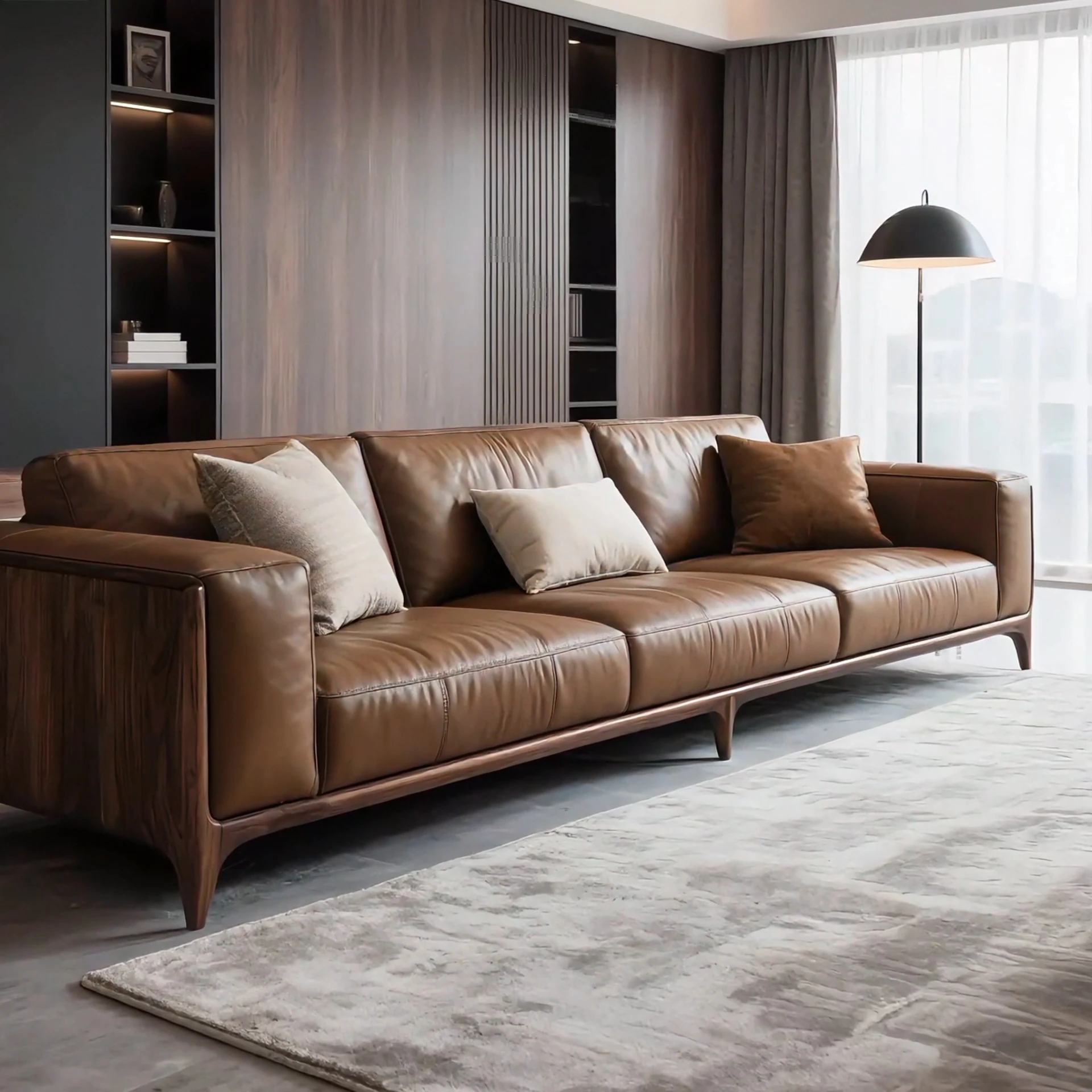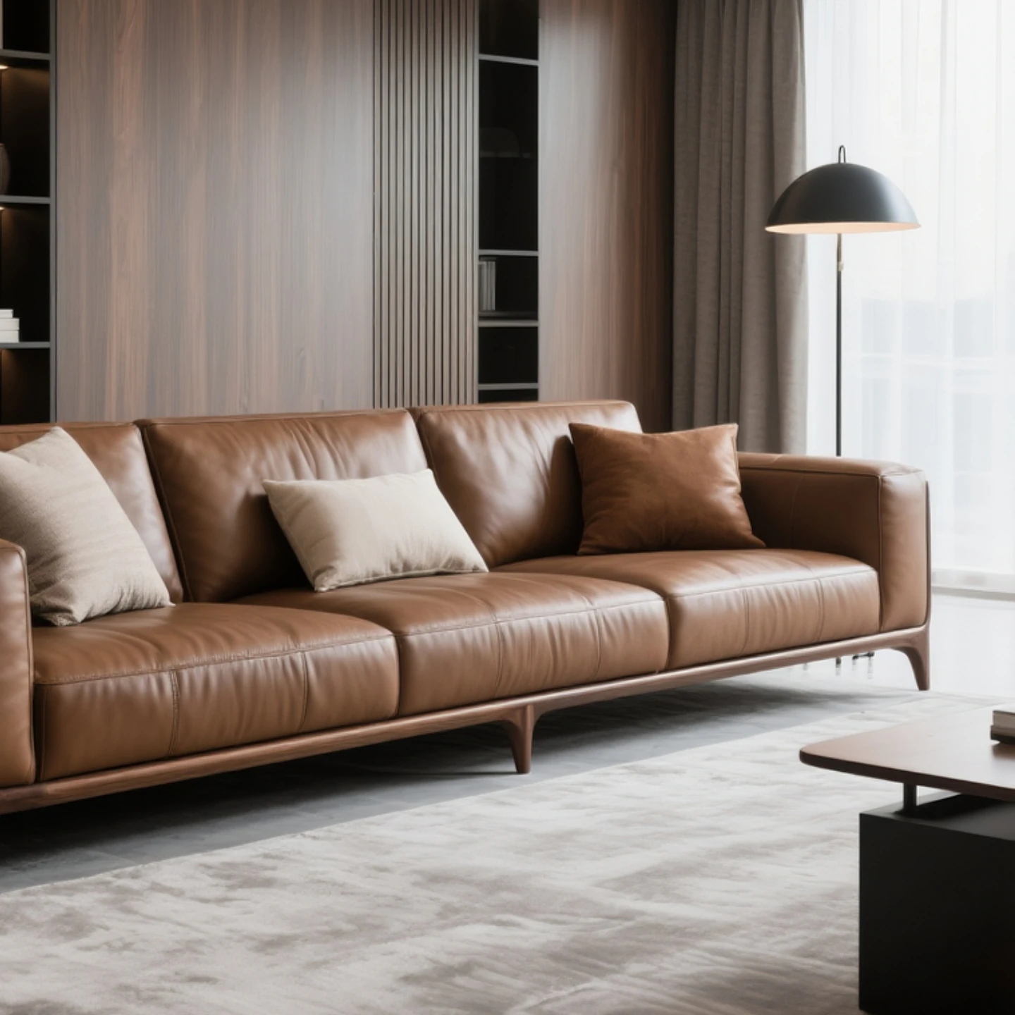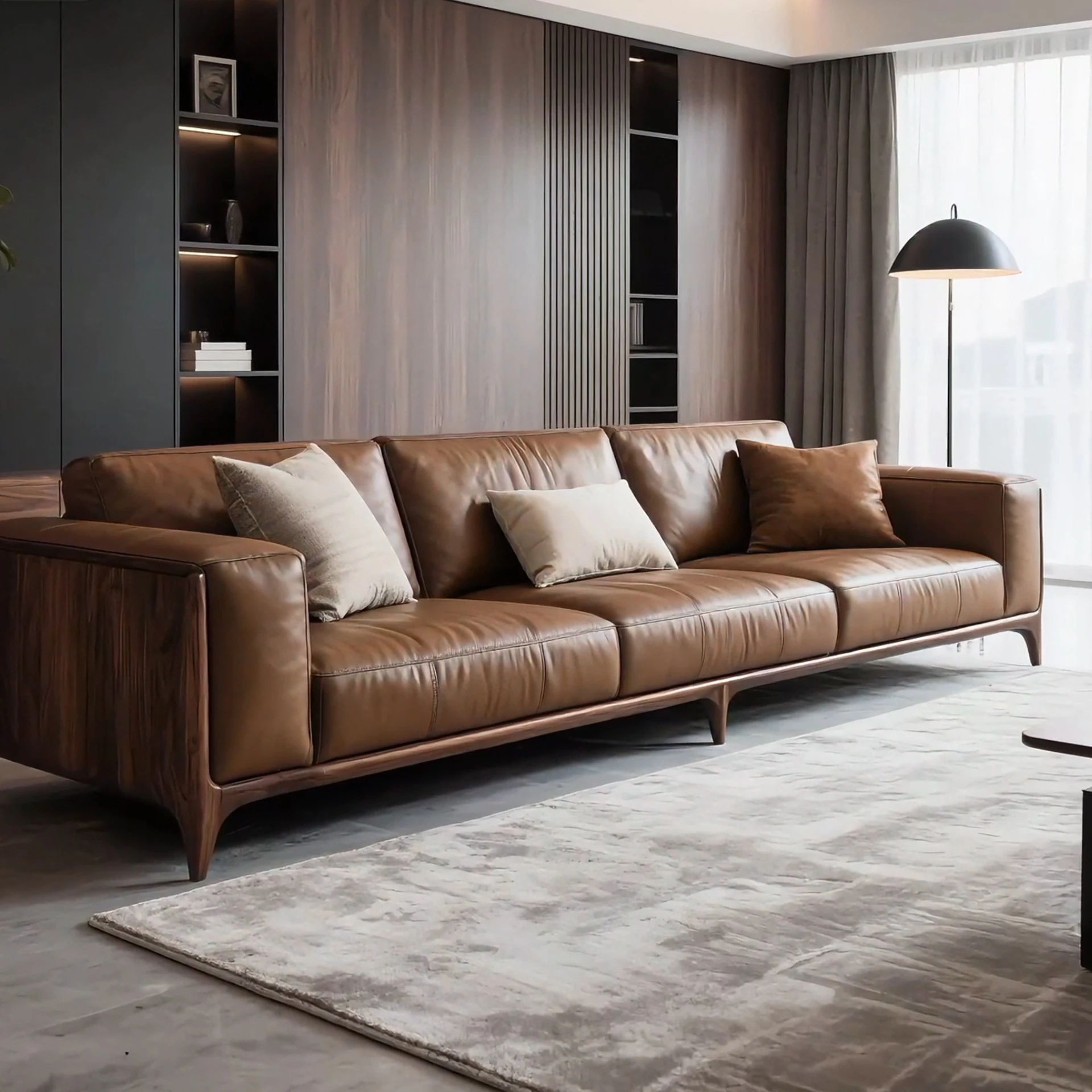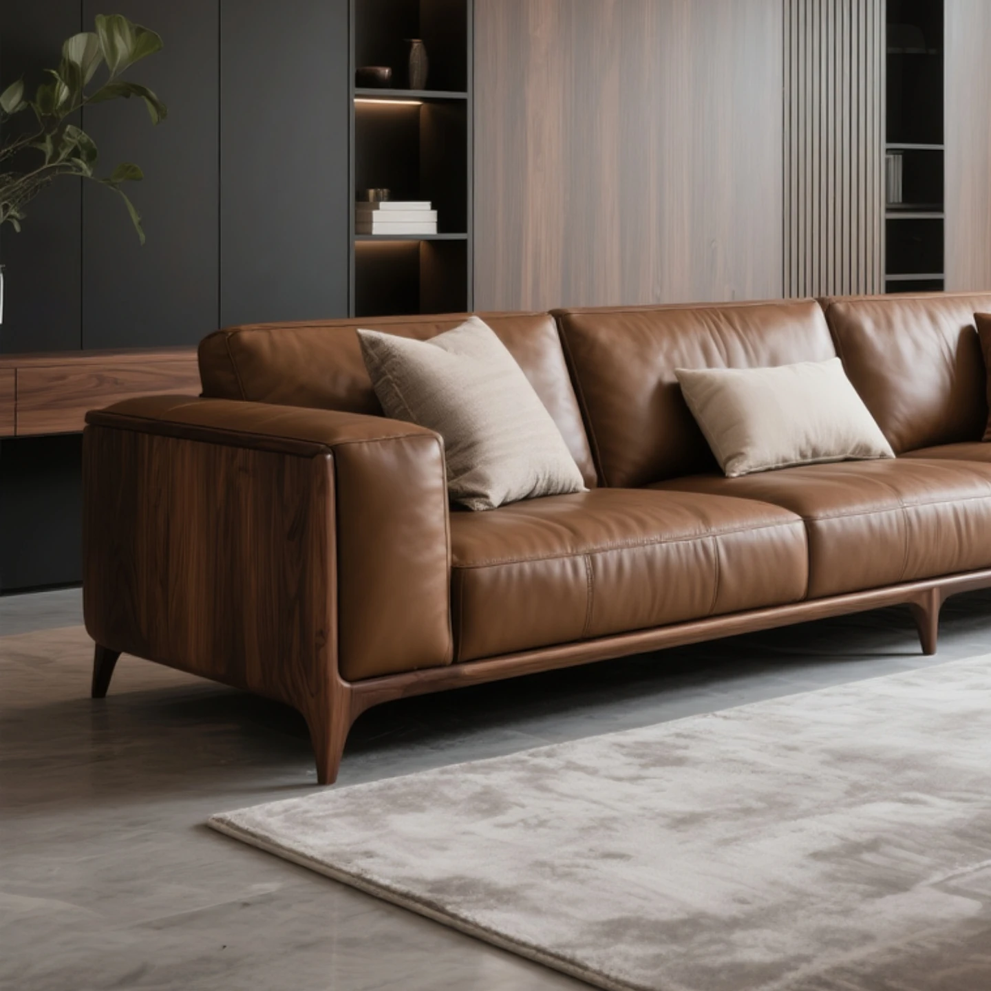Modern Chinese Black Walnut Leather Sofa – Sleek Designer Style for Hotels, Airbnb, Offices, and Luxury Showroom Furniture