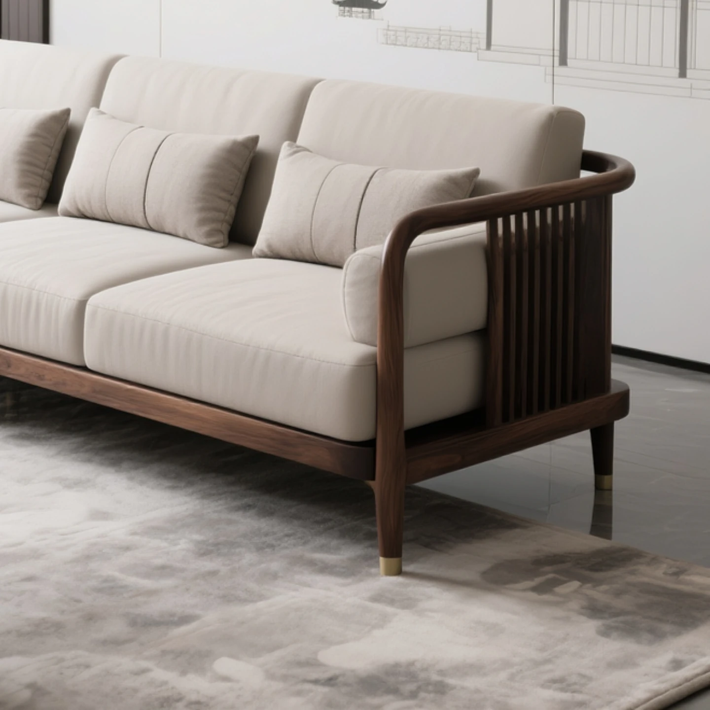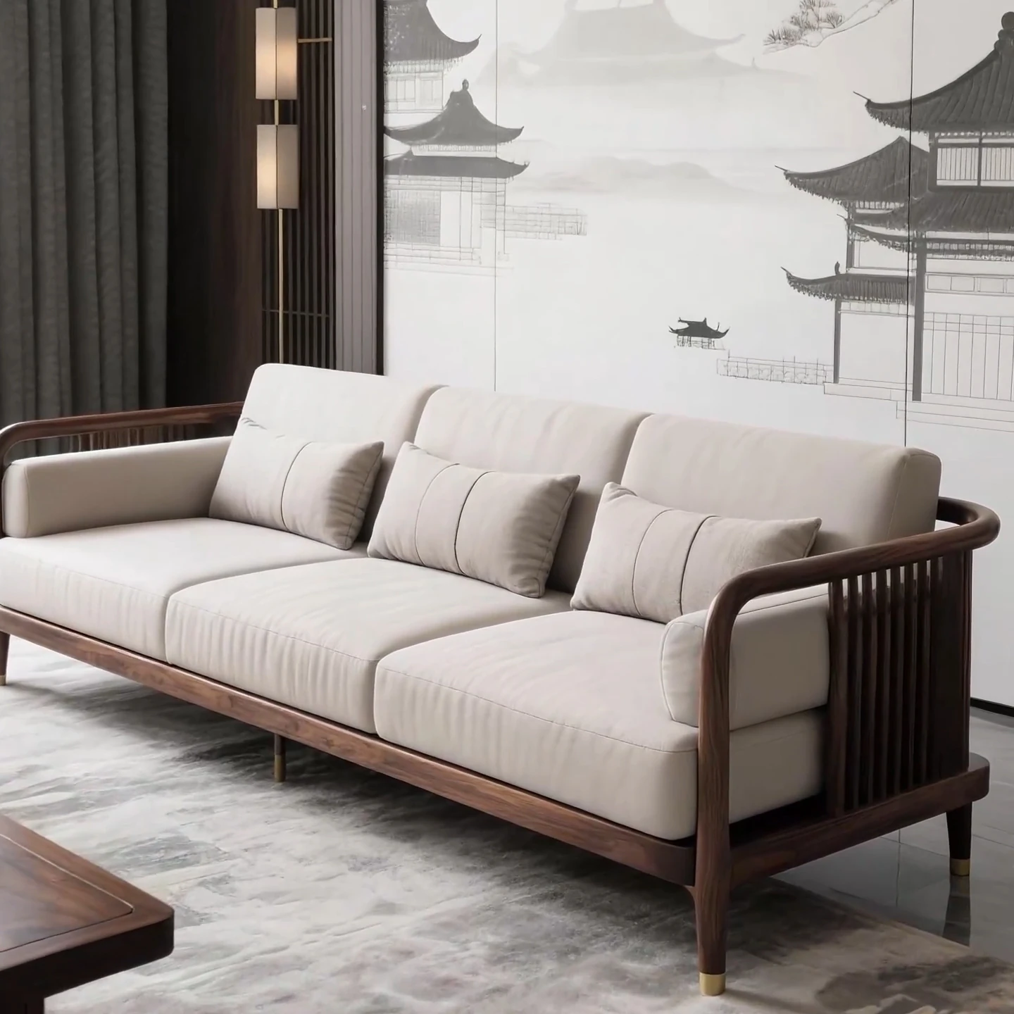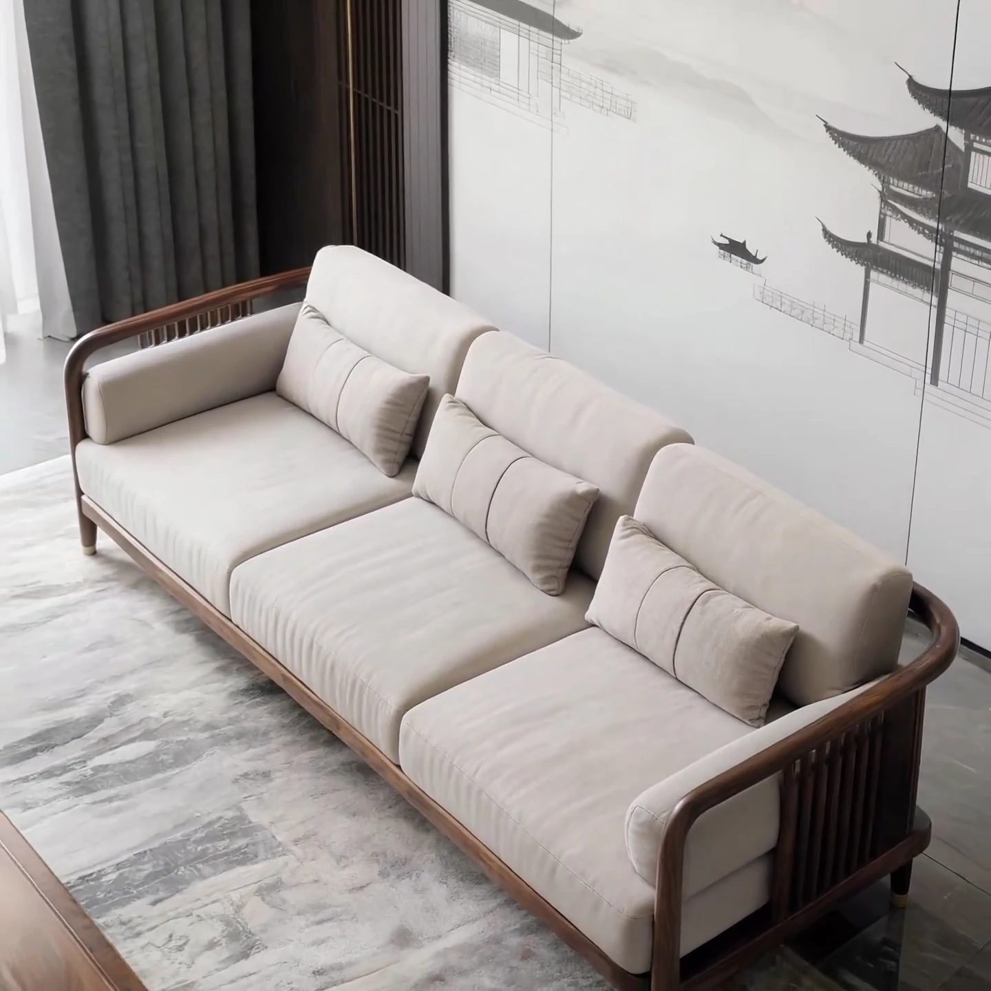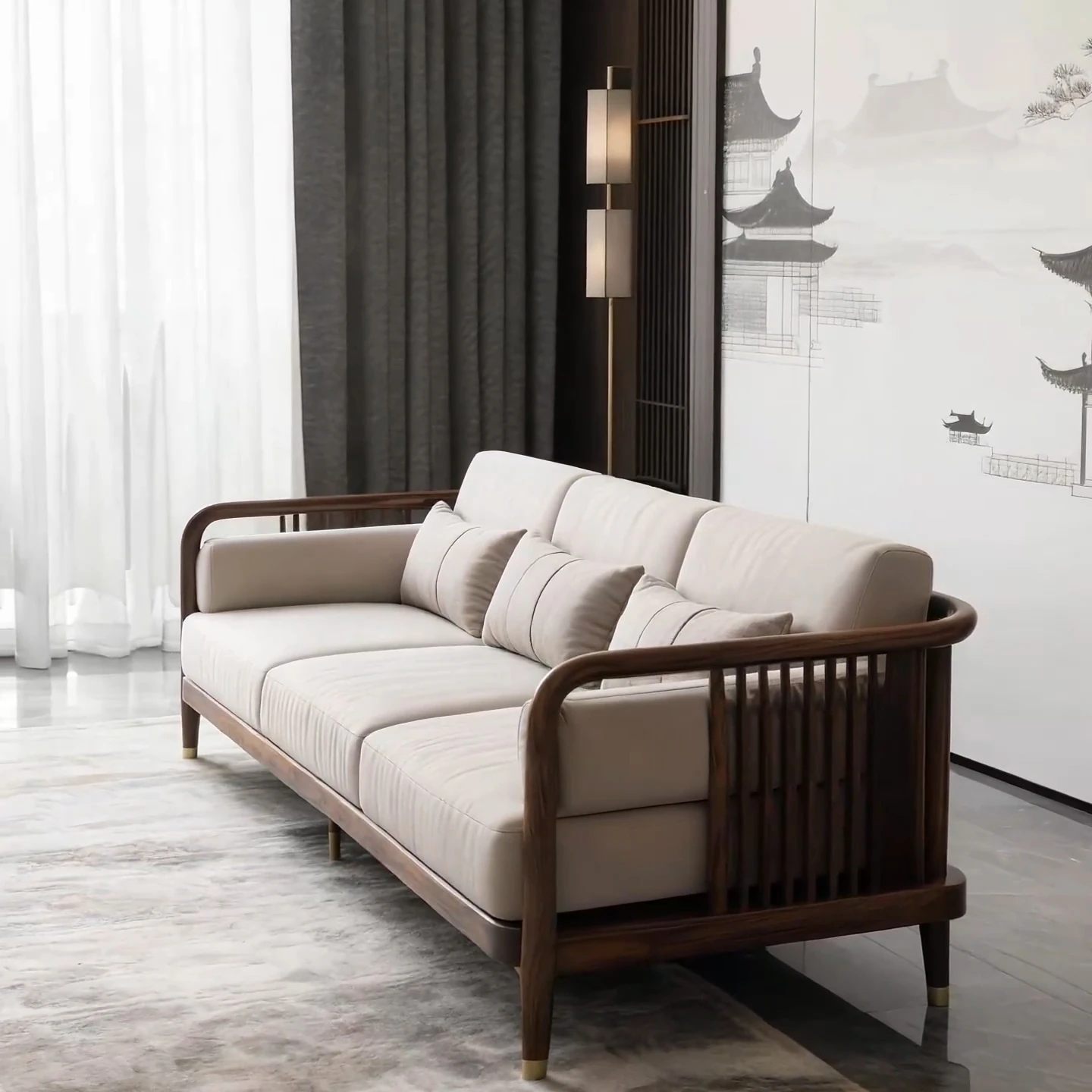 Modern Chinese Style North American Black Walnut Straight Sofa - Embrace Song Dynasty Aesthetics and Zen Elegance for Your Villa with Wabi-Sabi Inspired Furniture. Perfect for Show Homes!