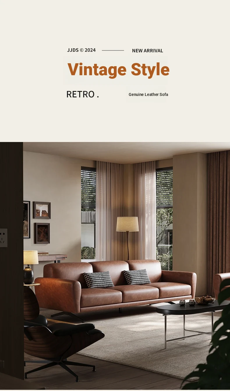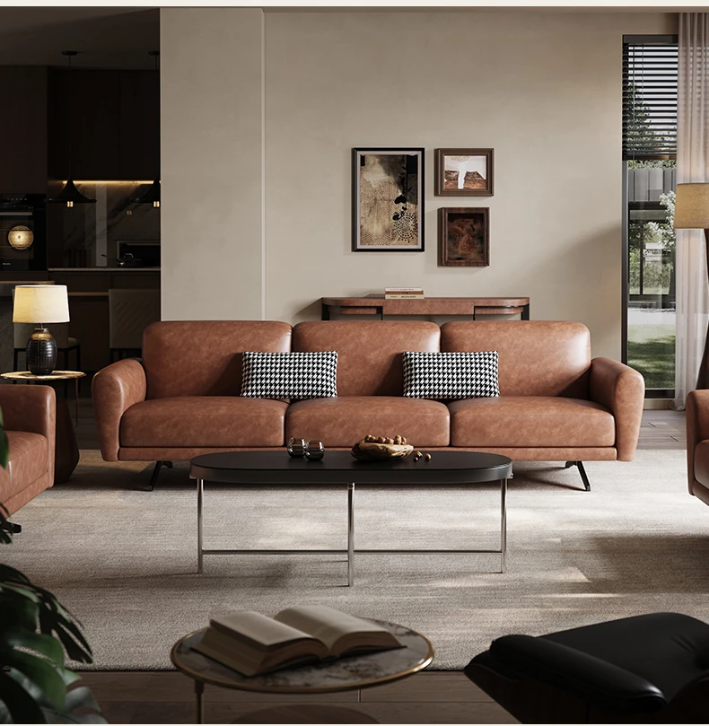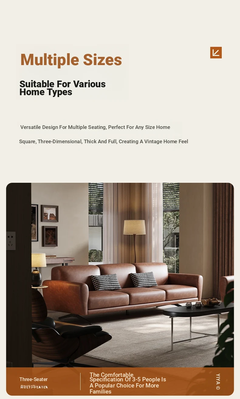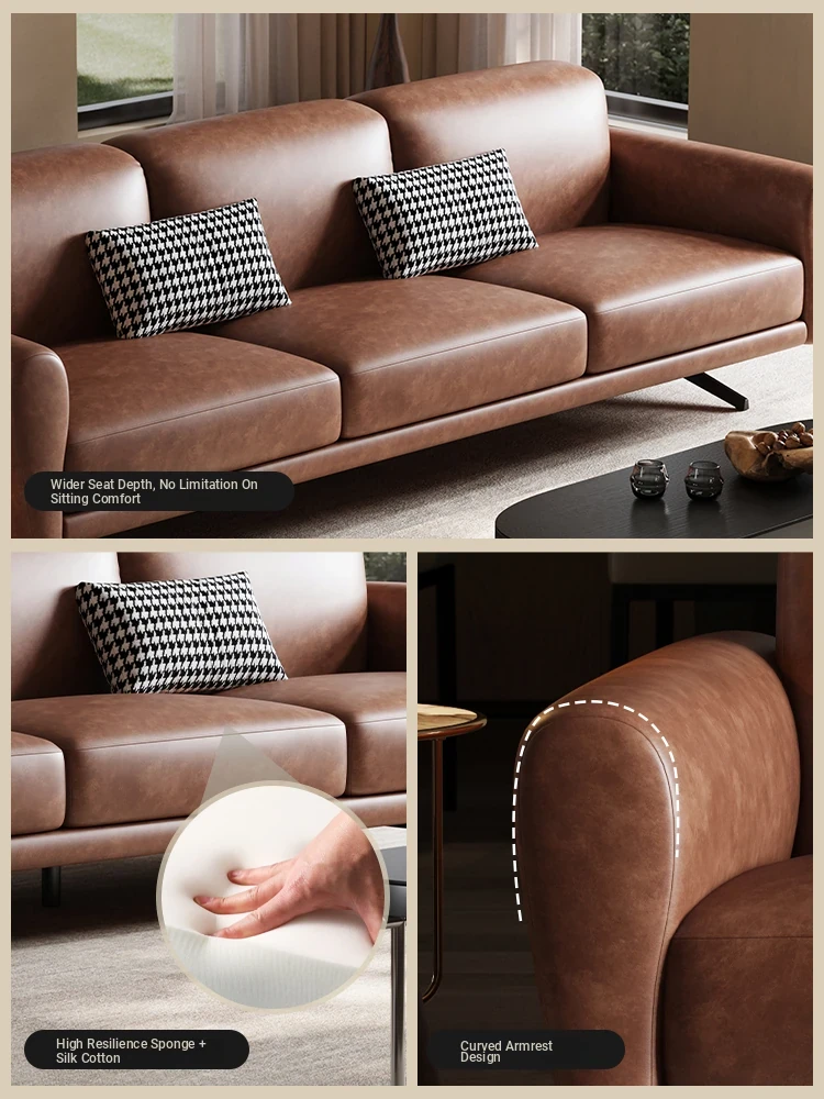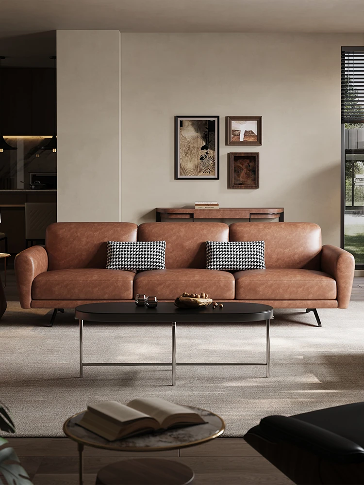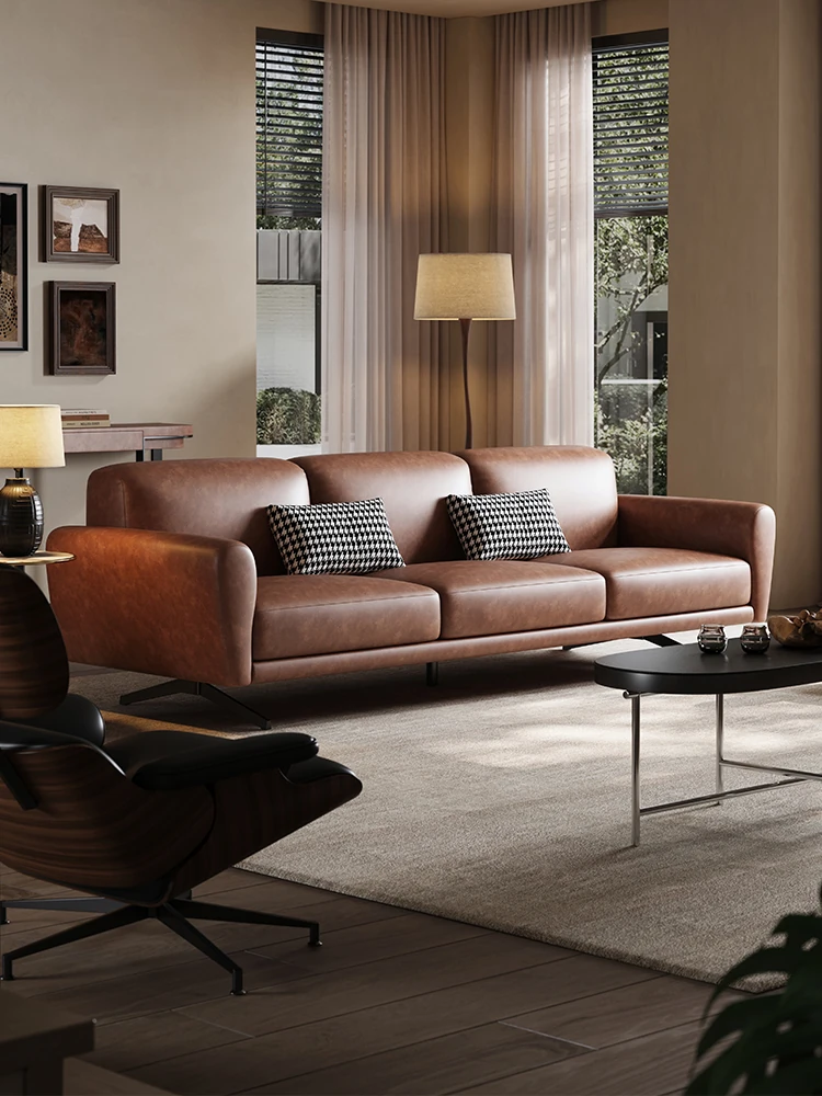 Modern Minimalist Retro Genuine Leather Sofa for Small Spaces - Three-Seat Top Grain Cowhide Sofa with Straight Lines, Italian Design for Elegant Living Room Décor.