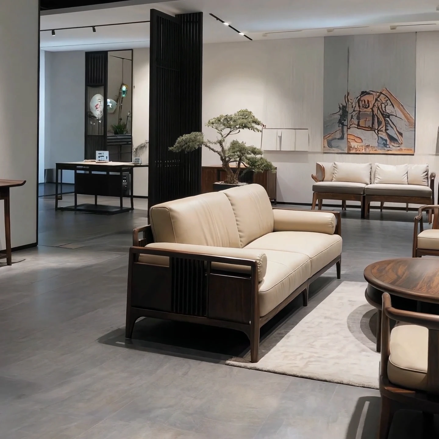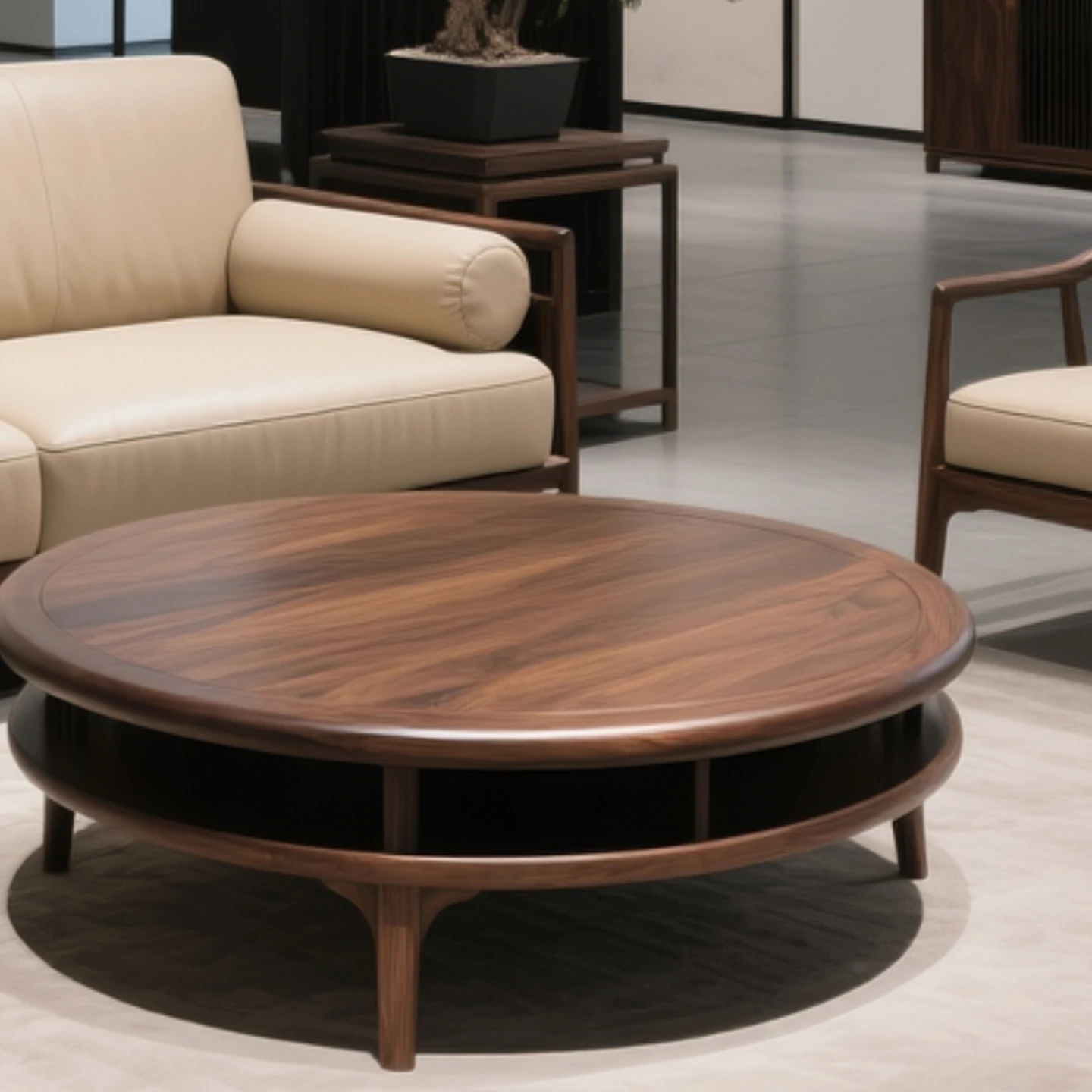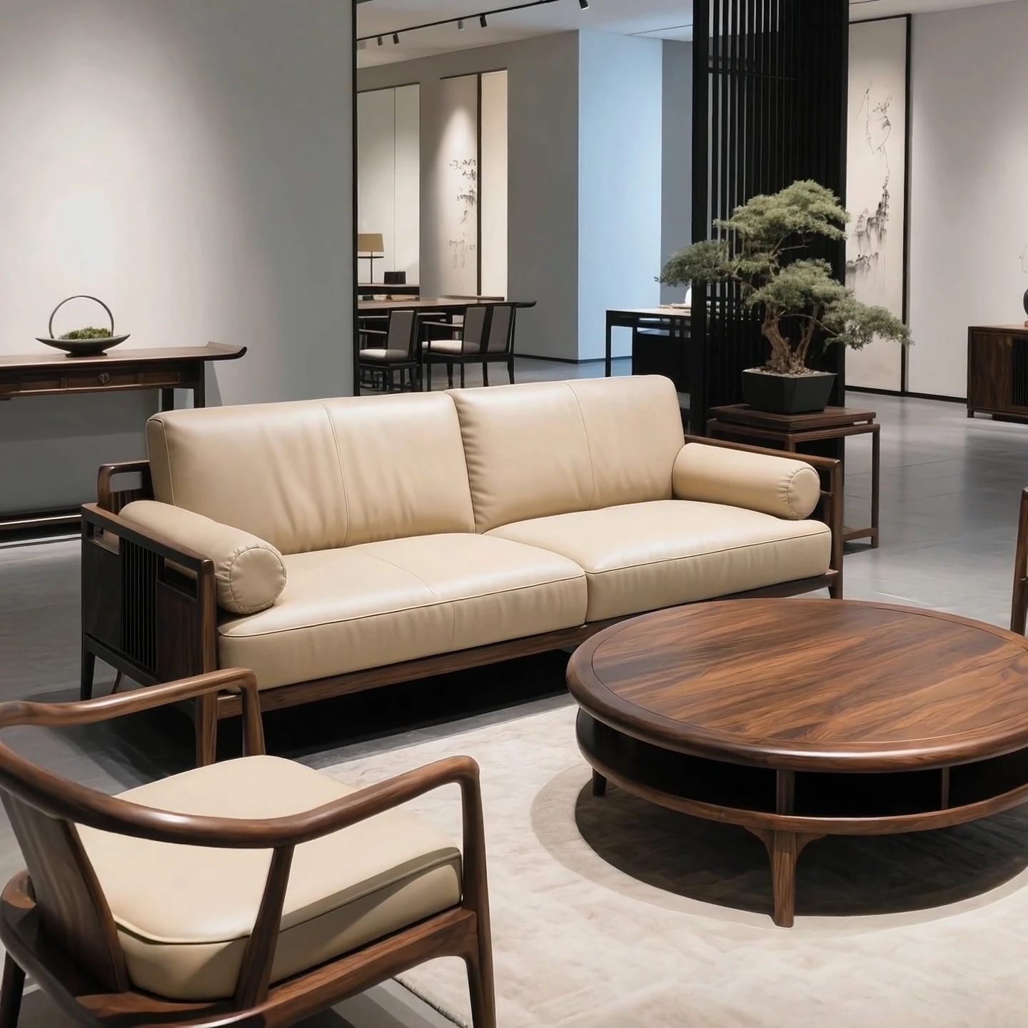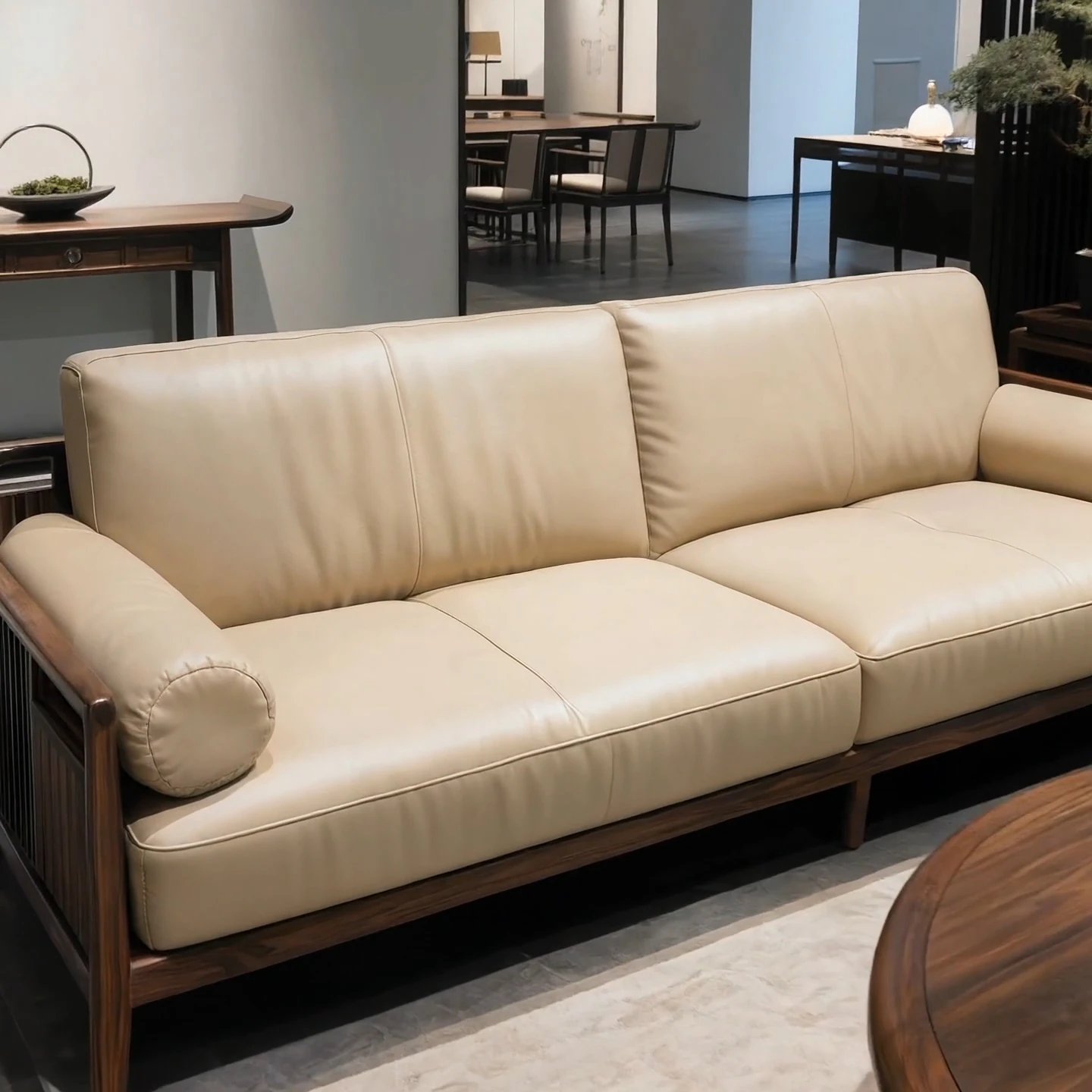 Modern New Chinese Style Black Walnut Solid Wood Sofa Set - Embrace Wabi-Sabi Aesthetics for Your Spacious Home with Timeless Elegance.
