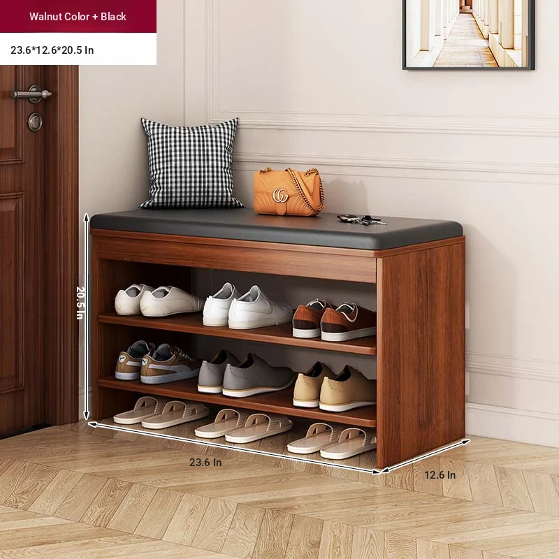 [Thickened load-bearing model] can sit + can store shoes | Three-layer Basics 23.62in walnut color + black leather cushion
