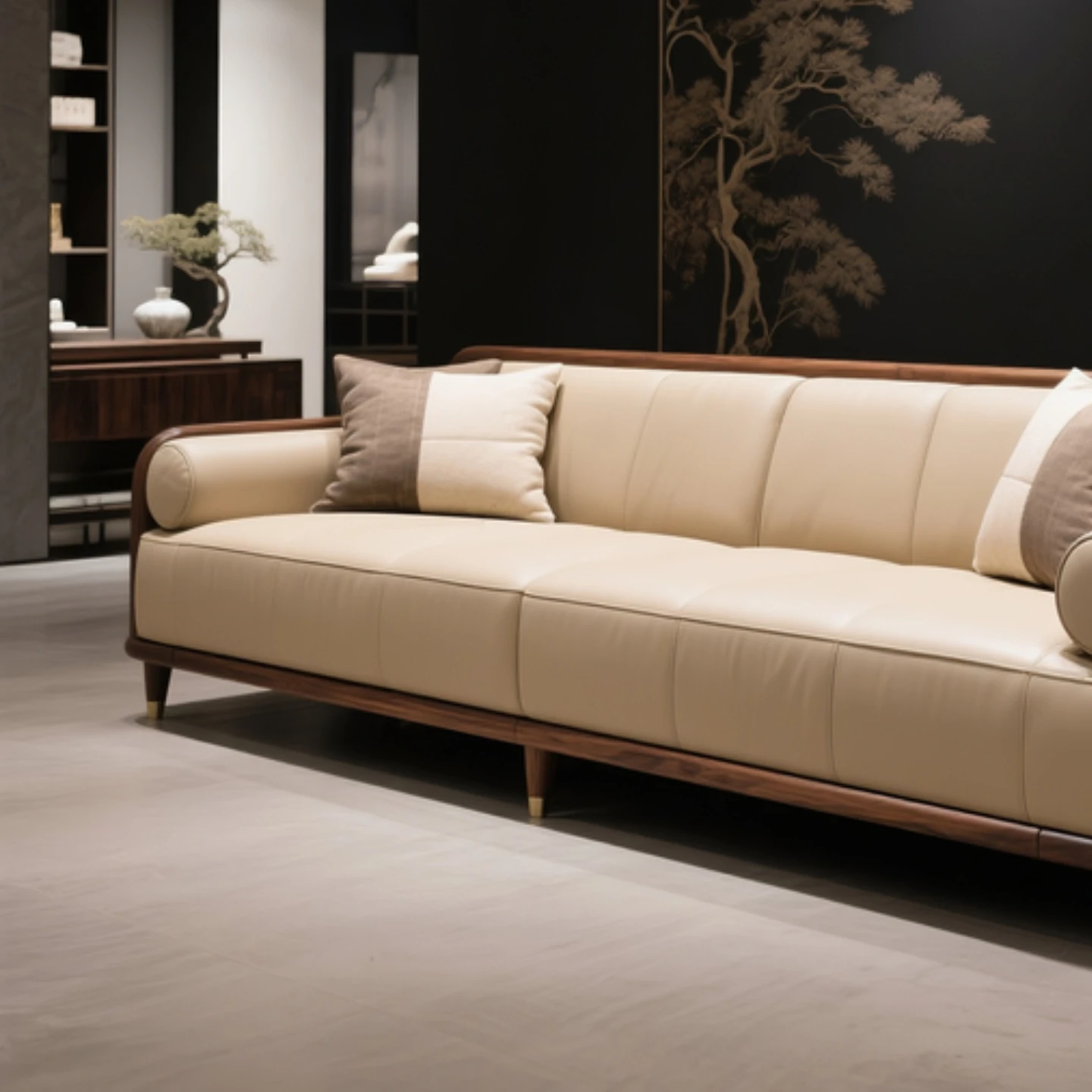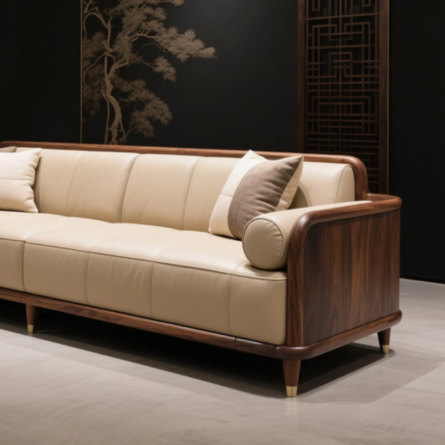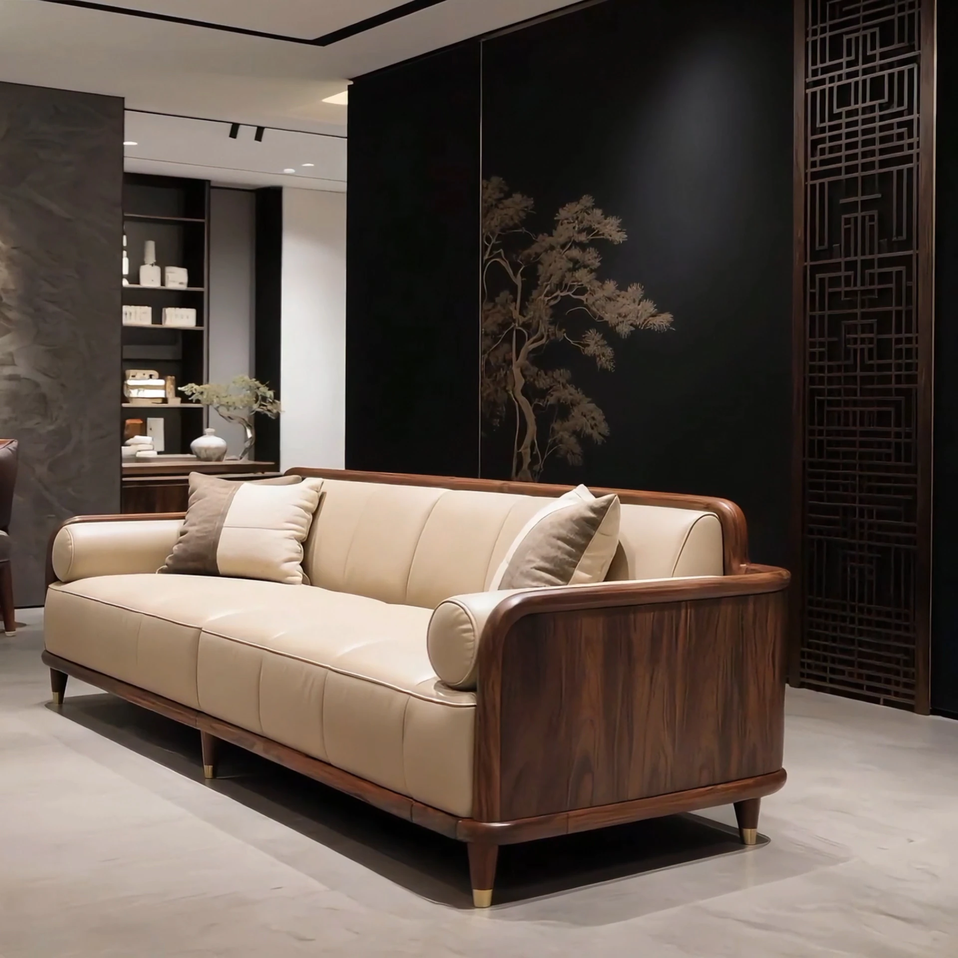 New Chinese Style Black Walnut Straight Sofa - Song Aesthetic for Office, Zen Villa, and Wabi-Sabi Inspired Model Home Furniture