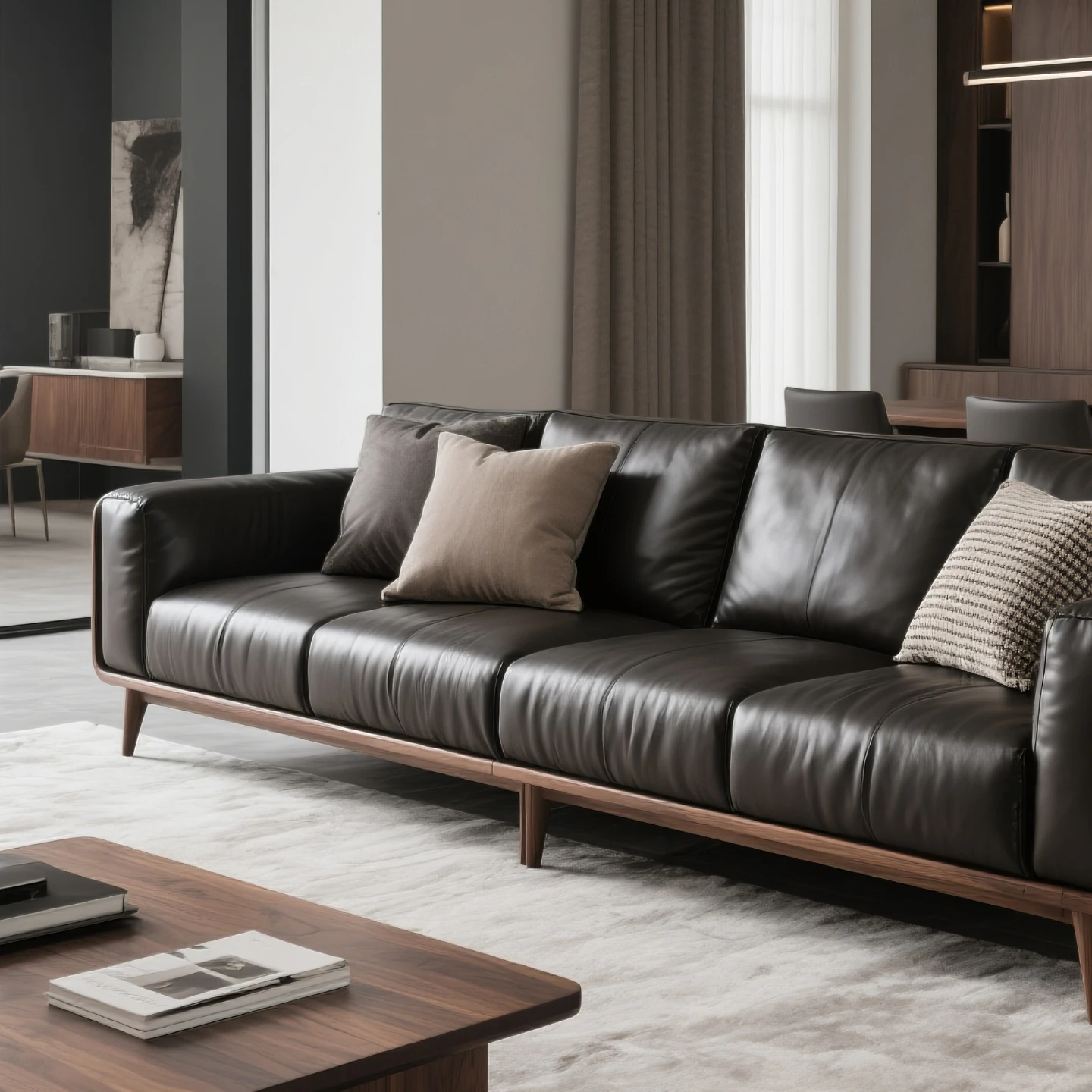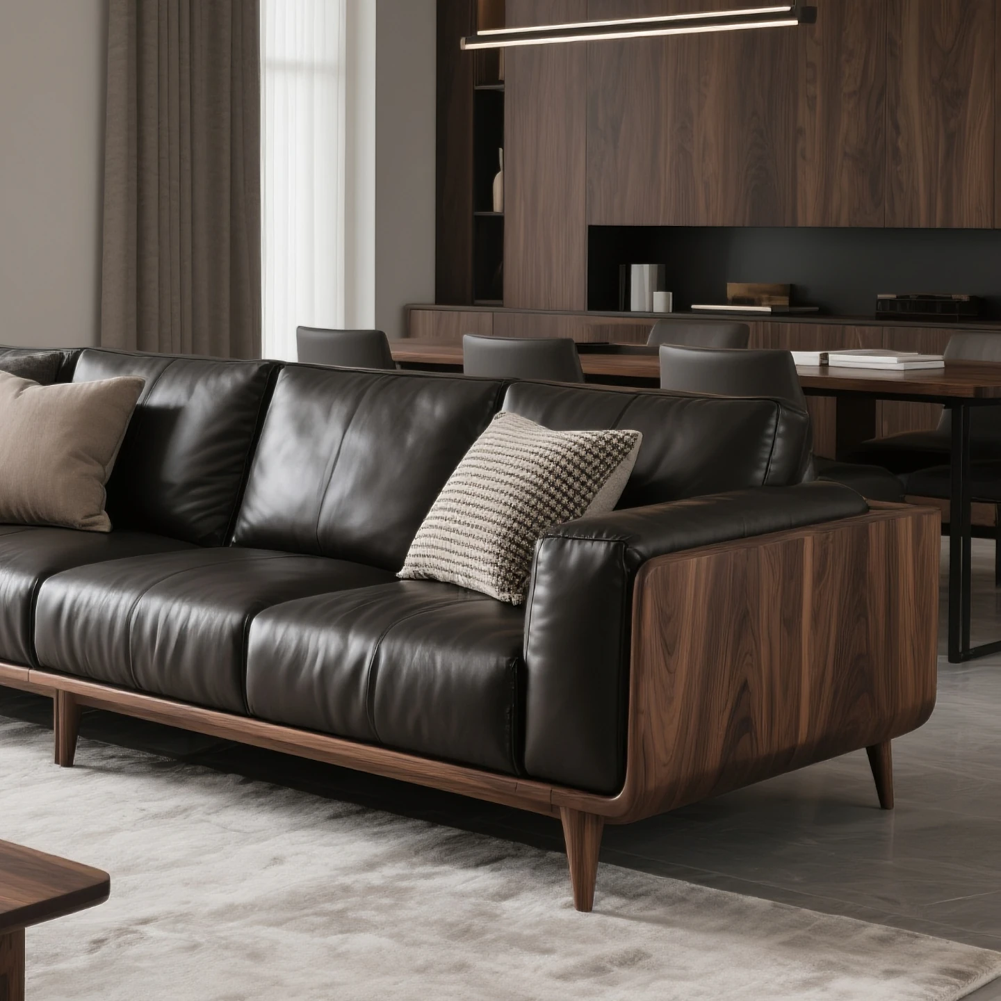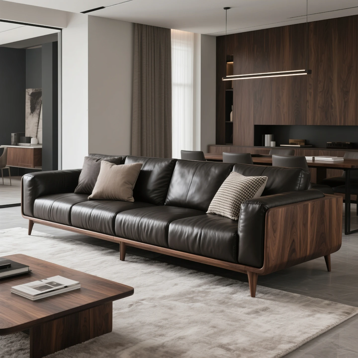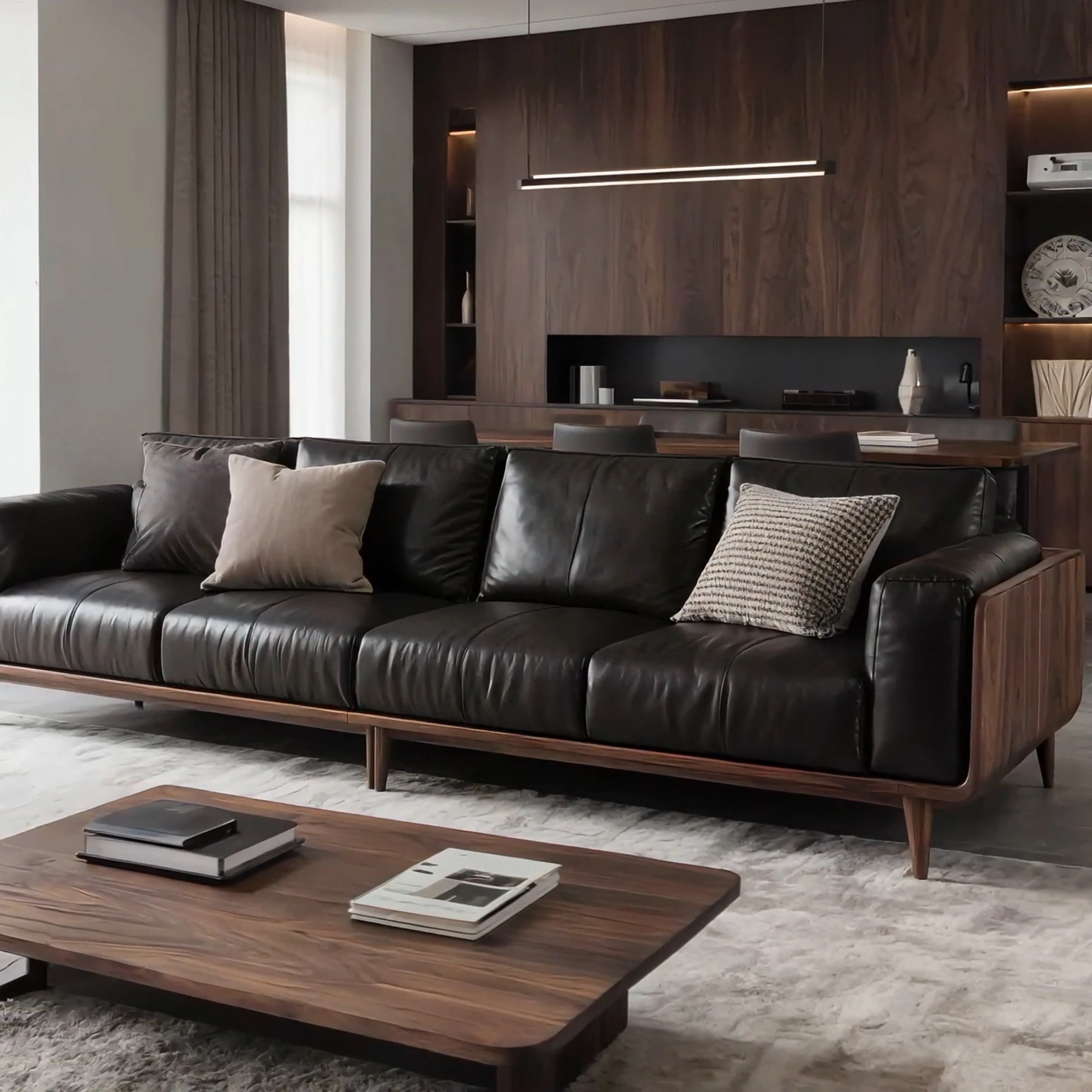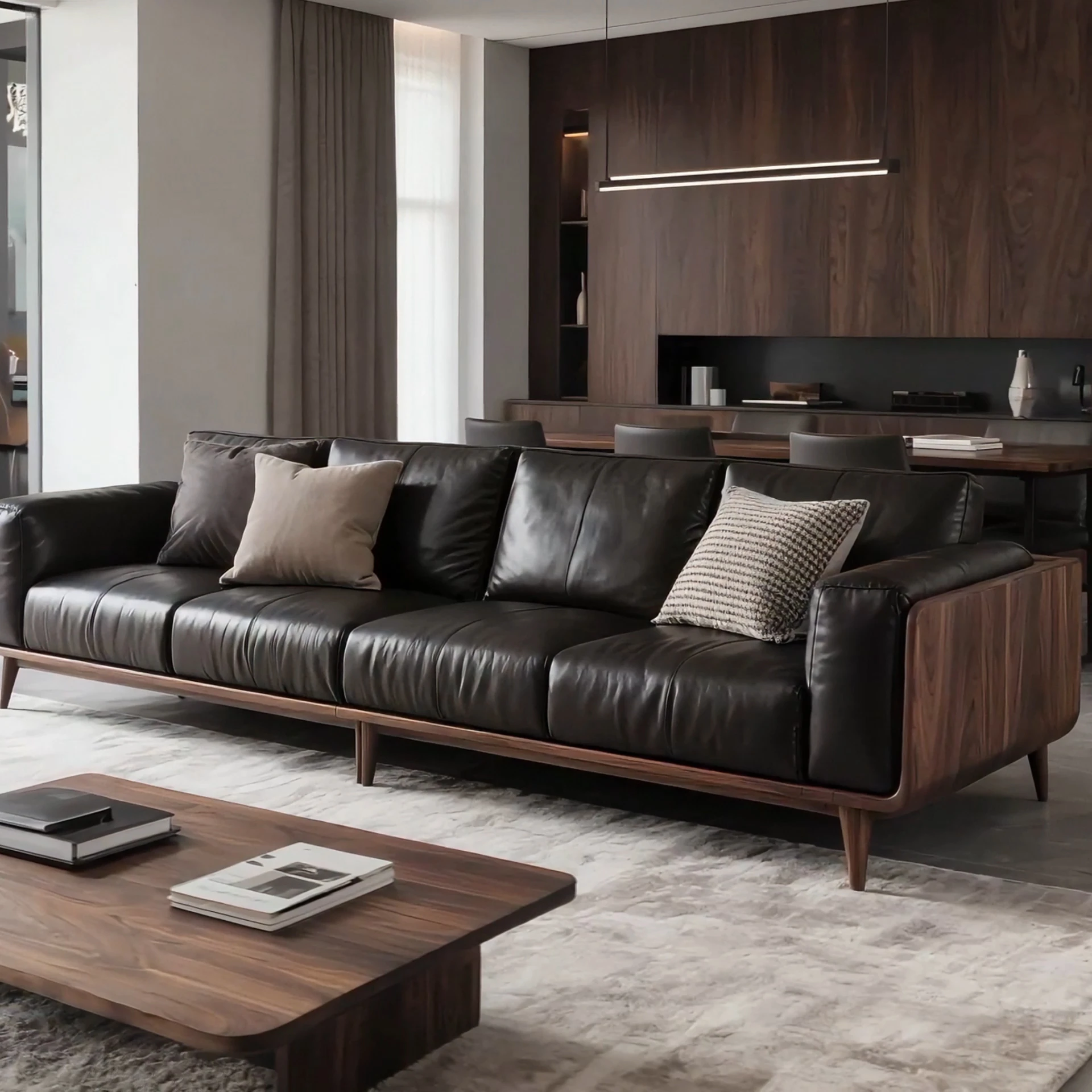 New Chinese Style North American Black Walnut Solid Wood Straight Sofa - Italian Modern Genuine Leather Light Luxury High-End Model Room Furniture