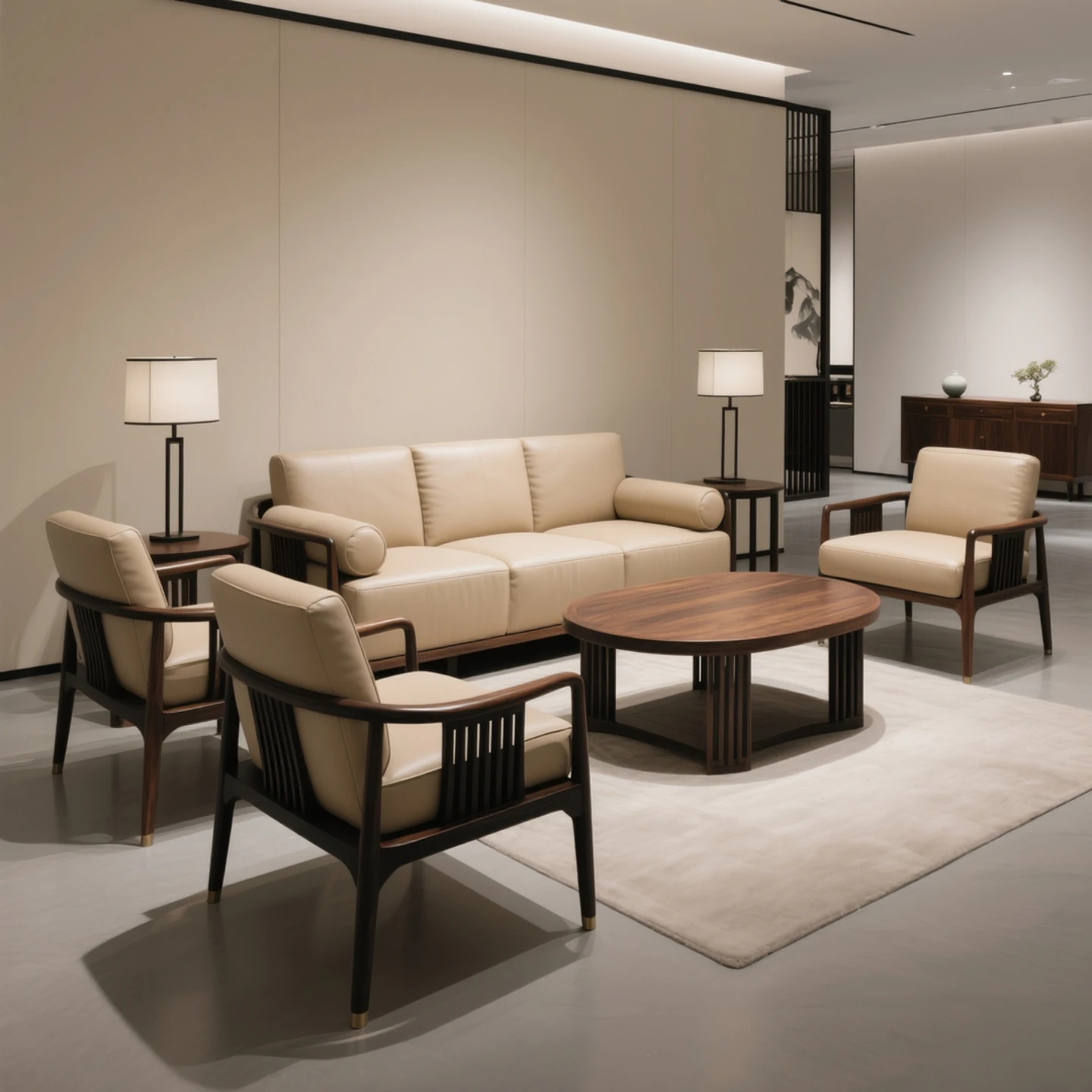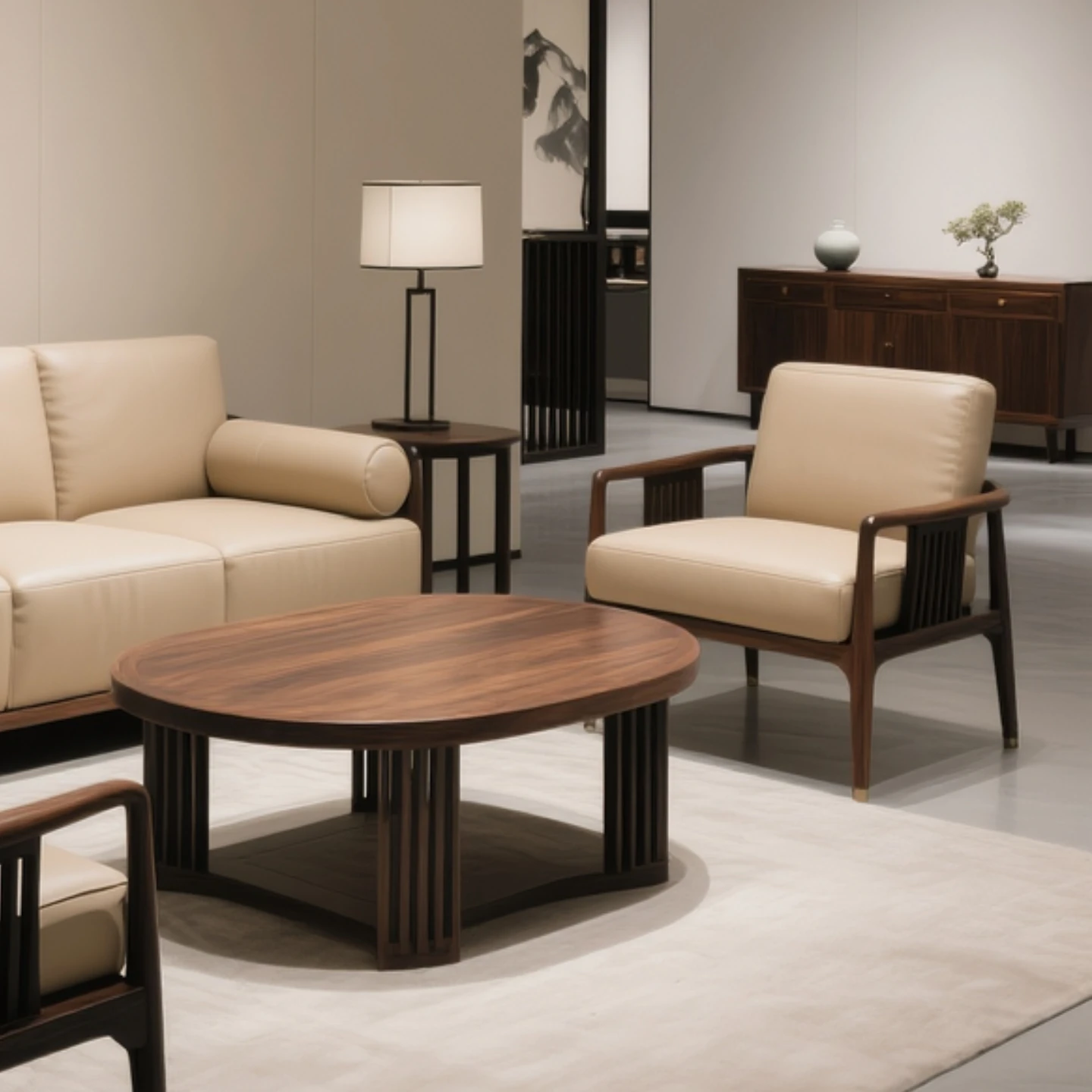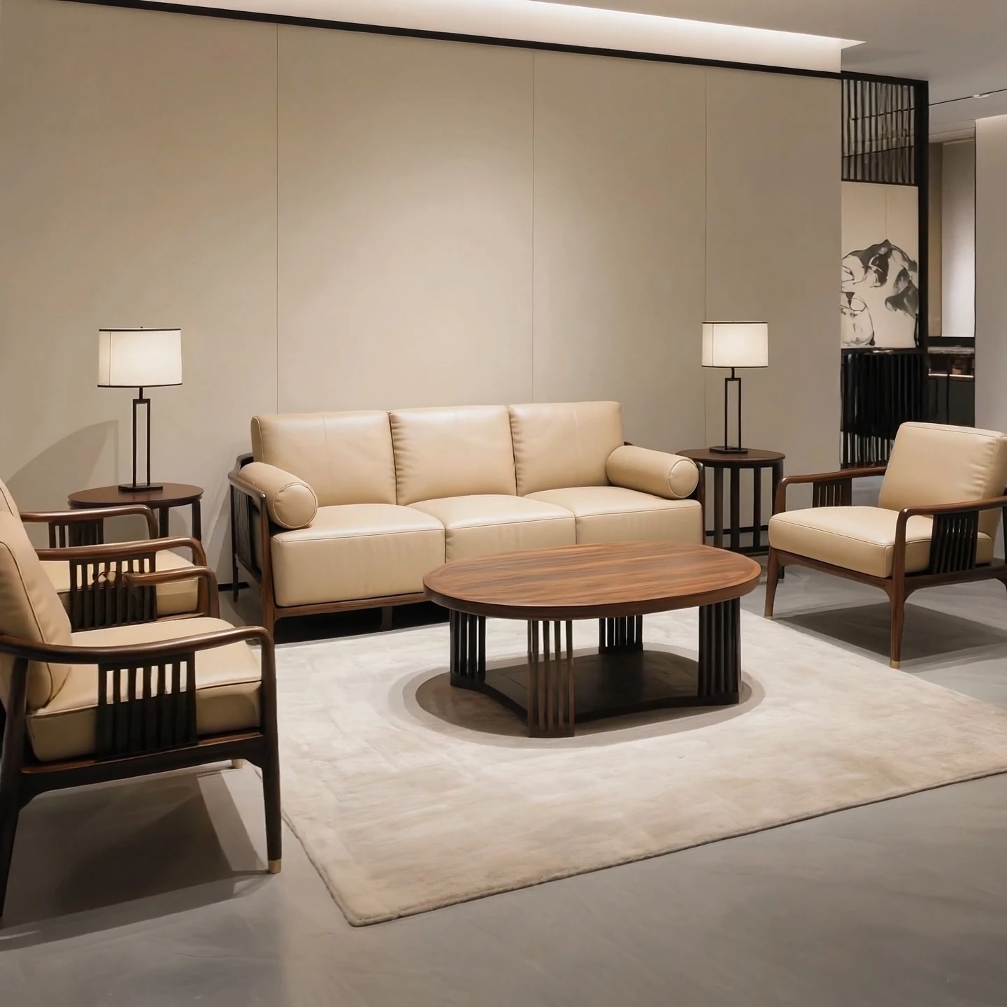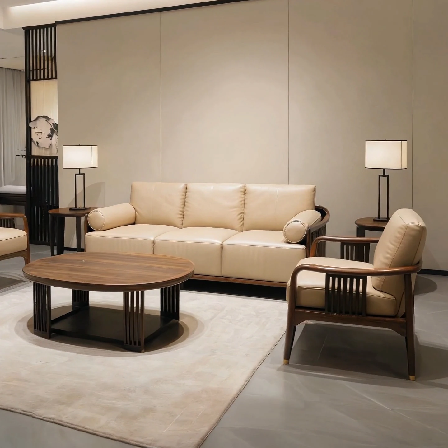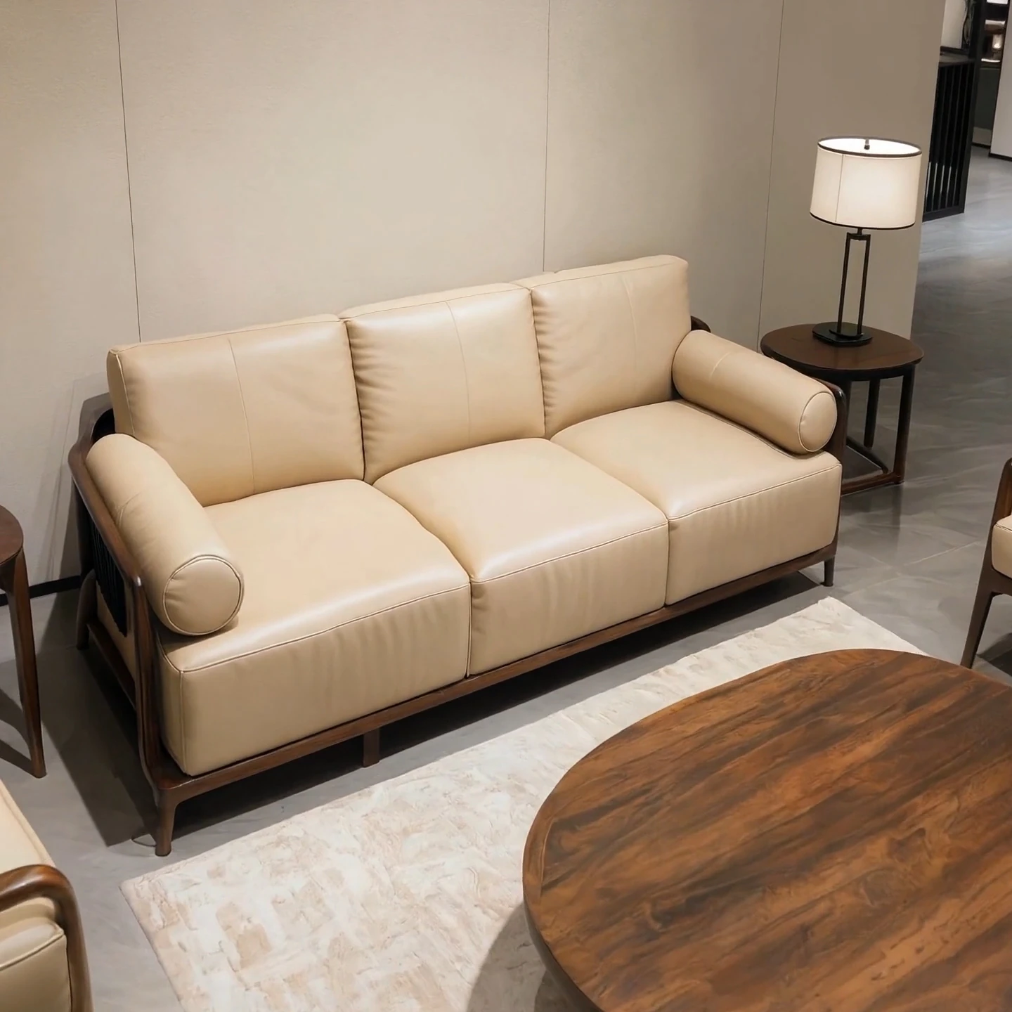 Zen-inspired Modern Solid Wood Sofa Set in Black Walnut - Elegant Leather Sofa for Open Concept Living Spaces, Perfect for Contemporary Aesthetic Home Decor.