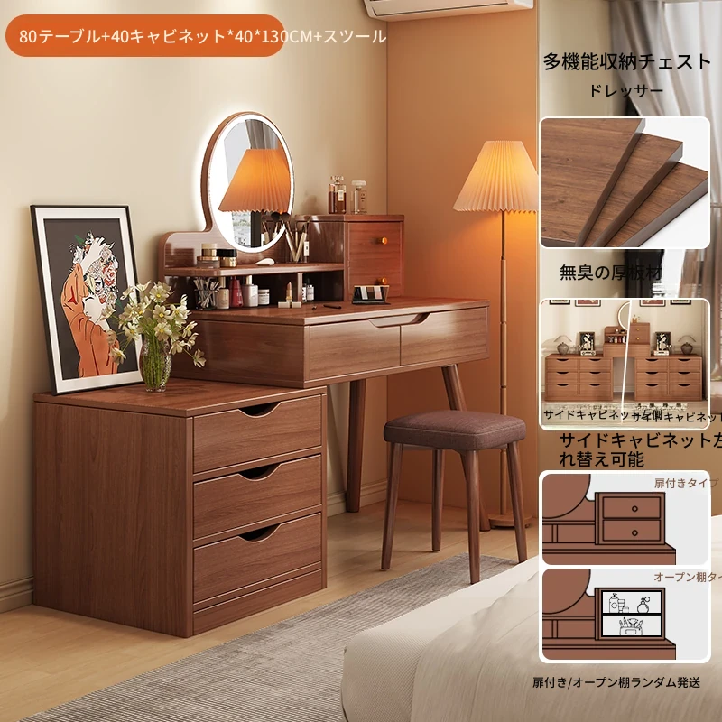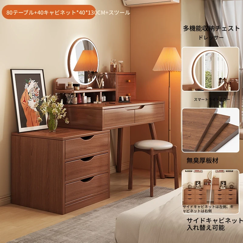 【チェストテーブル+LEDミラー+レザーウッドスツール】ウォールナット色 80-150CM