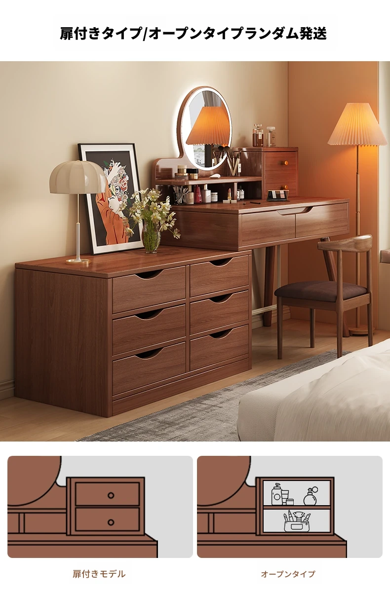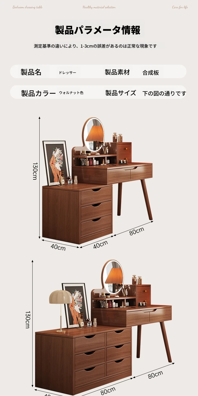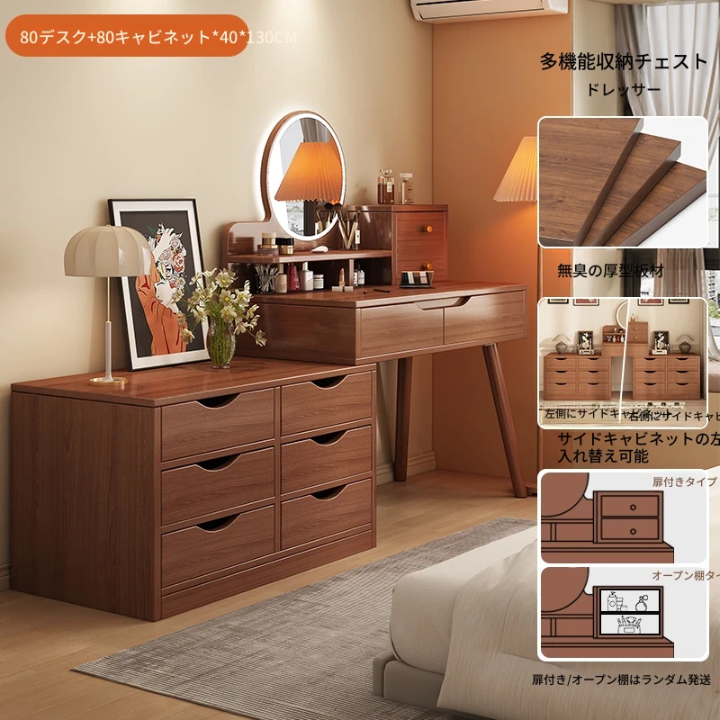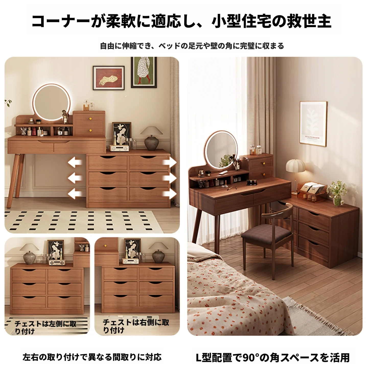 【チェストテーブル+LEDミラー】ウォールナット色 80-150CM