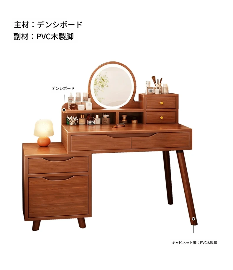 【サイドテーブル+LEDミラー+レザーウッドスツール】ウォールナット色 80-110CM