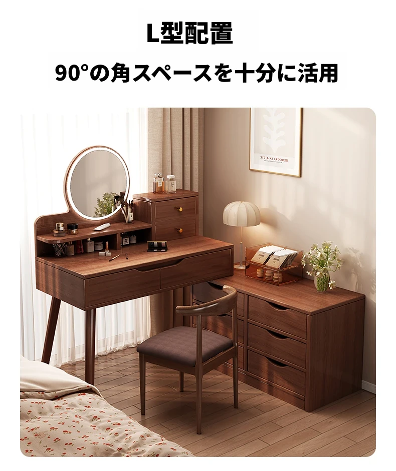 【チェストテーブル+LEDミラー+カウホーンチェア】ウォールナット色 80-150CM