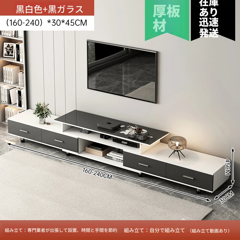 【4引き出しタイプ】伸縮(160-240)cm 黒白色+黒いガラス