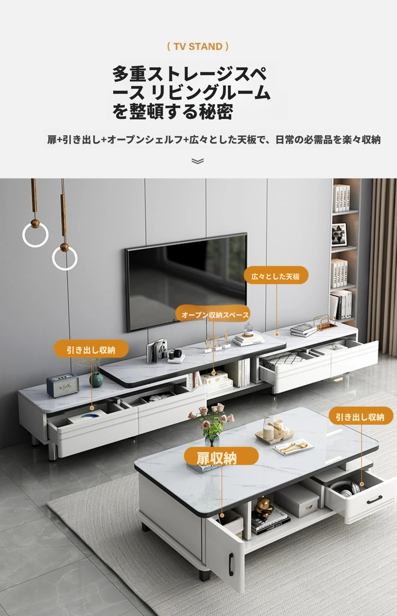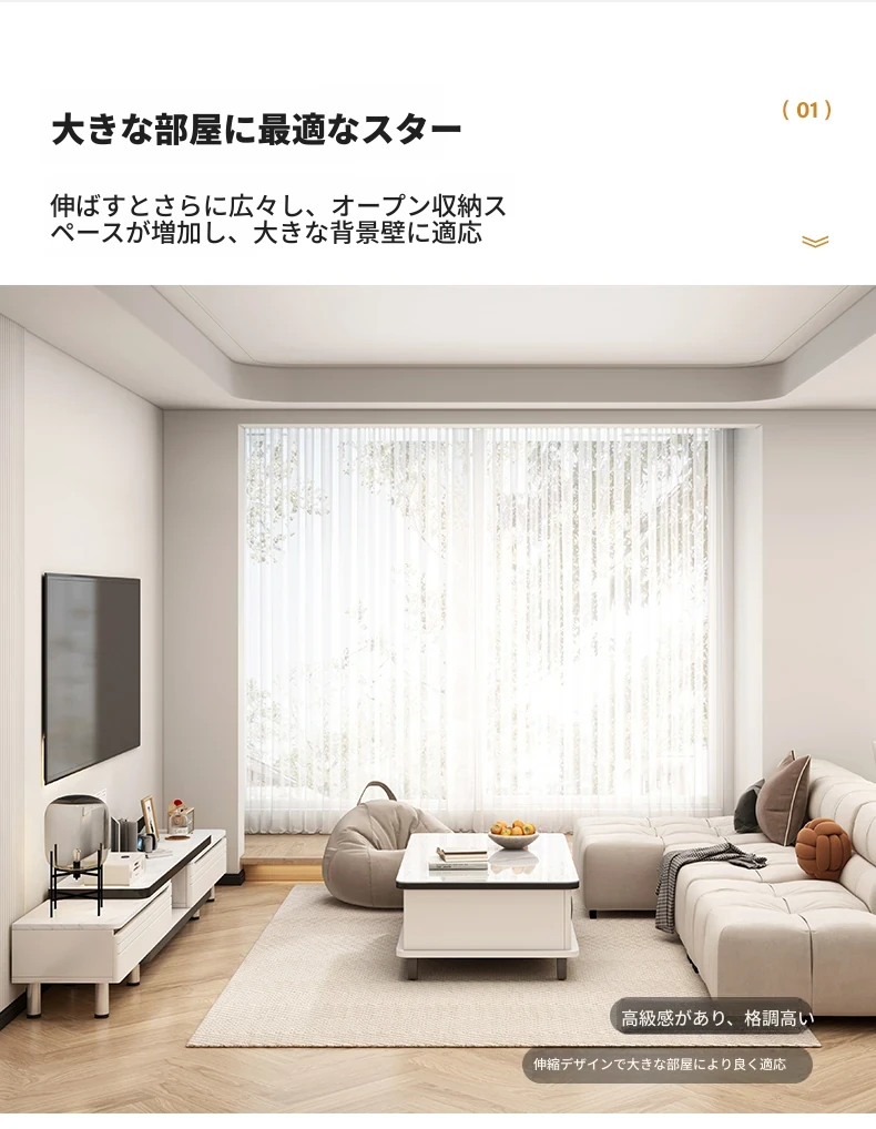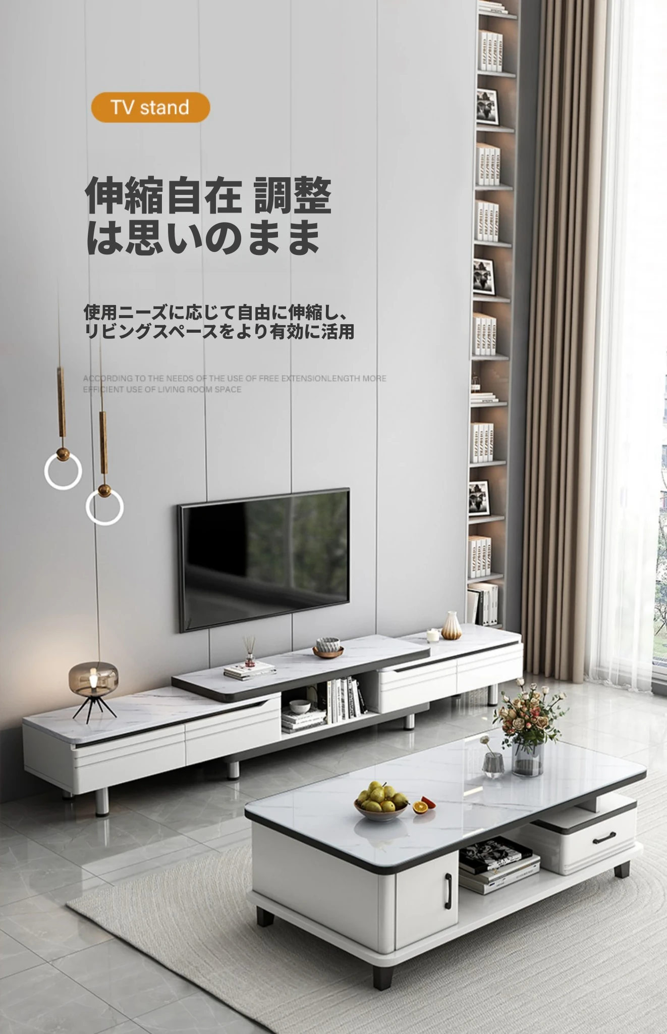 2025年新作!現代的シンプルデザインのリビング用テレビキャビネット。小型住宅にぴったりの伸縮式コーヒーテーブル&テレビ台のコンビネーションで、スペースを有効活用!おしゃれで機能的なインテリアを実現します。