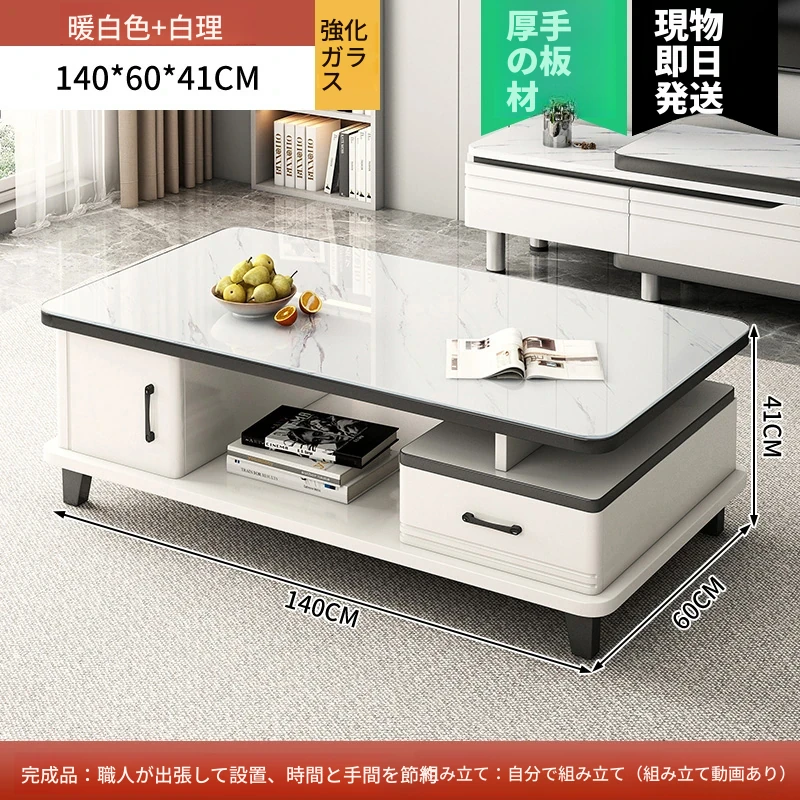 【ガラスコーヒーテーブル】白い大理石模様 140*60*41cm