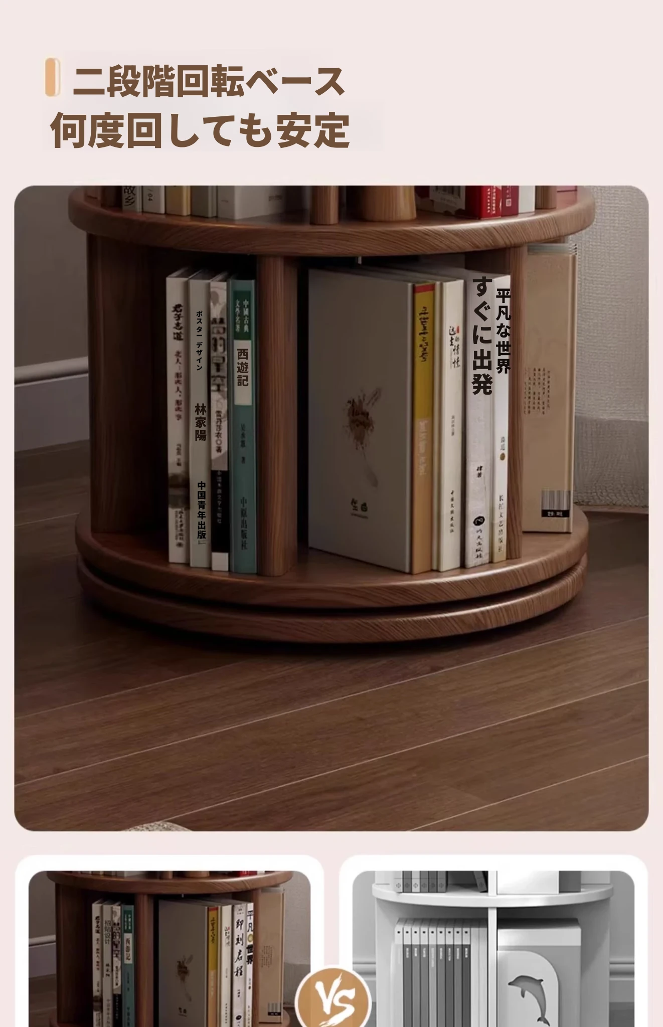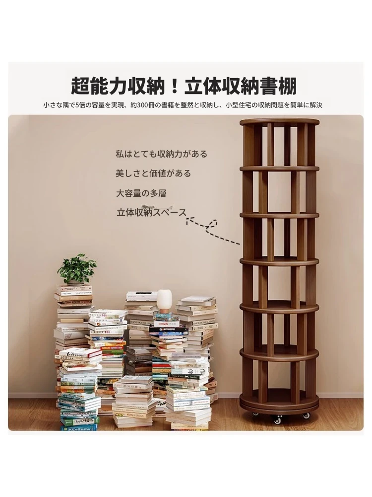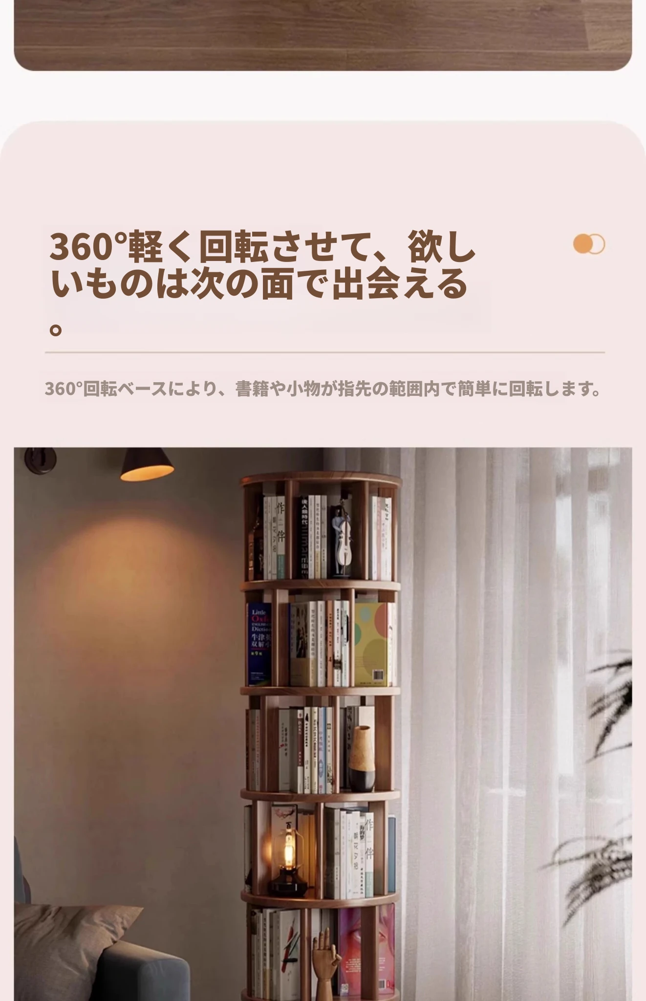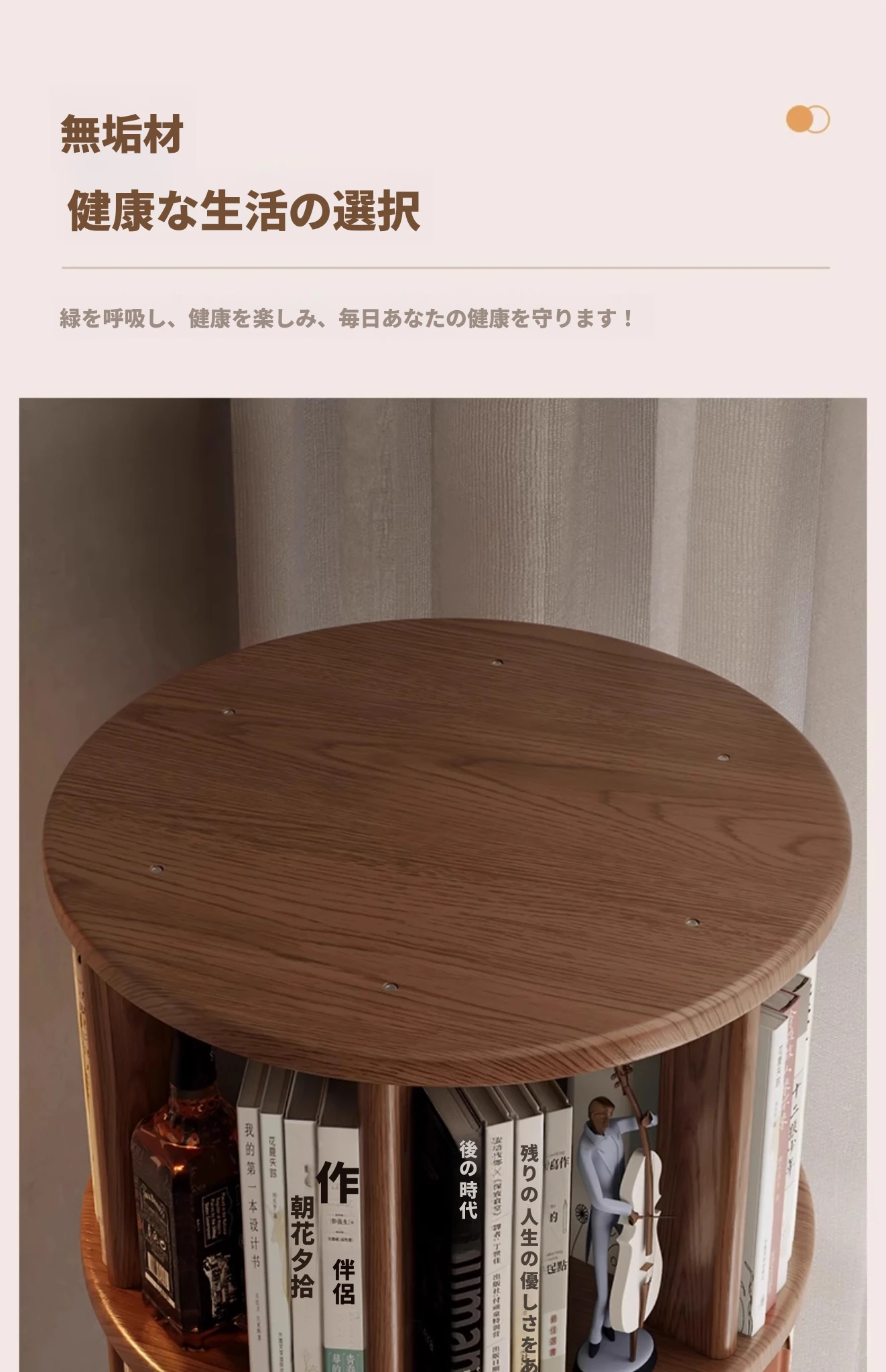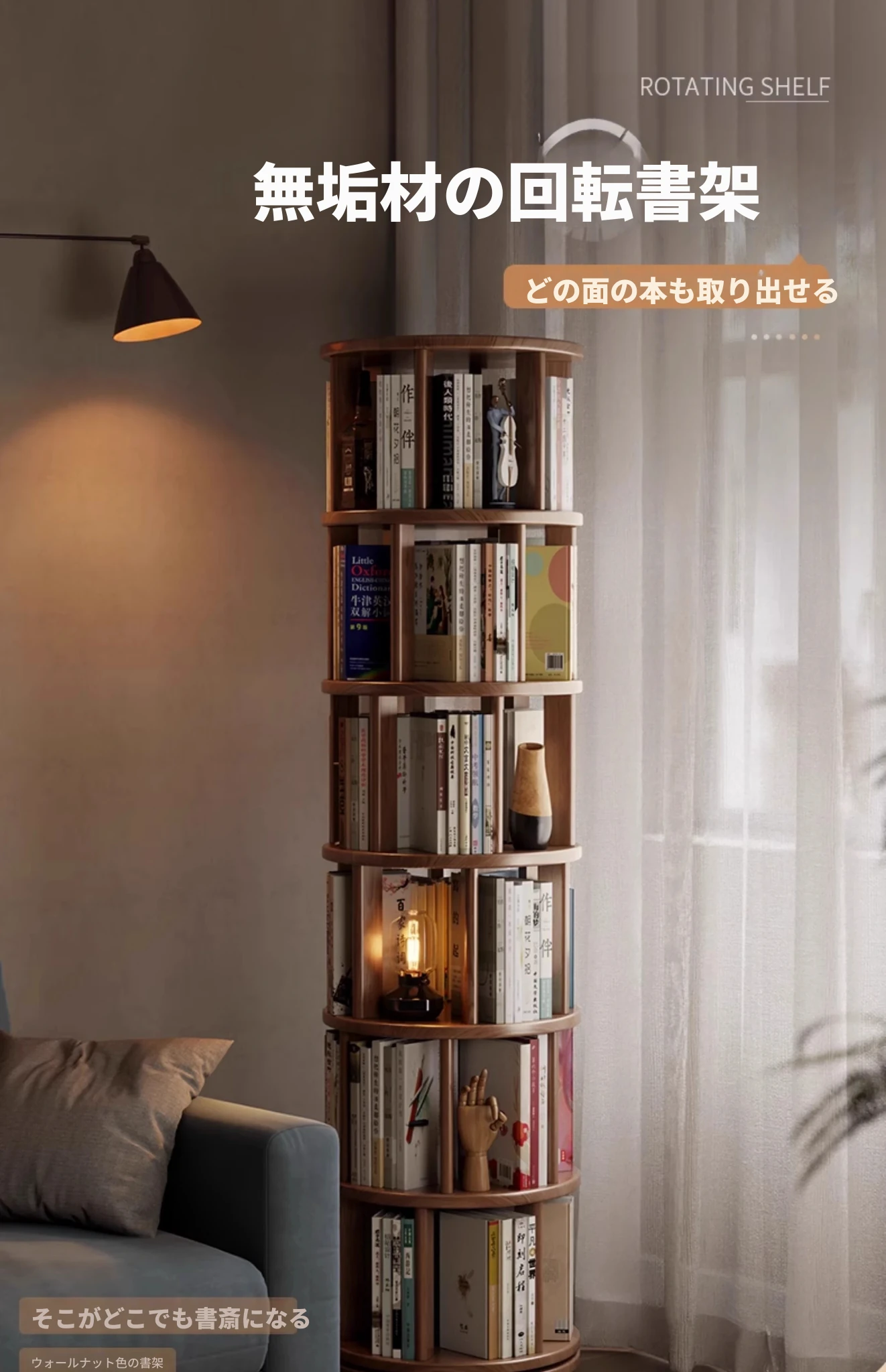 360度回転する無垢材の本棚|壁掛け可能・移動も楽々!リビングの角にぴったりな収納ラックで、スタイリッシュにお部屋を彩ります。