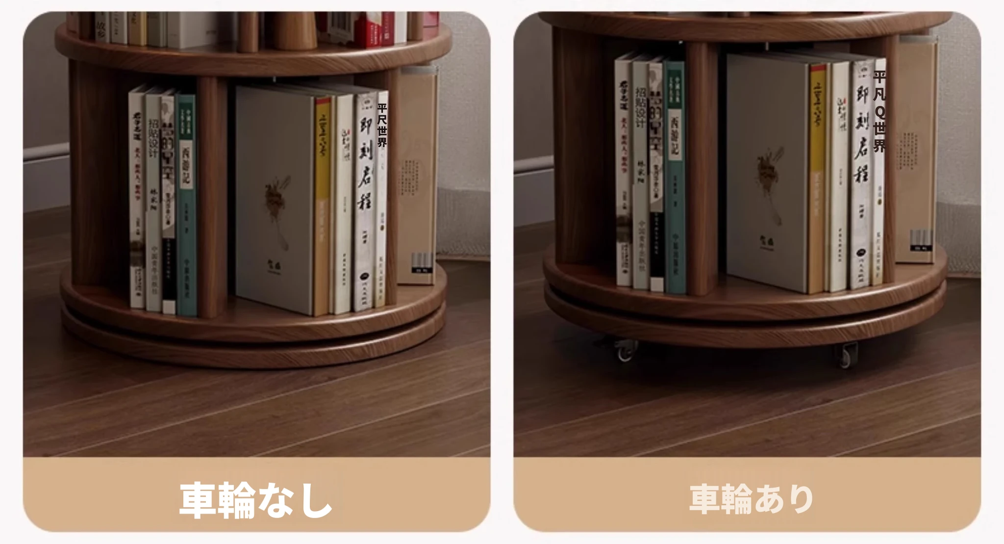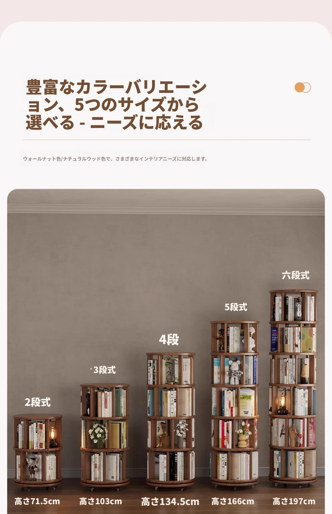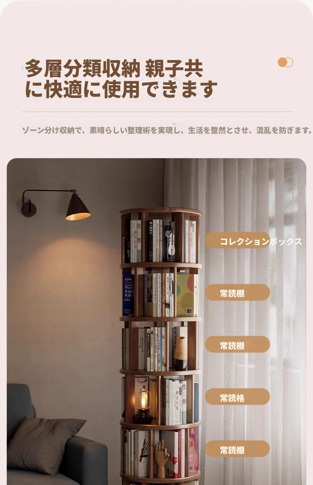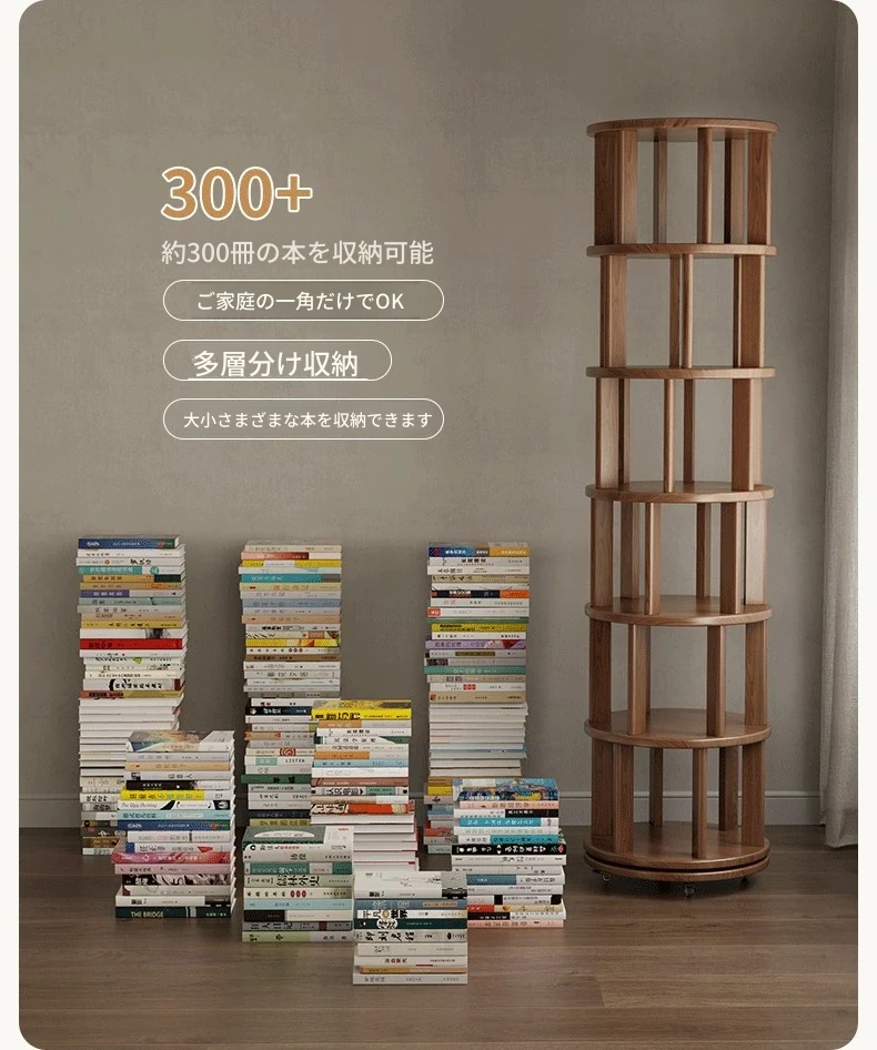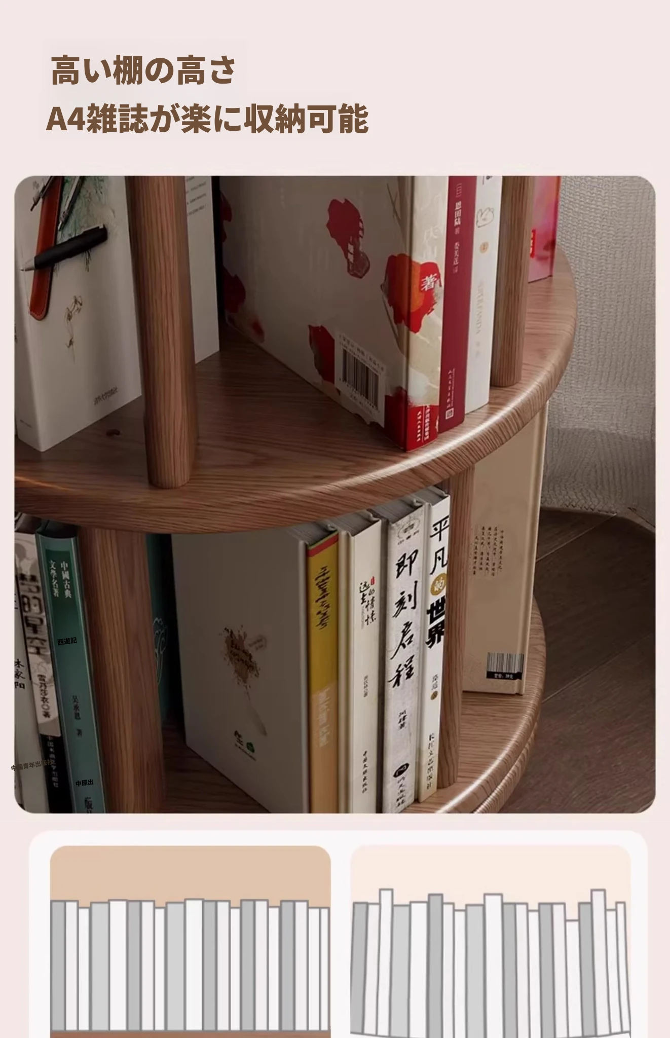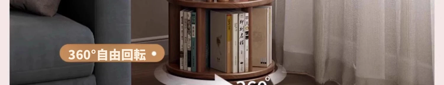 360度回転する無垢材の本棚|壁掛け可能・移動も楽々!リビングの角にぴったりな収納ラックで、スタイリッシュにお部屋を彩ります。