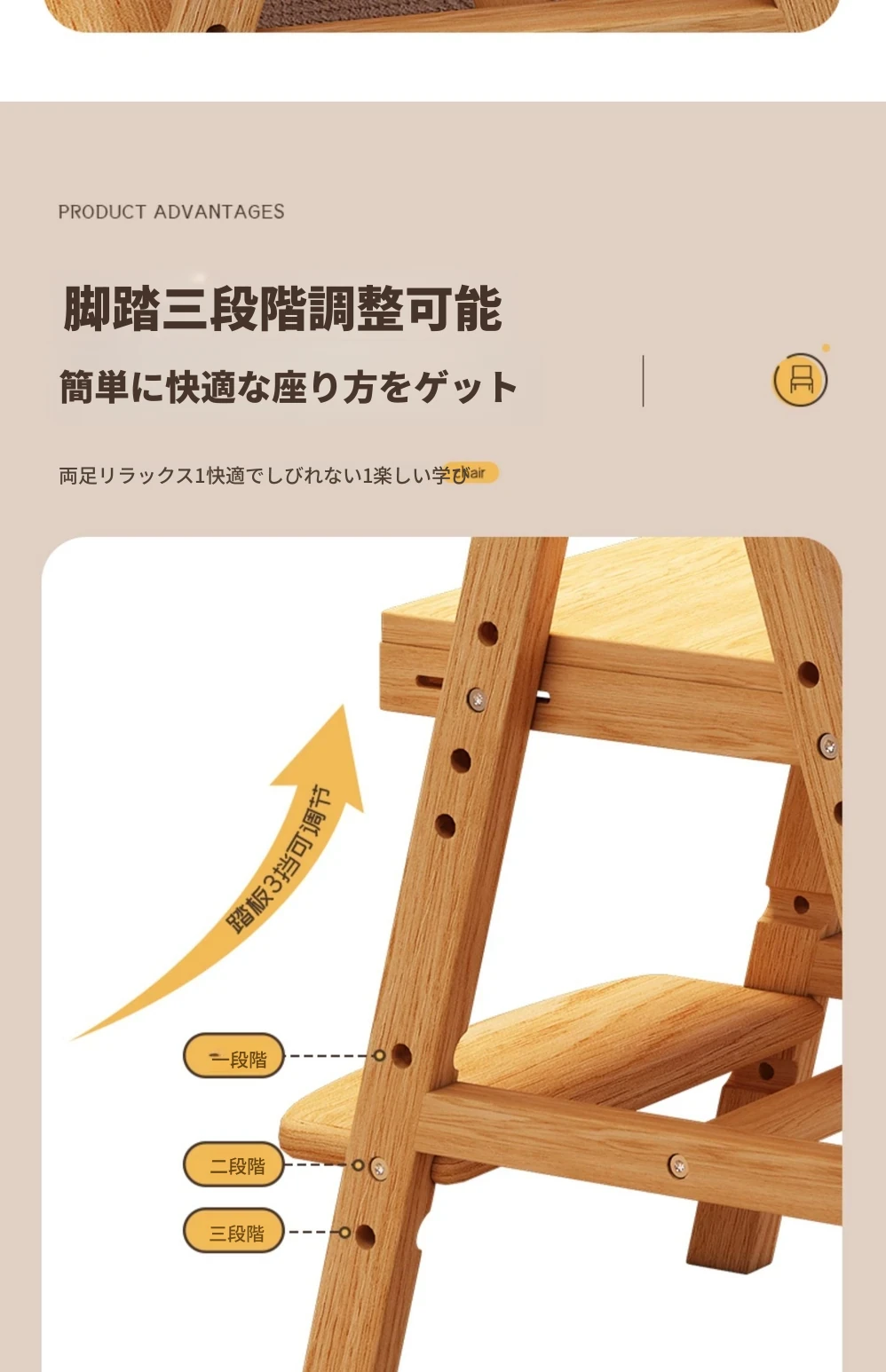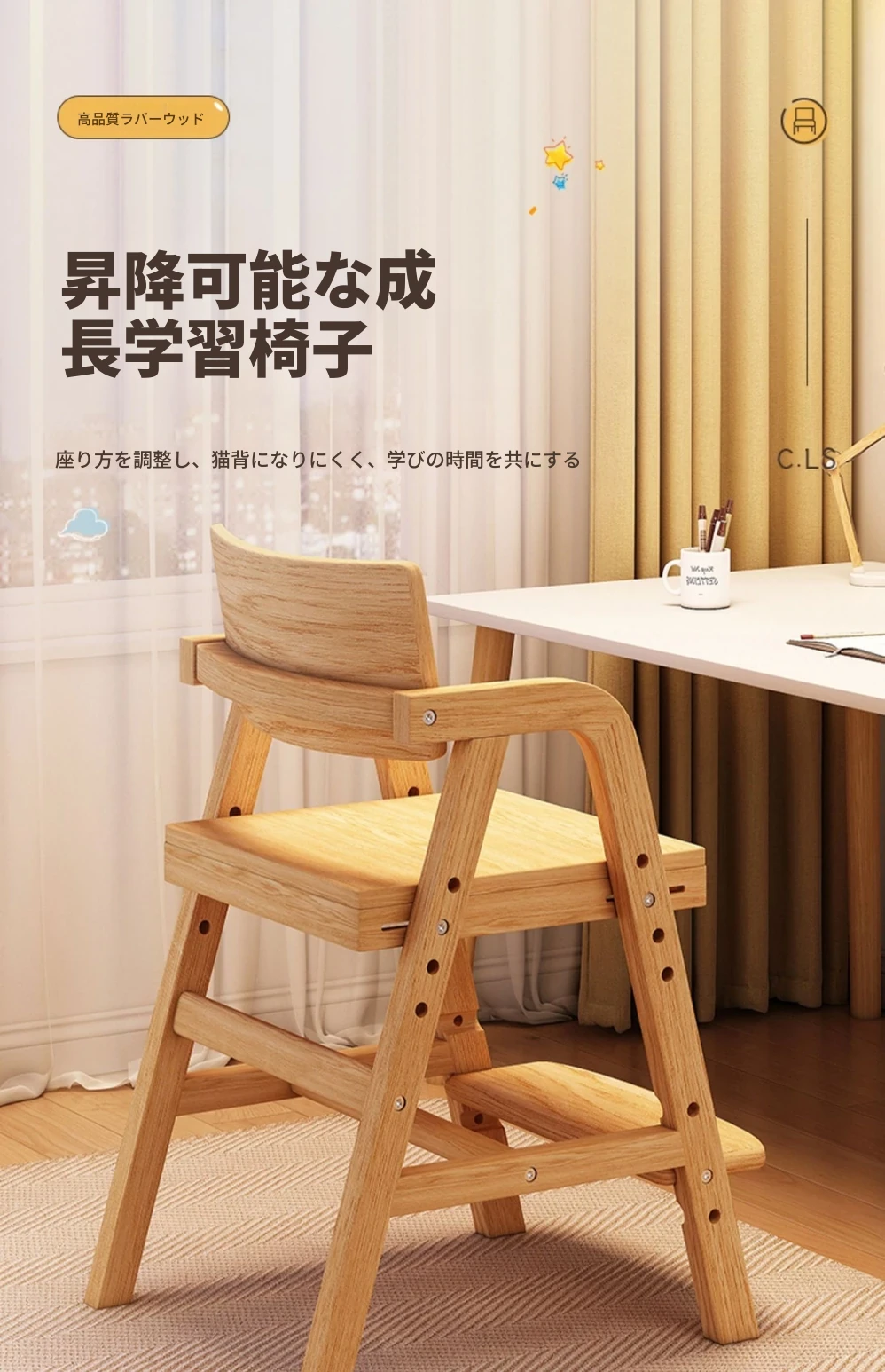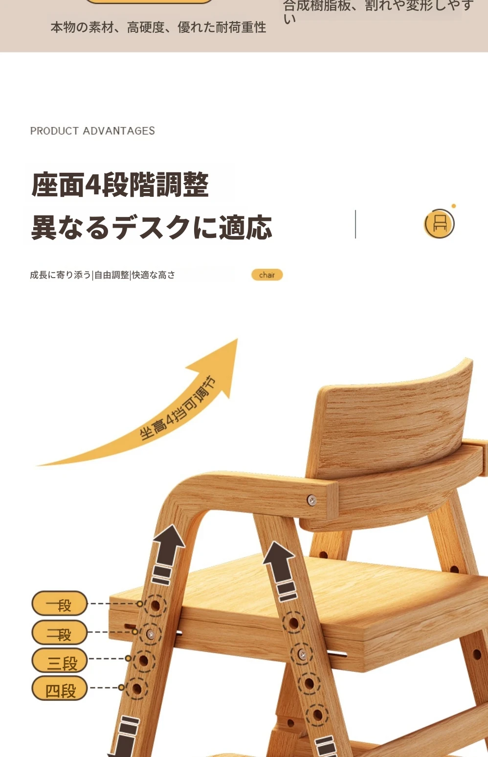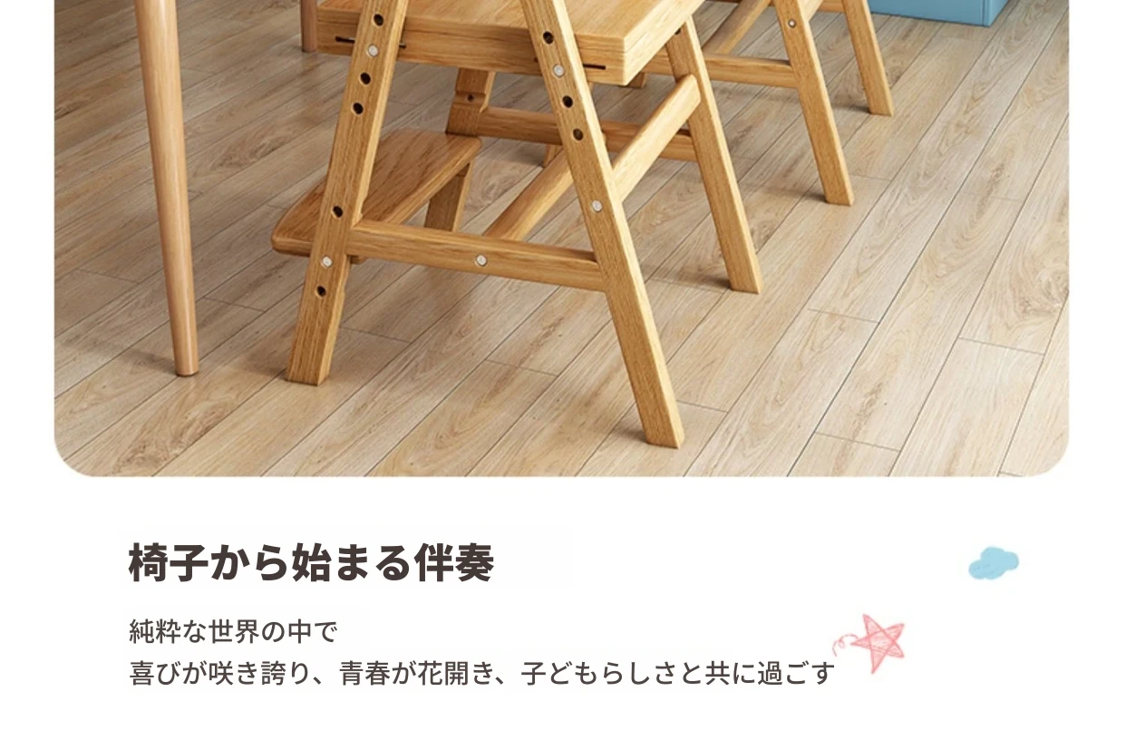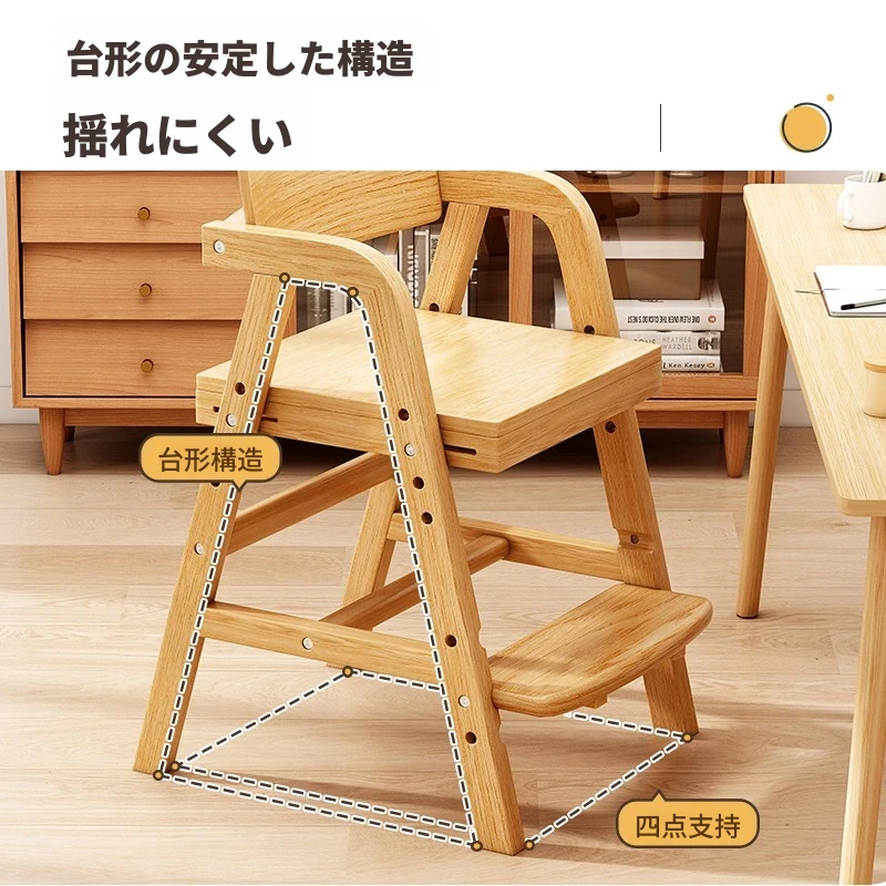 調整可能な子供用成長椅子 - 高さ調整可能な無垢材の学習椅子。背もたれ付きで、学生や赤ちゃんの食事にも最適!快適さと機能性を兼ね備えた一品です。
