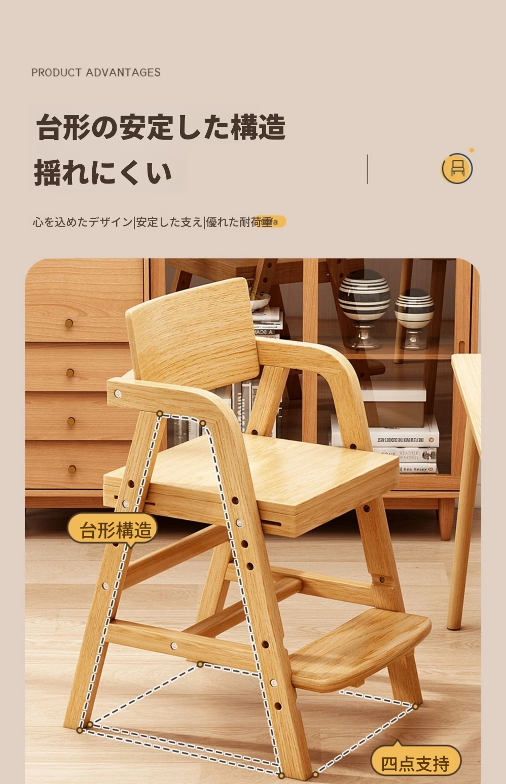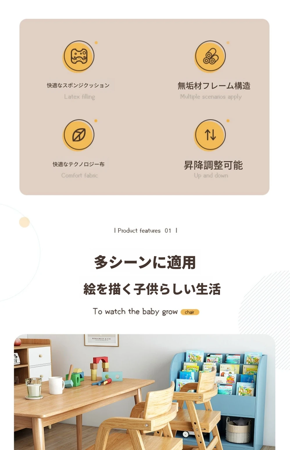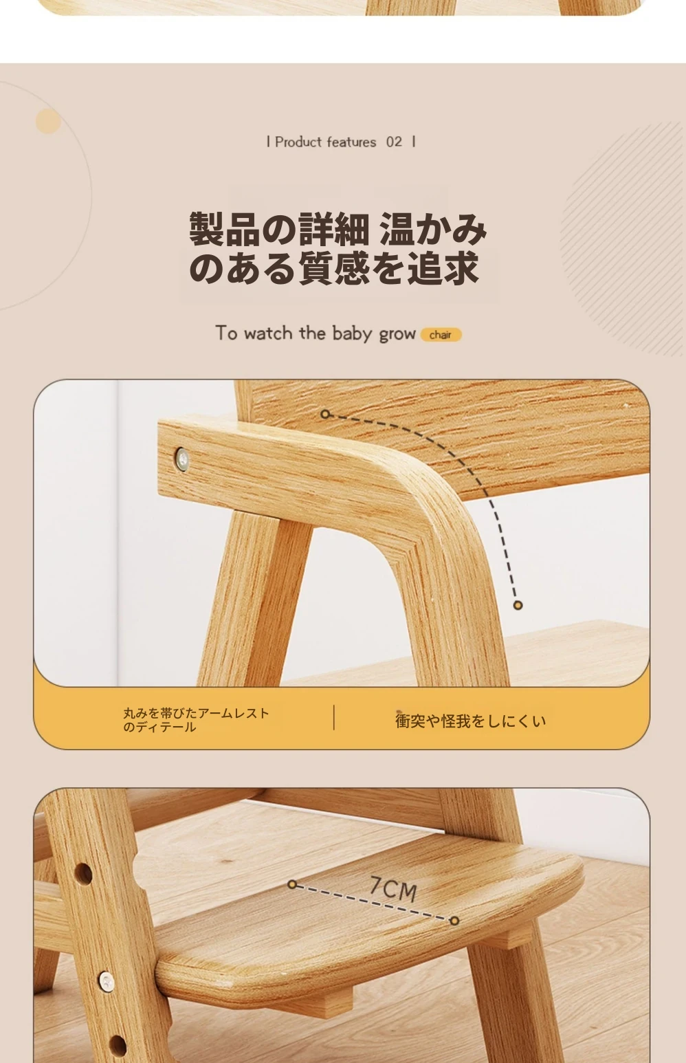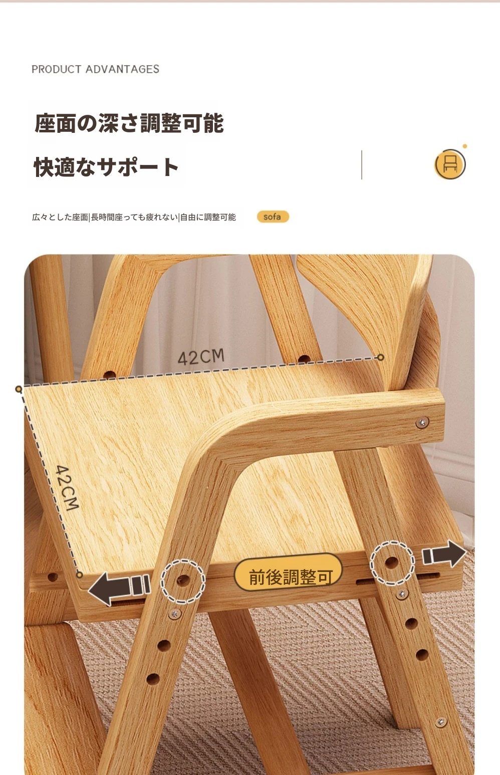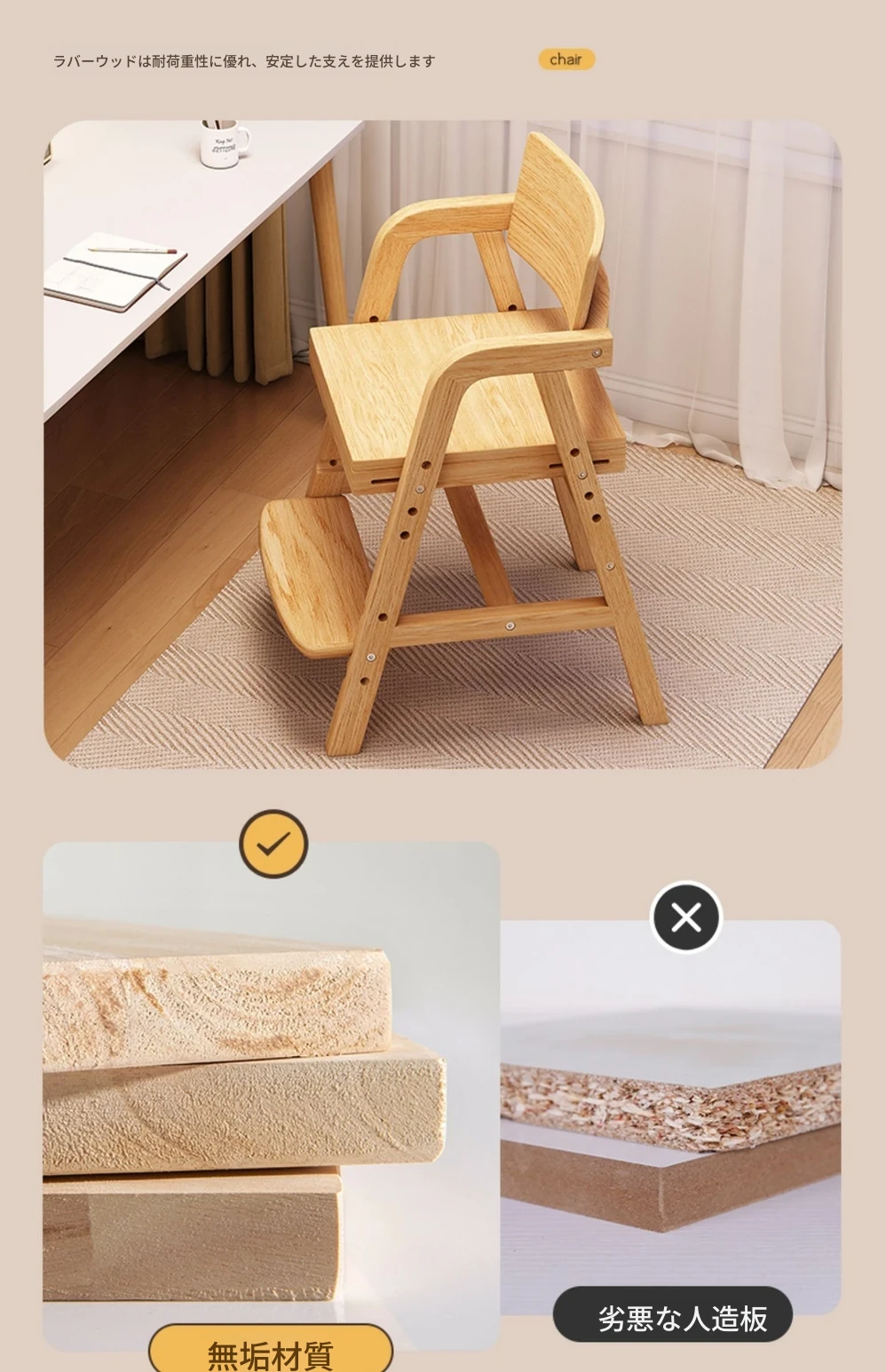 調整可能な子供用成長椅子 - 高さ調整可能な無垢材の学習椅子。背もたれ付きで、学生や赤ちゃんの食事にも最適!快適さと機能性を兼ね備えた一品です。