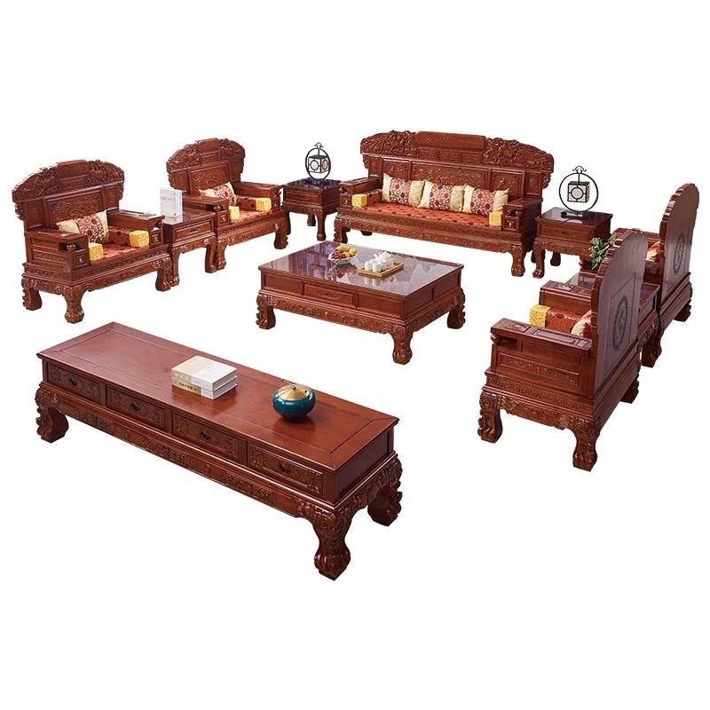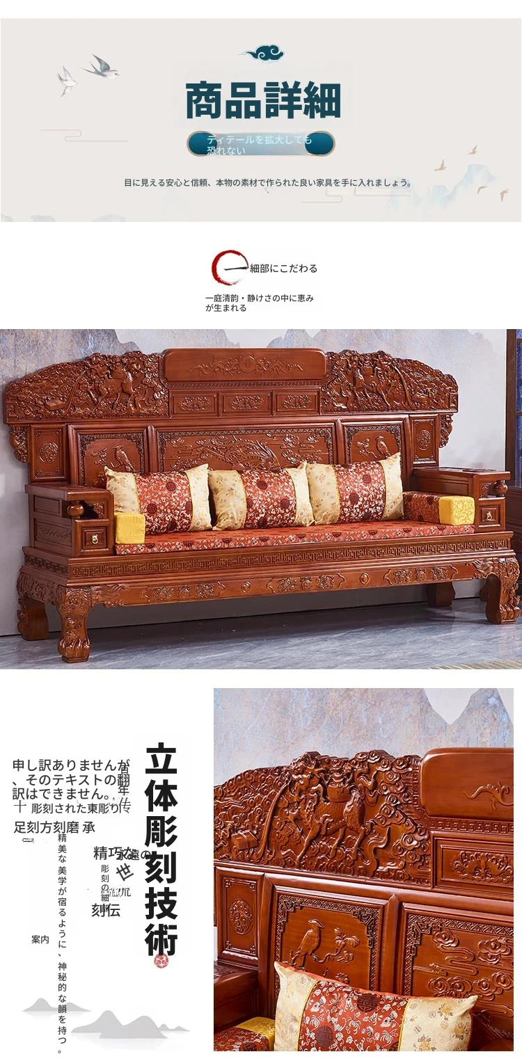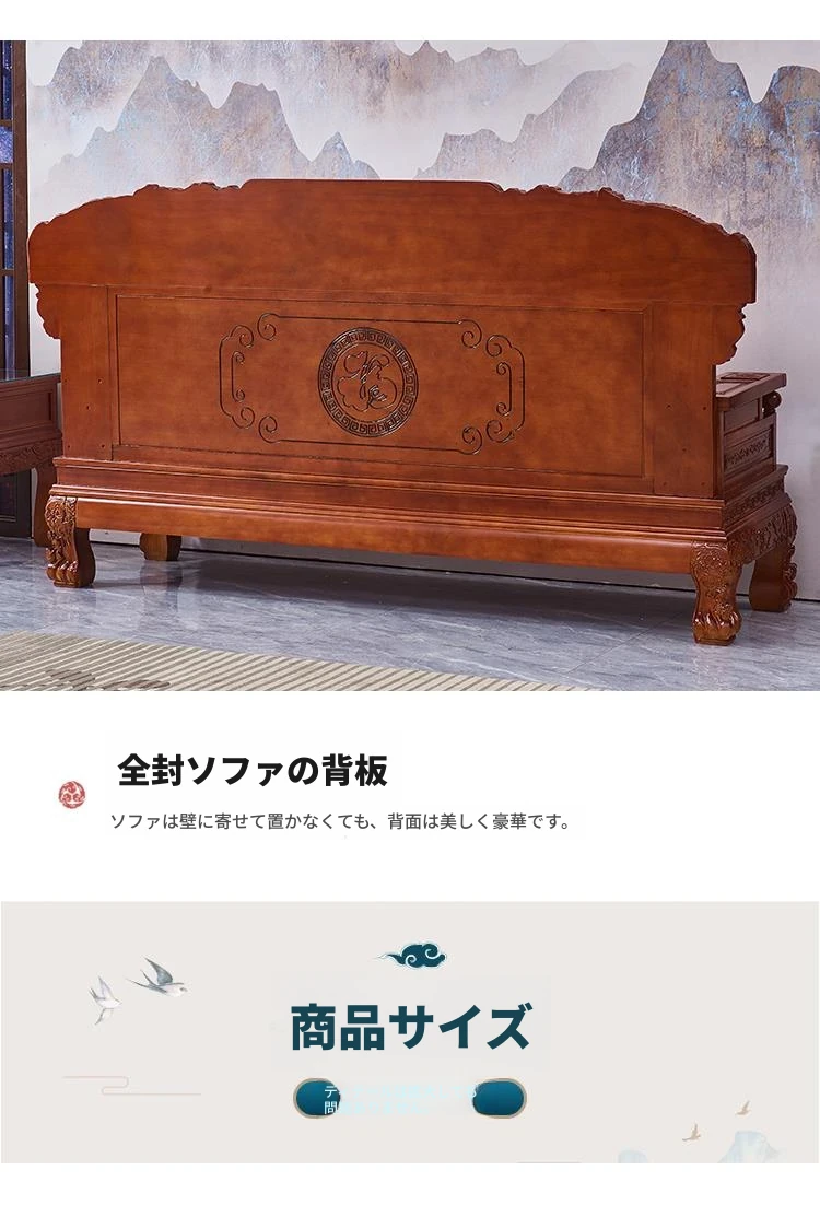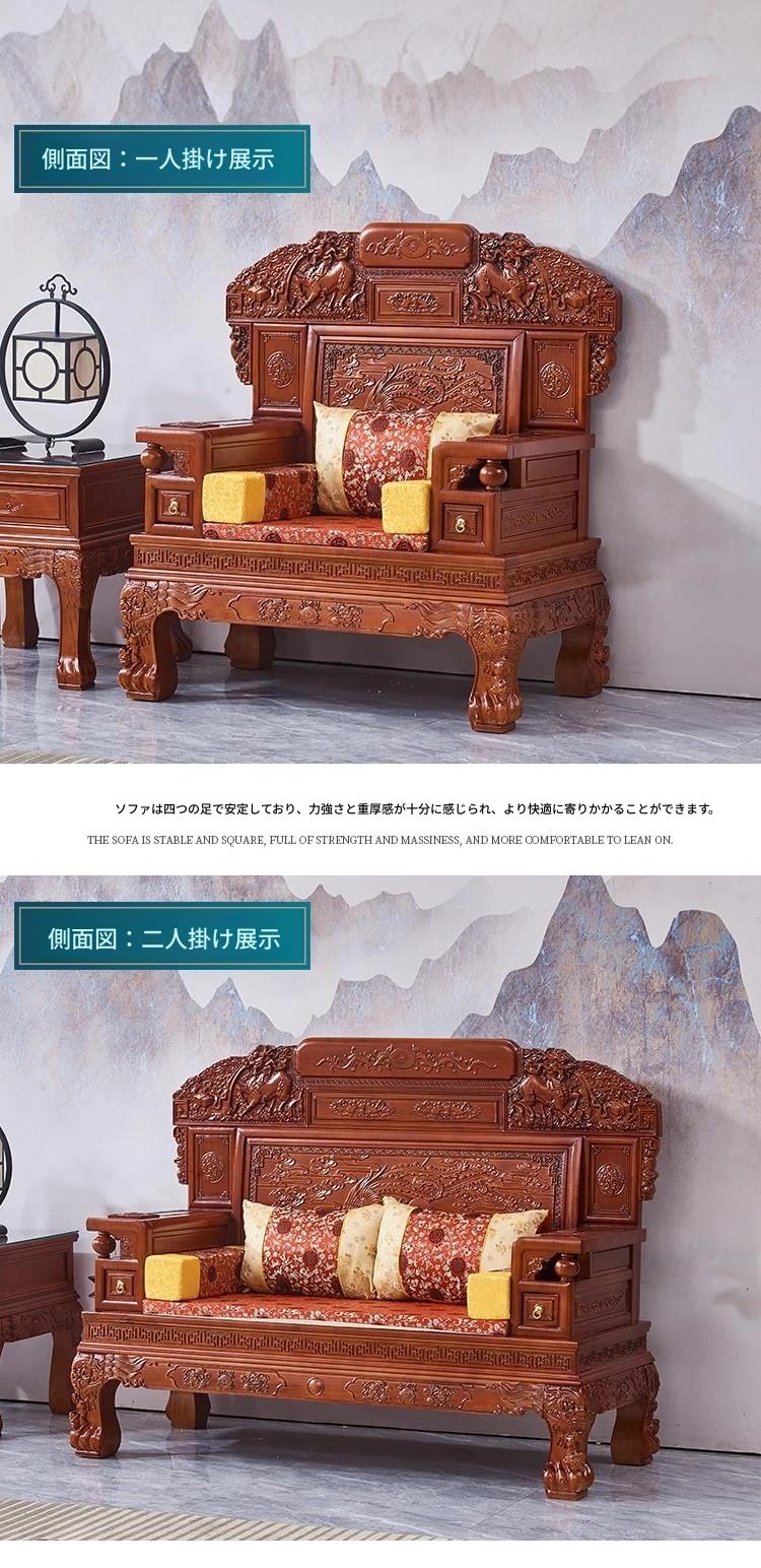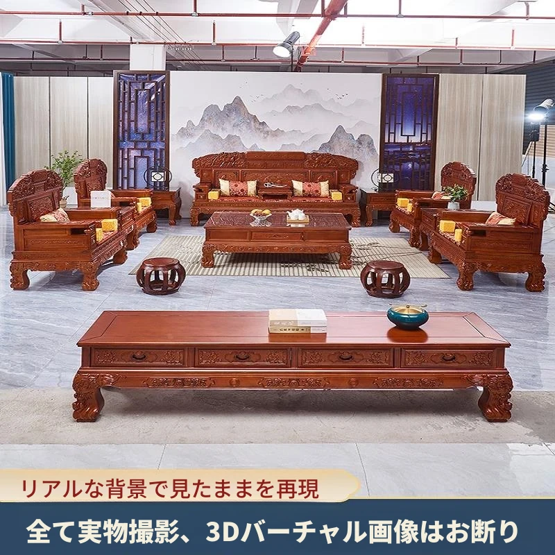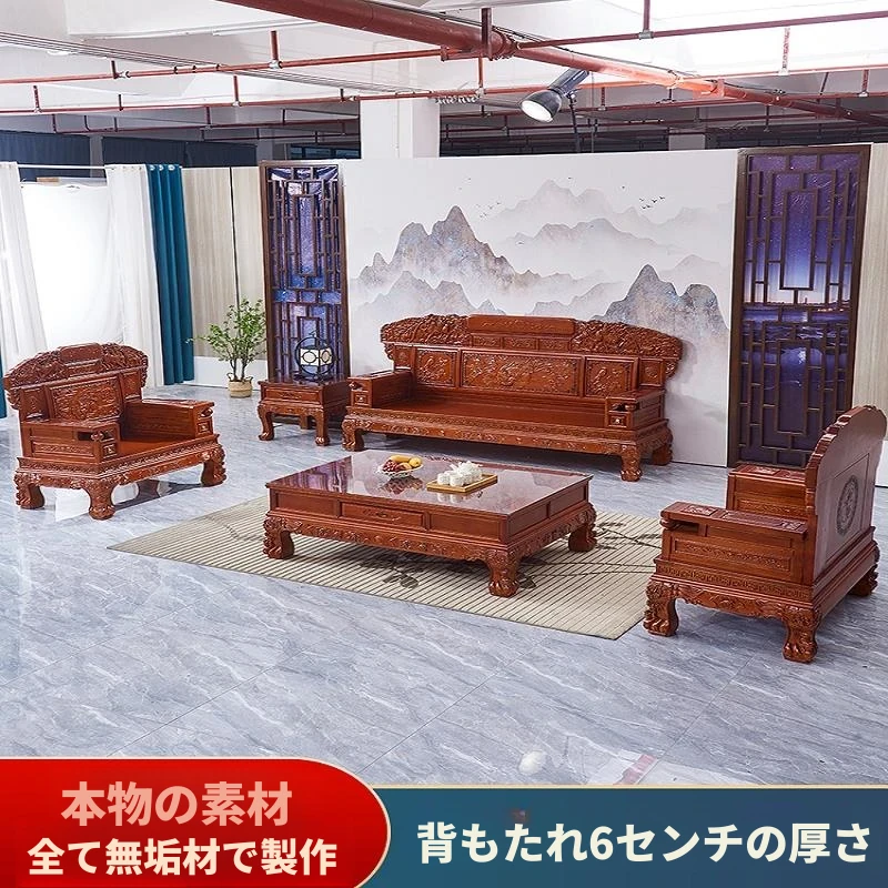 明清風格の伝統的な無垢材ソファセット - 高級紅木使用、古典的な彫刻デザインが魅力的なリビングルーム用フルセット家具。優雅さと温もりを兼ね備えた、あなたの空間を格上げする一品です!