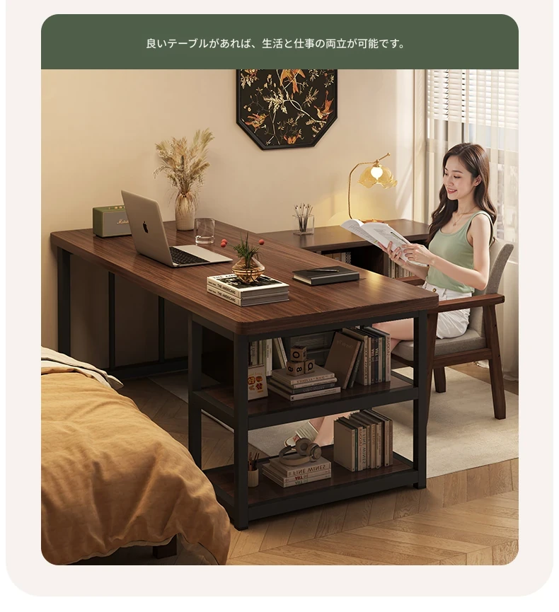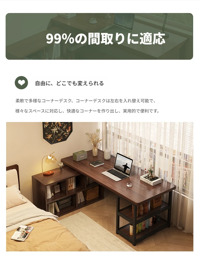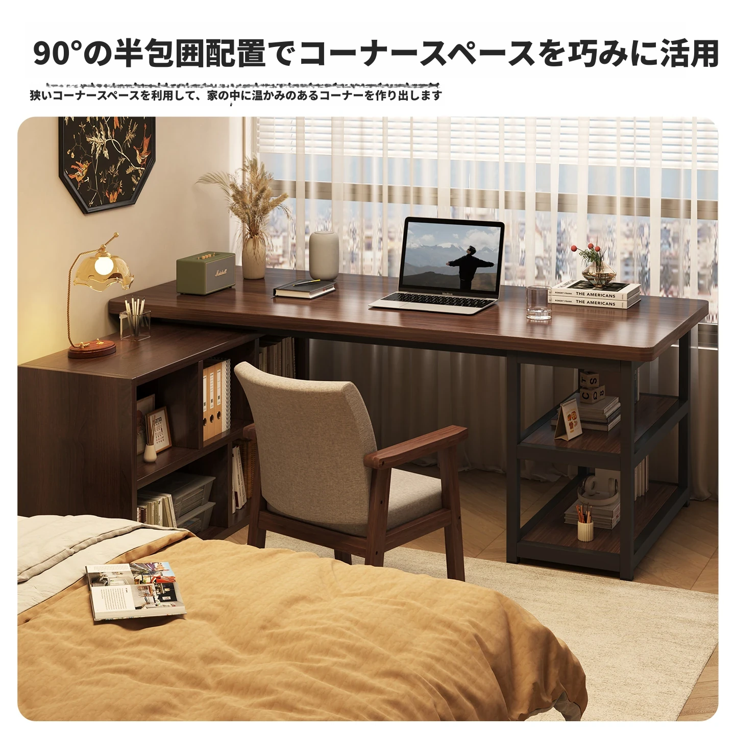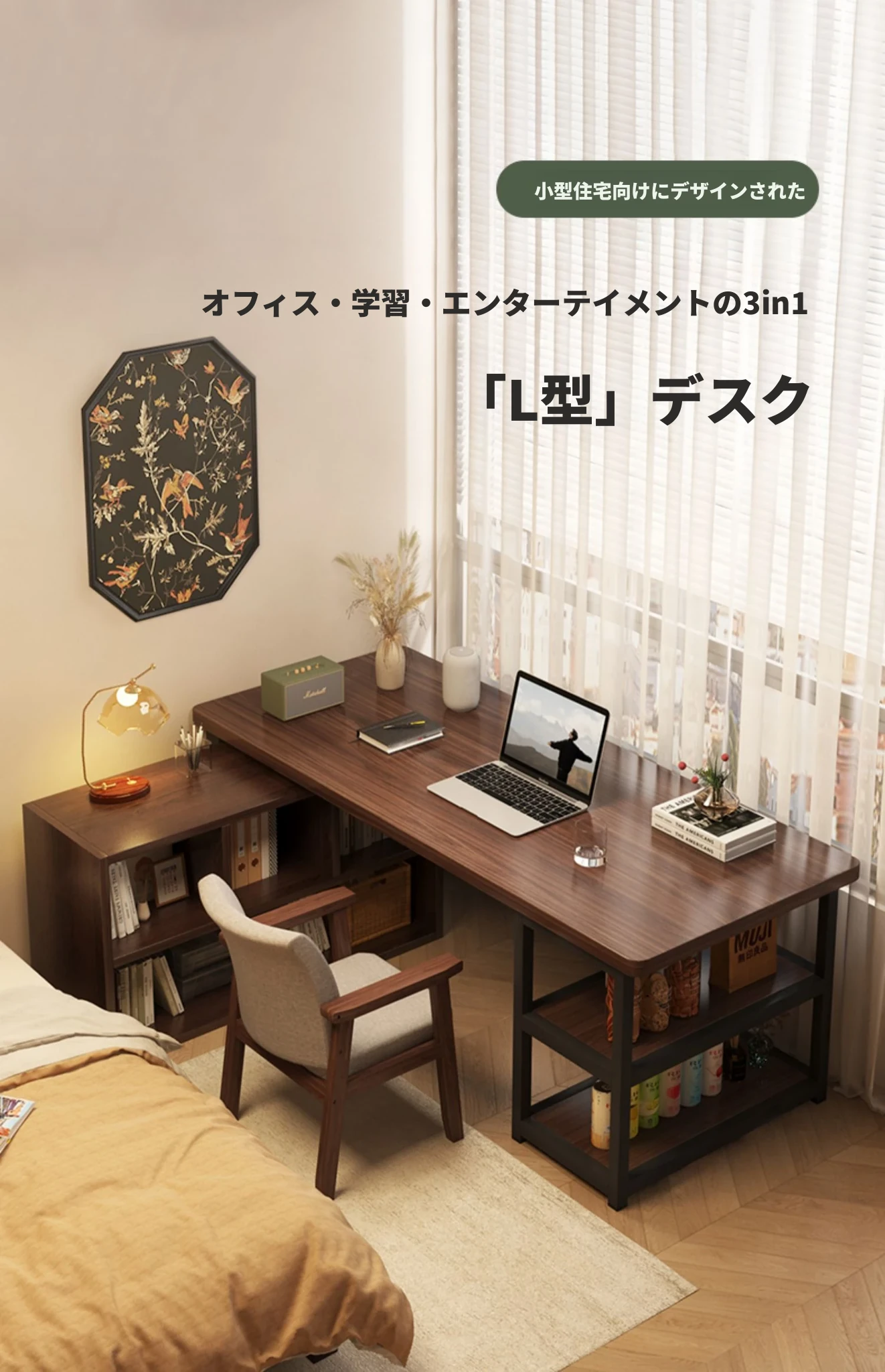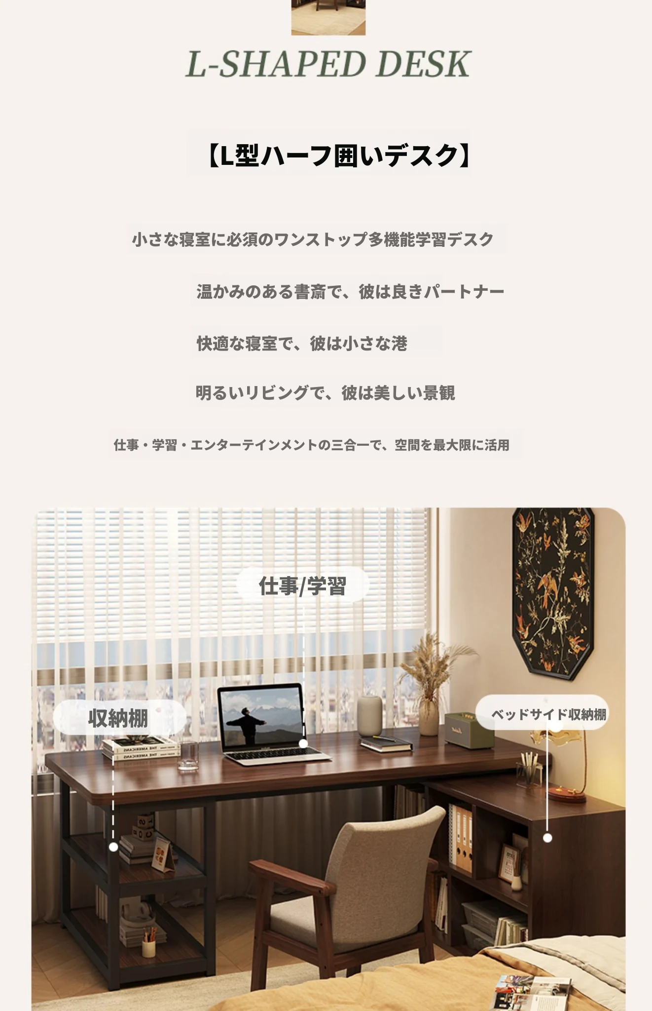 小型スペースに最適!家用寝室用ベッドサイドテーブル兼書棚・デスク一体型、壁にぴったりフィットするコーナーデスクでリビングにもぴったりなロングデスクです。おしゃれで機能的なデザインで、あなたの生活空間を快適にします!