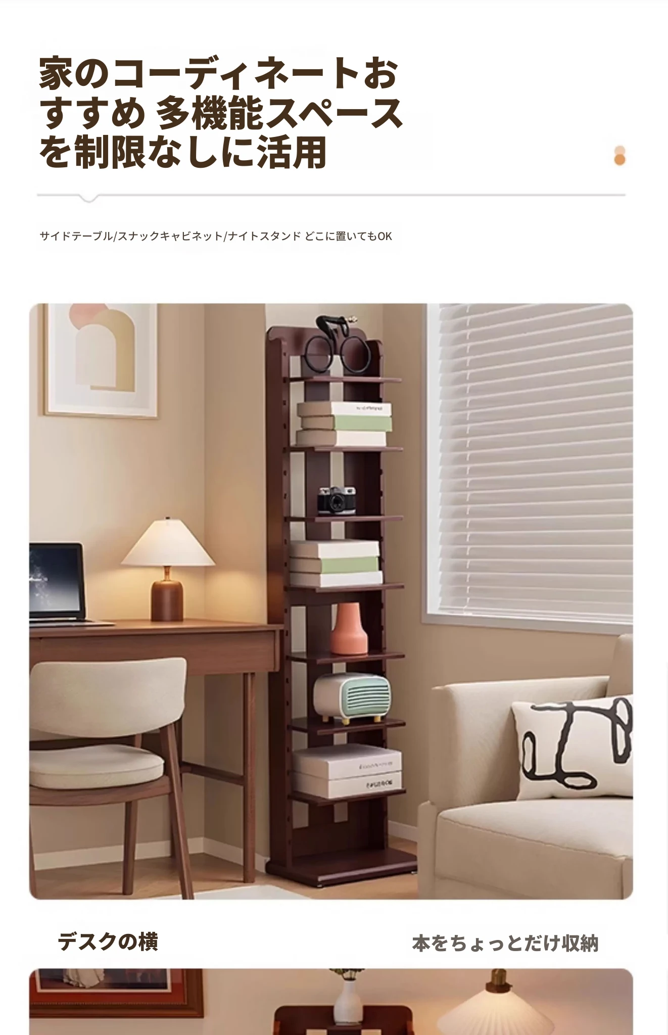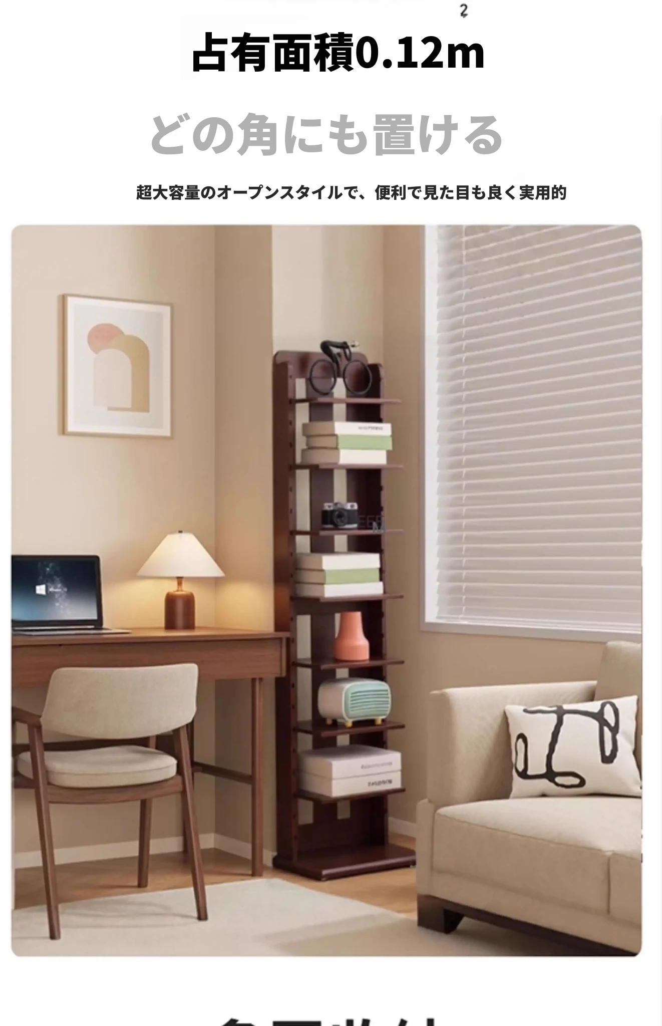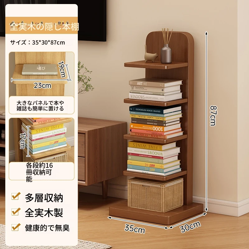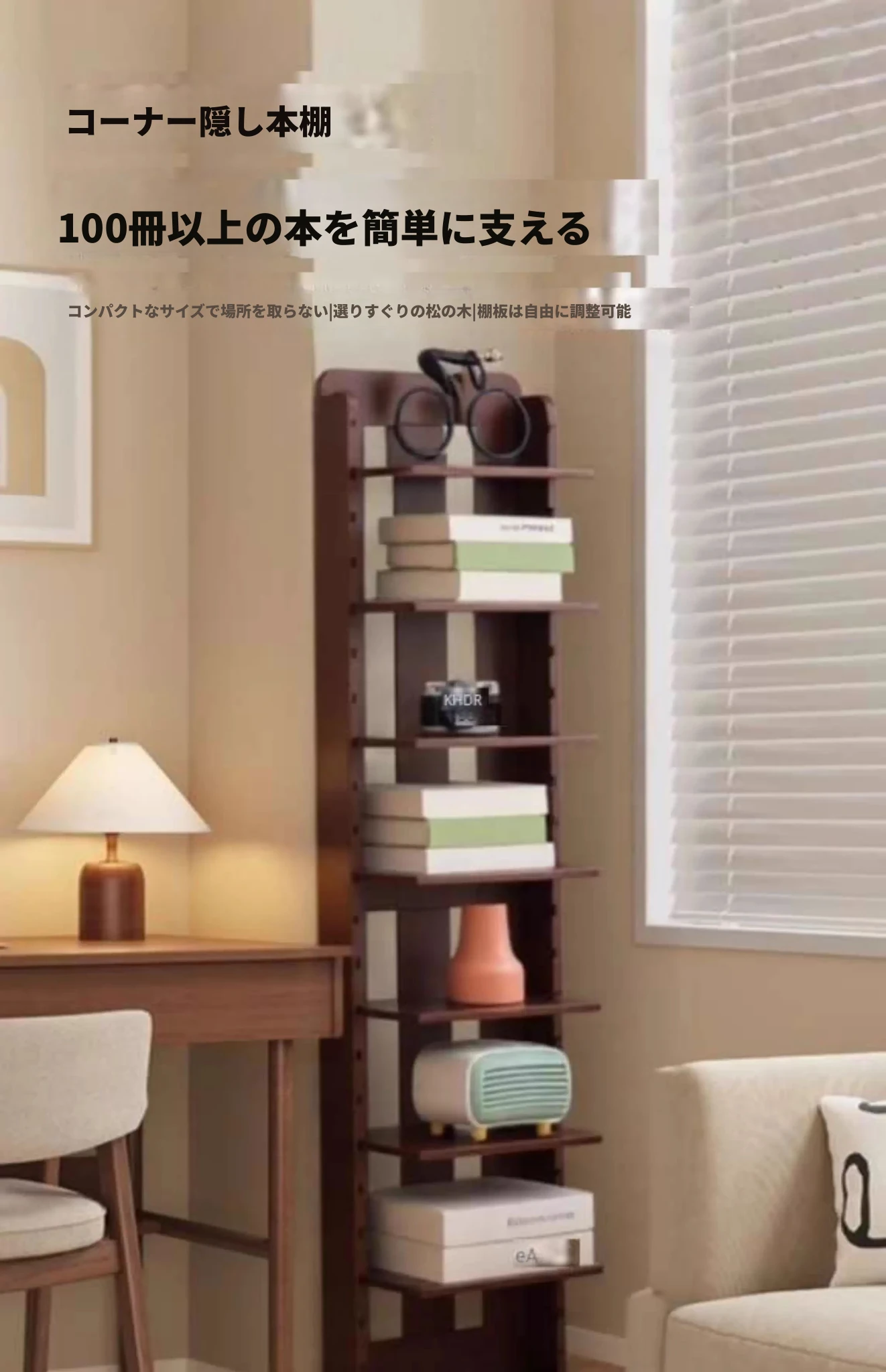 木製コーナー隠し収納棚 - 壁にぴったりフィットするスリムな学生用スタンド収納キャビネット!多層展示が可能な本棚で、お部屋をおしゃれに整理整頓!