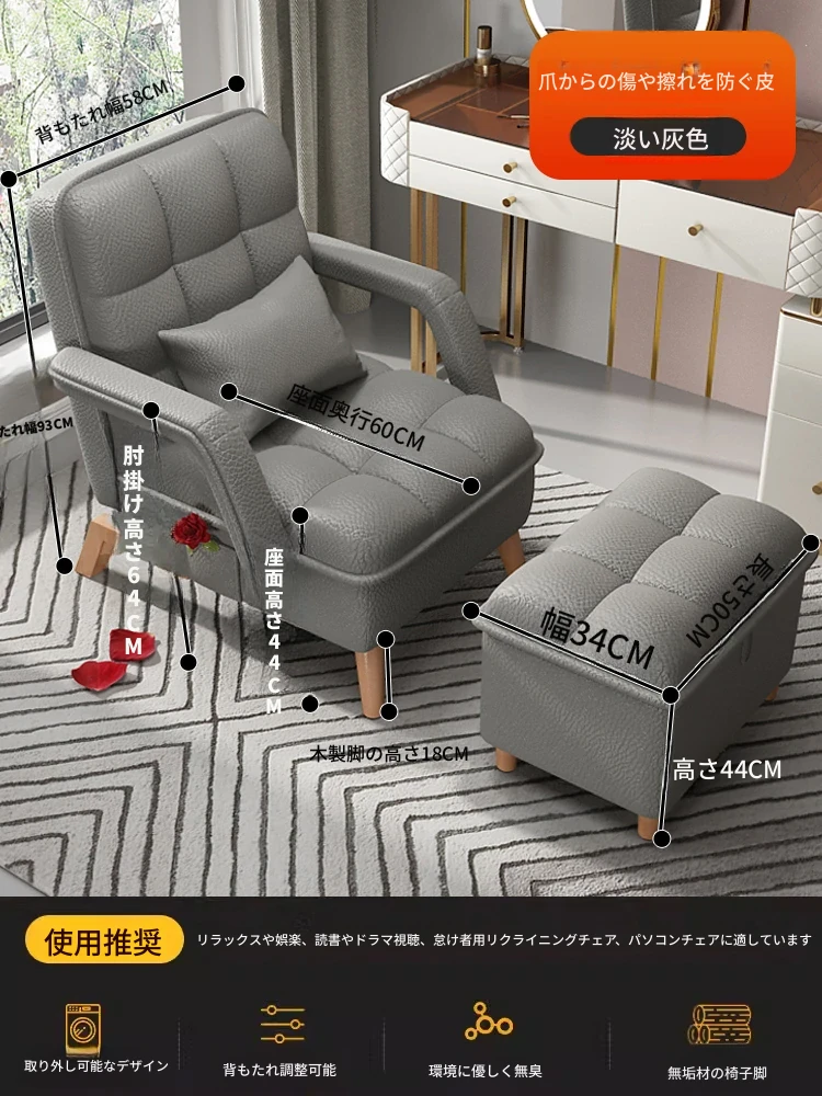 浅いグレーのソファ+フットスツール(アップグレード版ネコ爪皮素材)