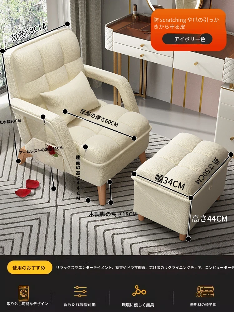 アイボリーのソファ+フットスツール(アップグレード版ネコ爪皮素材)