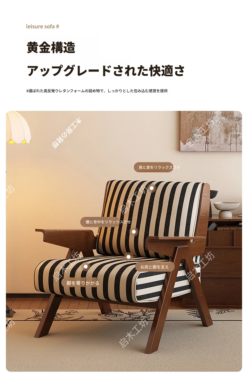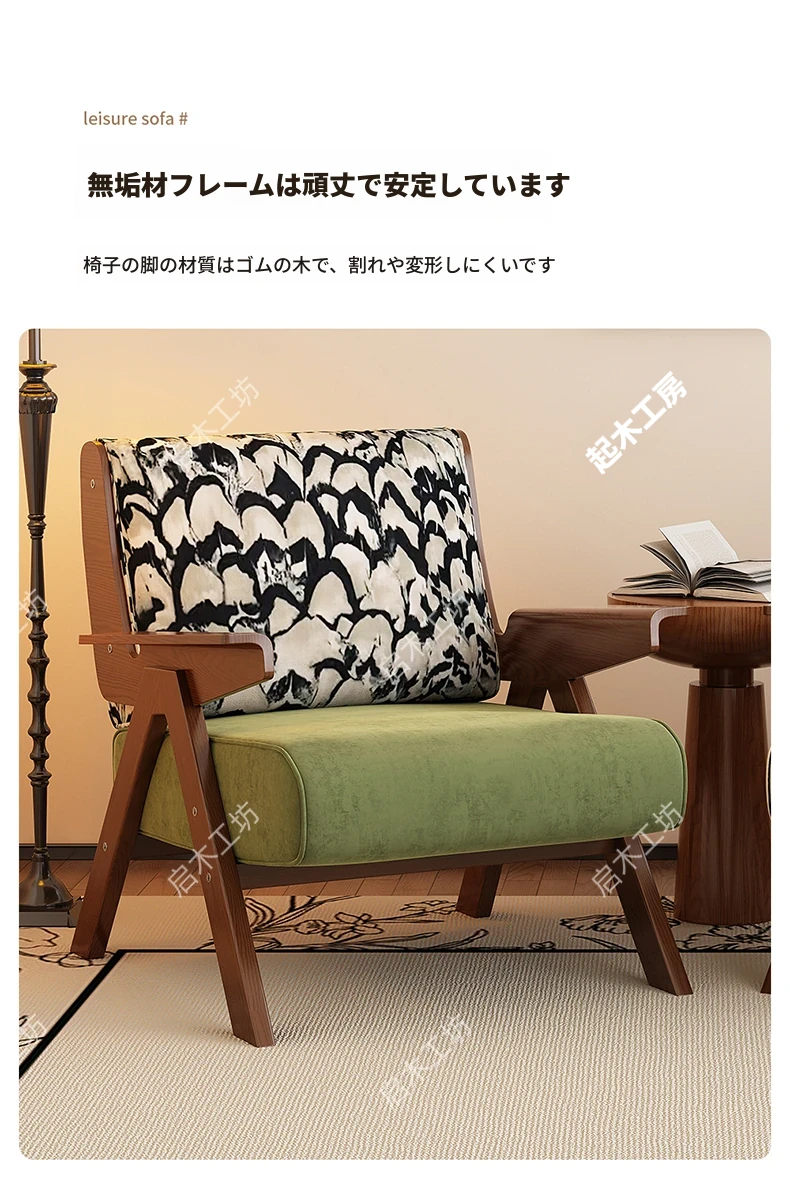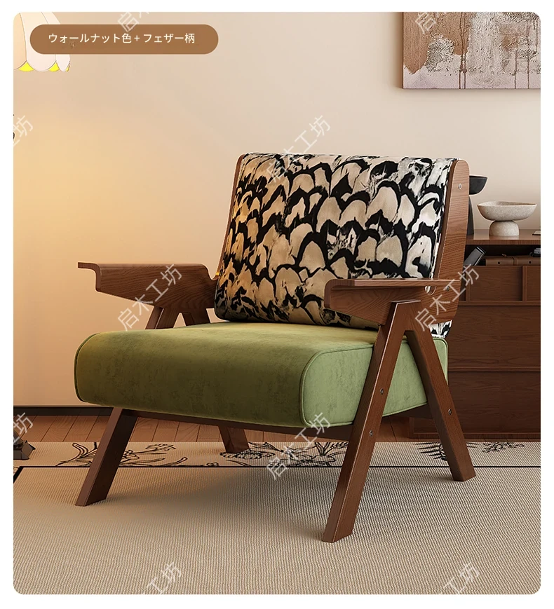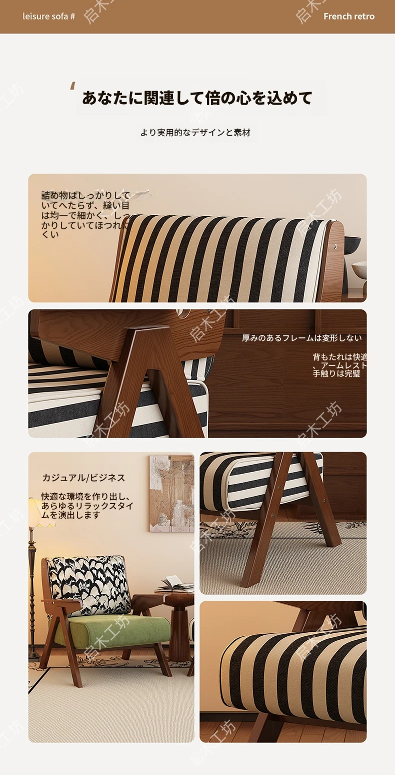 デザイナーによる無垢材の一人掛けソファチェア - ホテル向けの背もたれ付きフレンチスタイル布製ソファチェアで、アンティーク風のリラックスチェアとして最適です。おしゃれな空間を演出し、くつろぎのひとときを提供します!