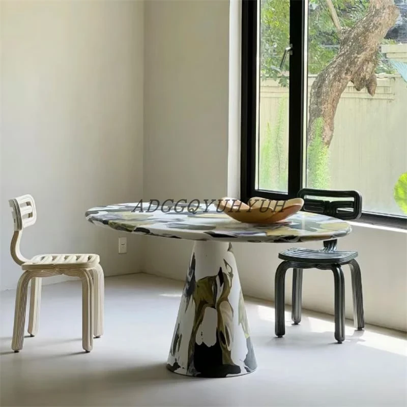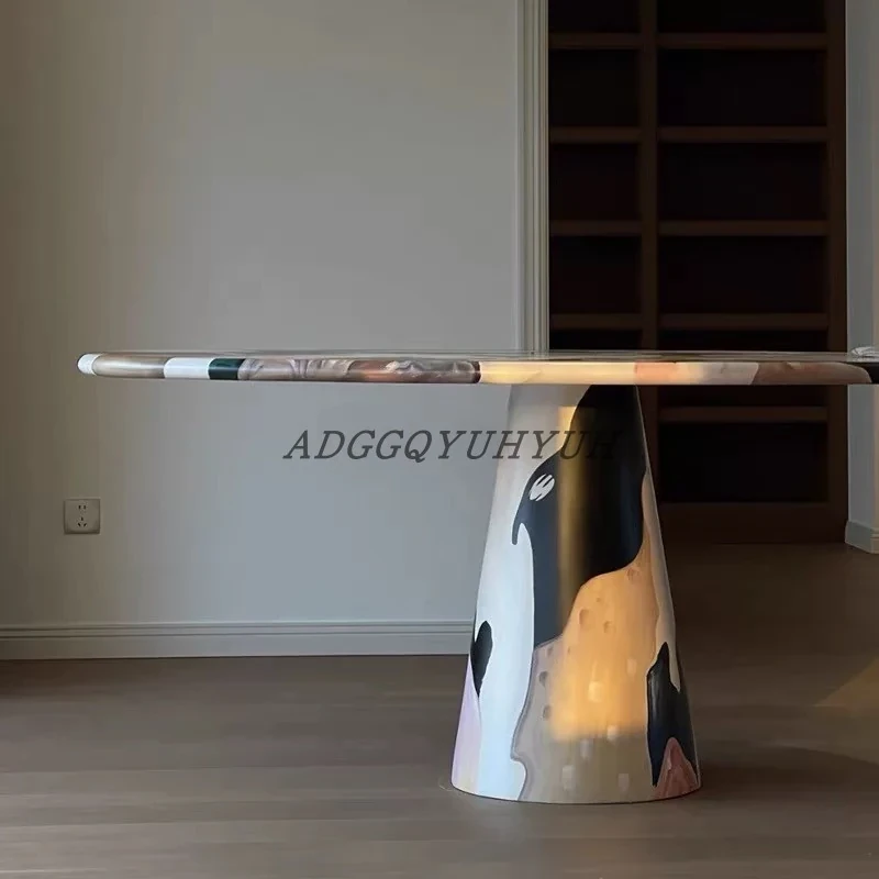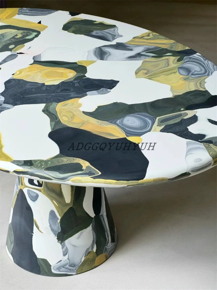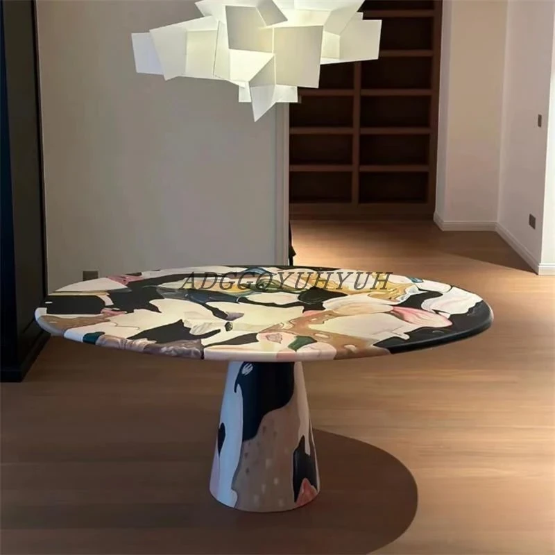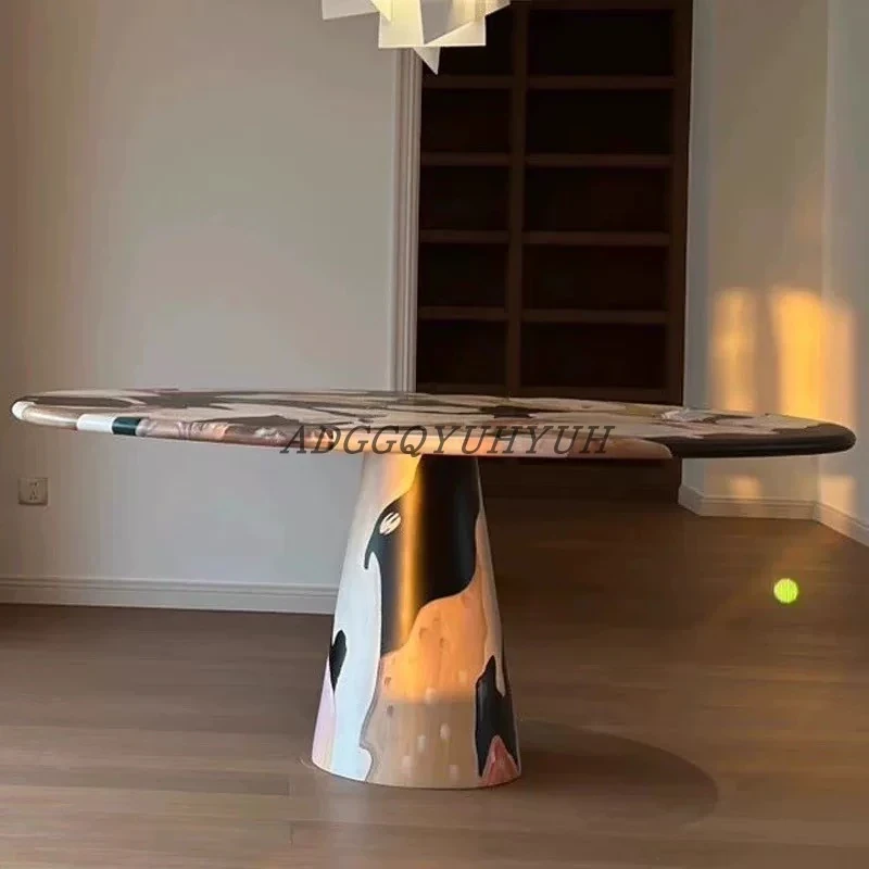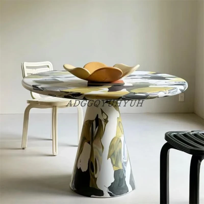 中古デザイナーアート手描きオイルペインティング丸型ダイニングテーブル - 小型住居にぴったりなクリエイティブなデザイン、食事や商談に最適!