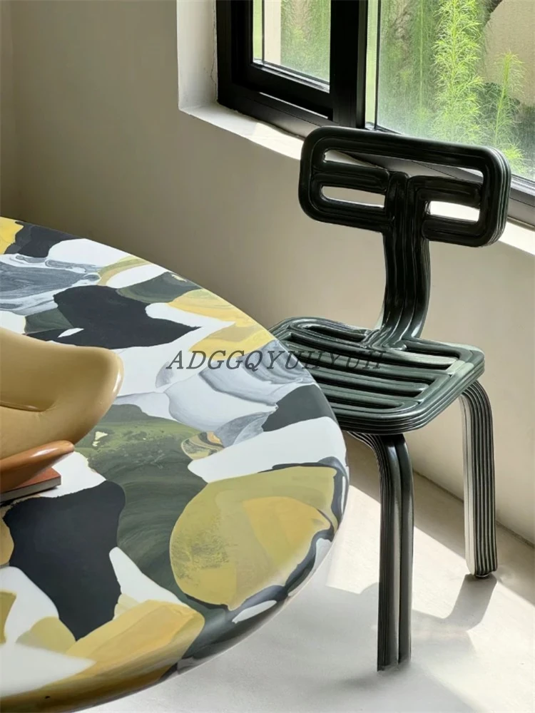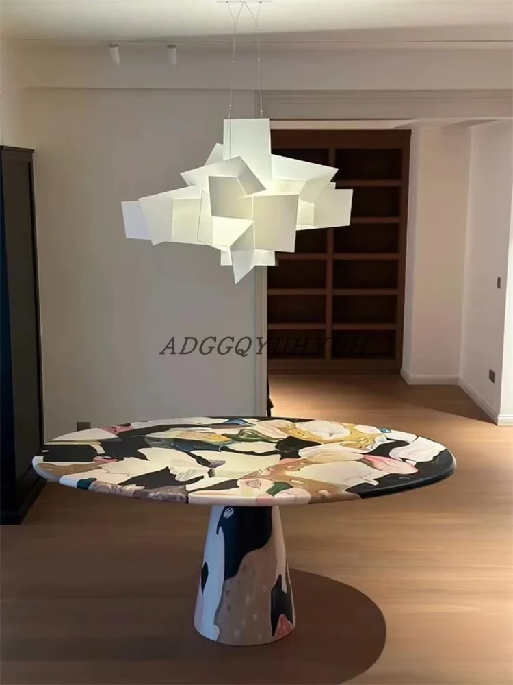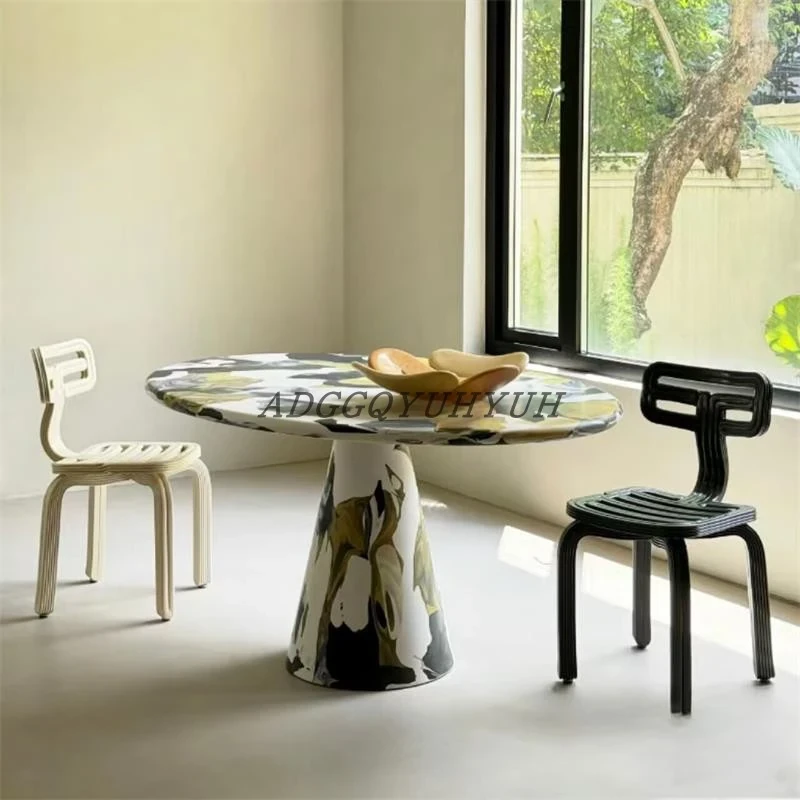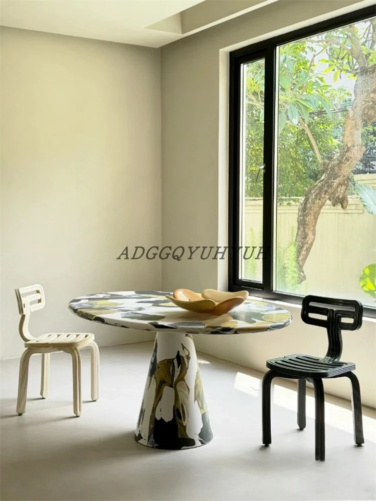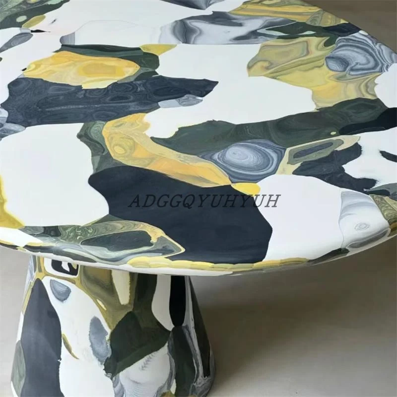 中古デザイナーアート手描きオイルペインティング丸型ダイニングテーブル - 小型住居にぴったりなクリエイティブなデザイン、食事や商談に最適!