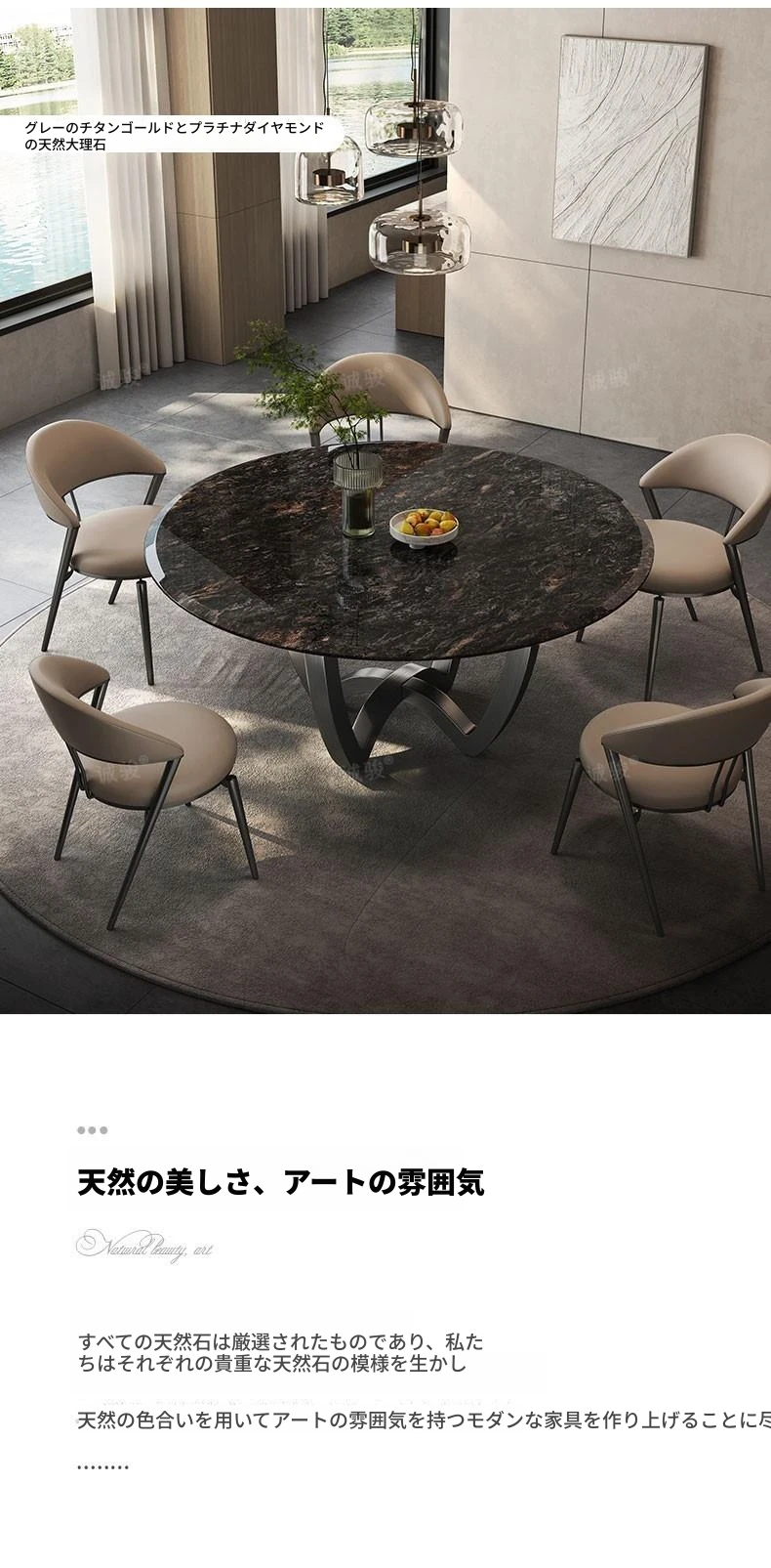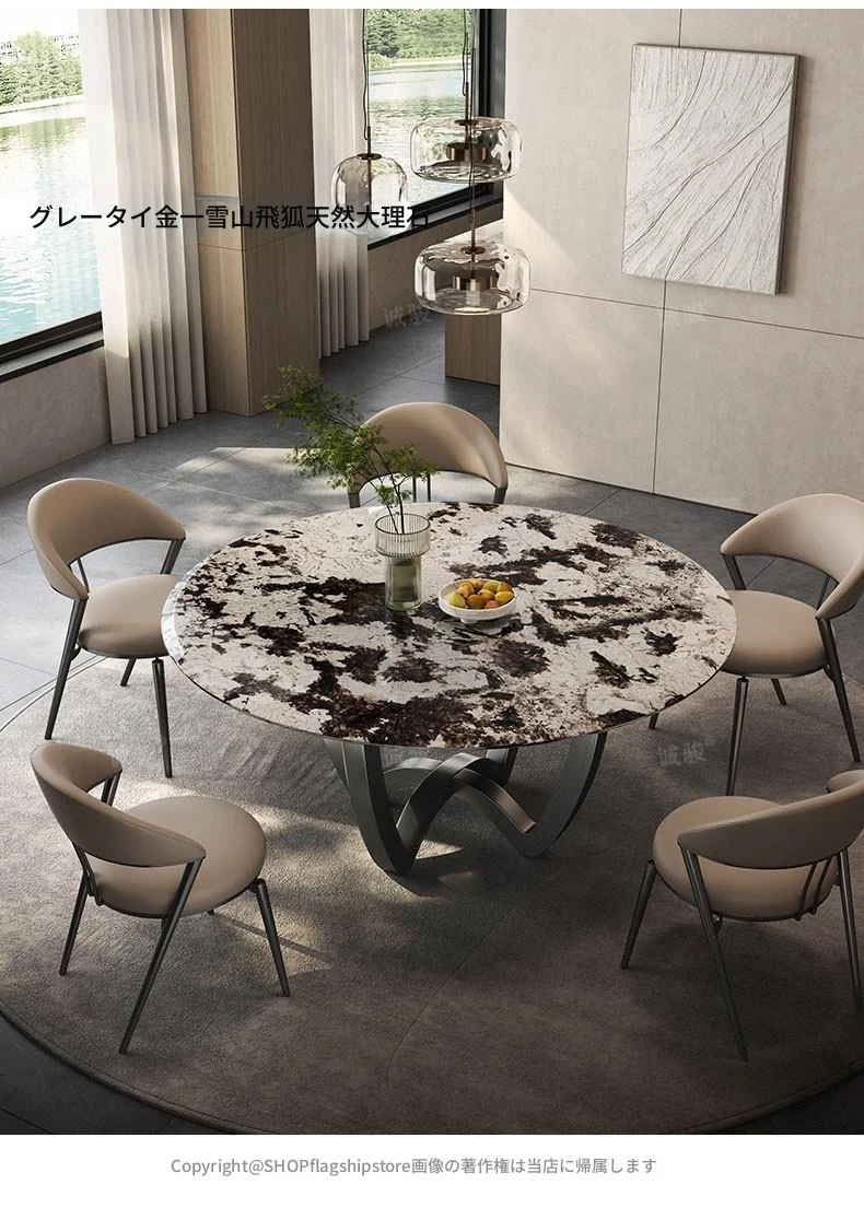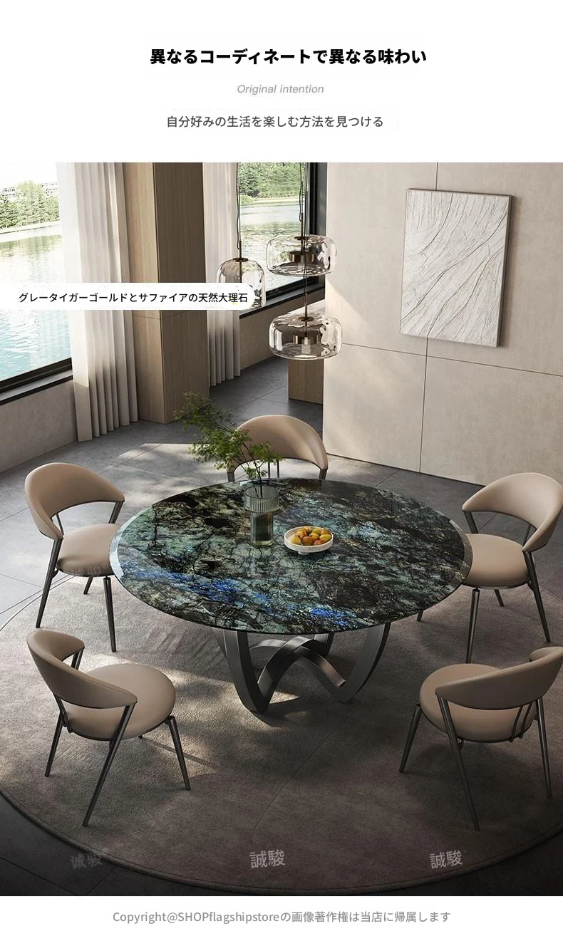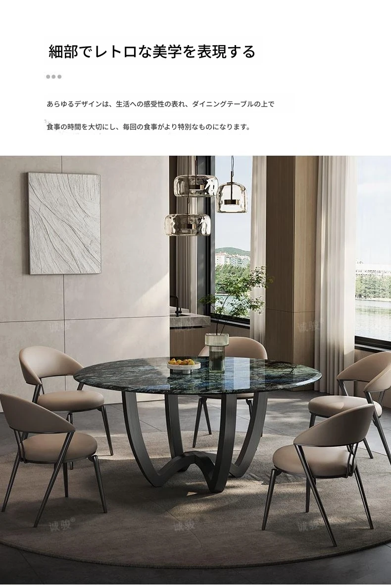 高級感溢れる大理石ラウンドダイニングテーブル - 天然ブルージェイドストーン使用、6人用の豪華なダイニングチェアセット!自宅や別荘にぴったりのデザインです。