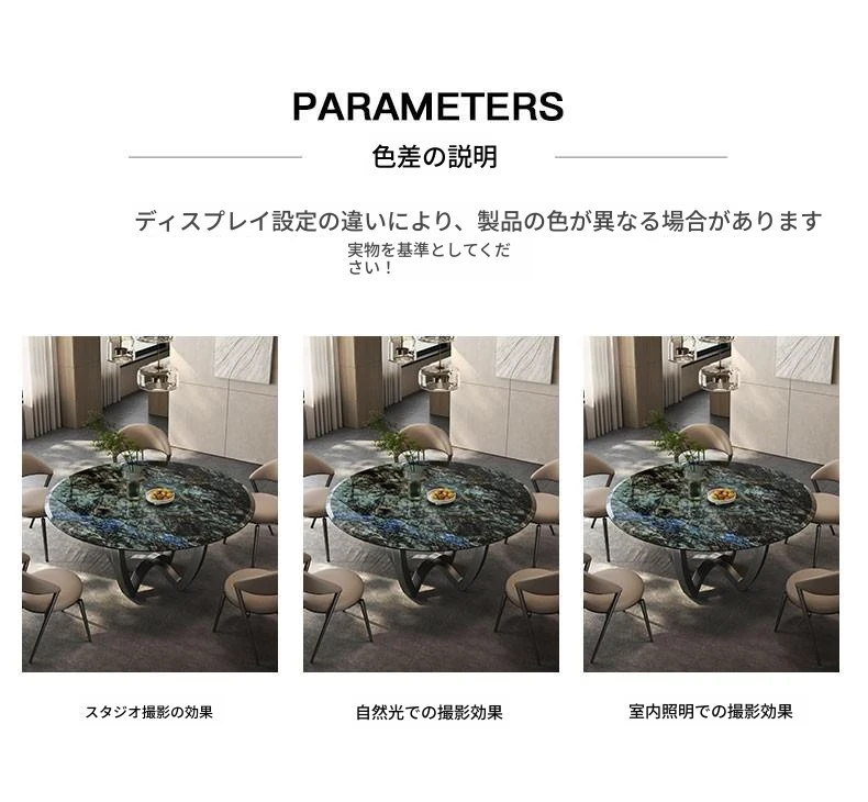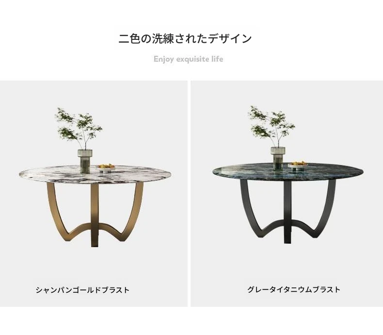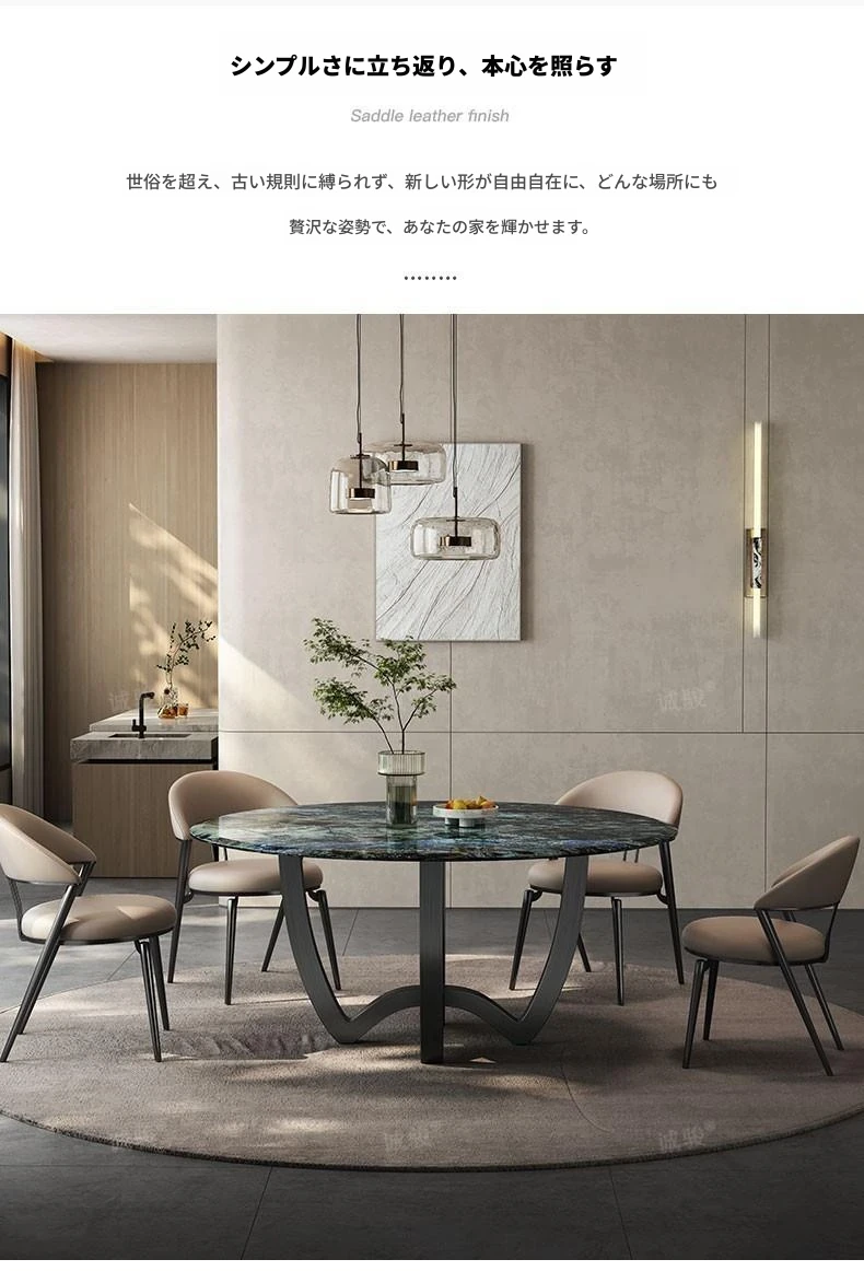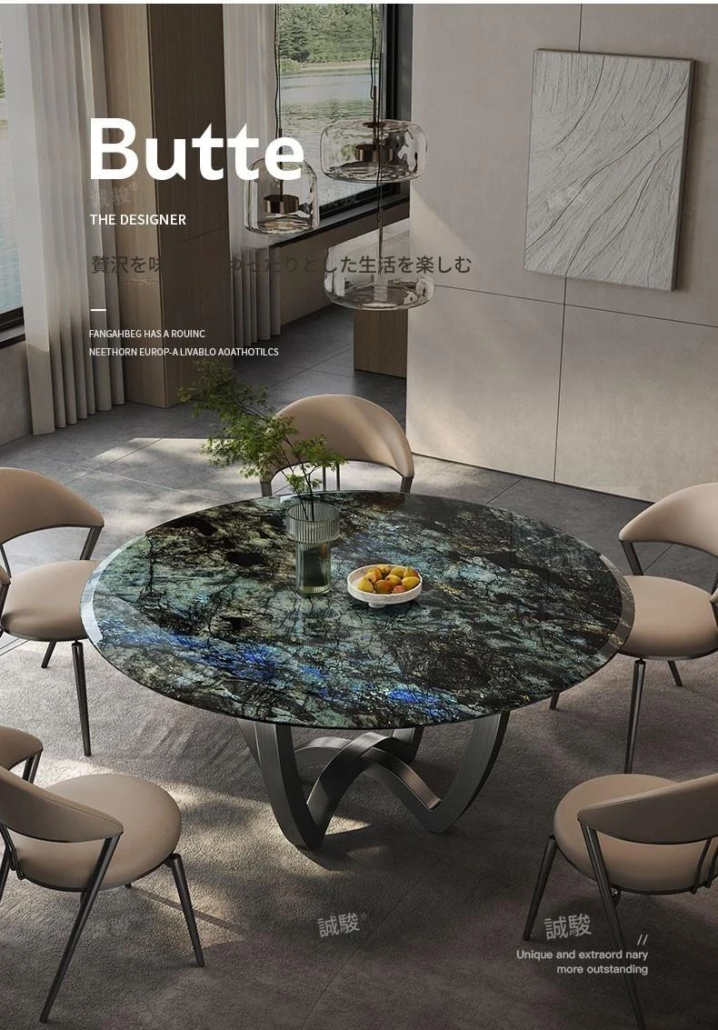 高級感溢れる大理石ラウンドダイニングテーブル - 天然ブルージェイドストーン使用、6人用の豪華なダイニングチェアセット!自宅や別荘にぴったりのデザインです。