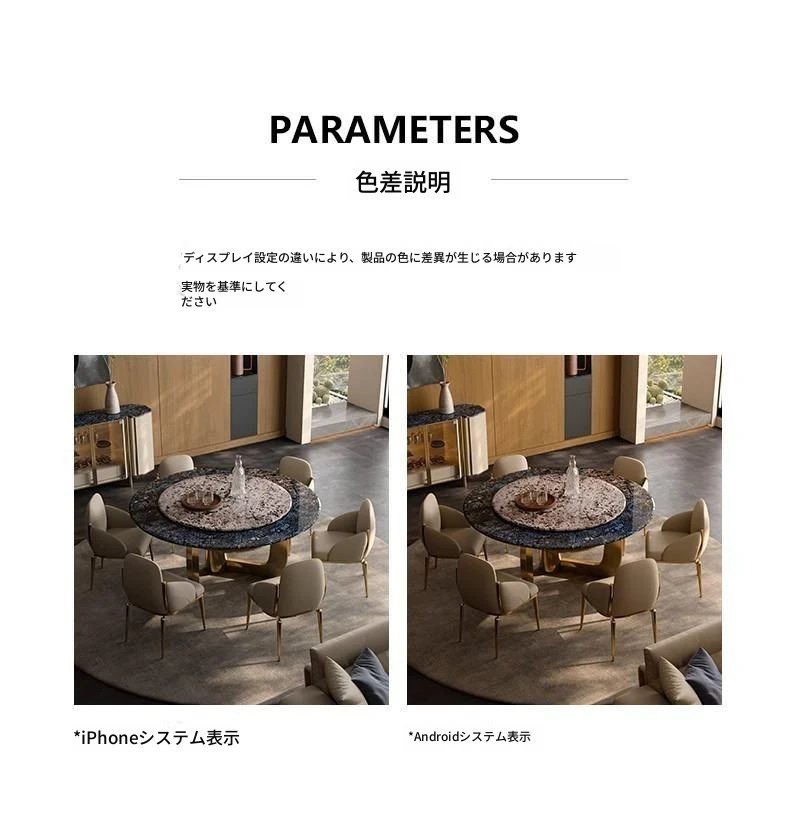 ラグジュアリー天然大理石ラウンドダイニングテーブル - 回転盤付き、ヴィラや広々とした空間に最適な高級感溢れる食卓。あなたの食事シーンを特別に演出します!