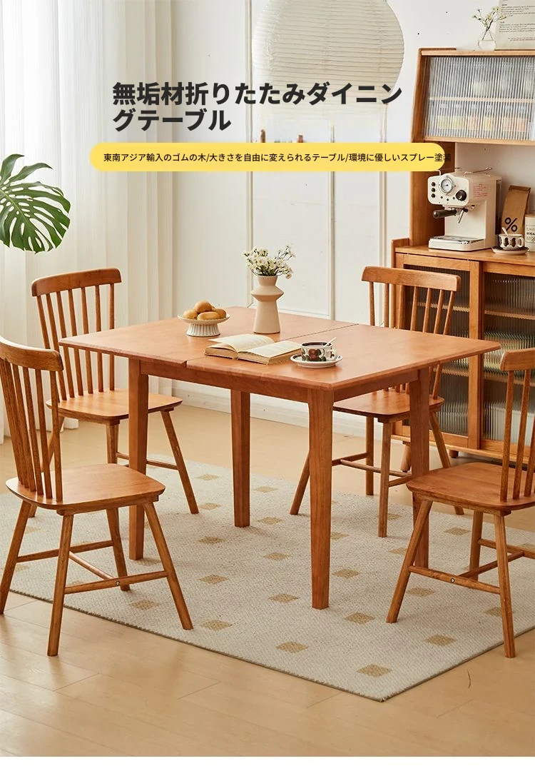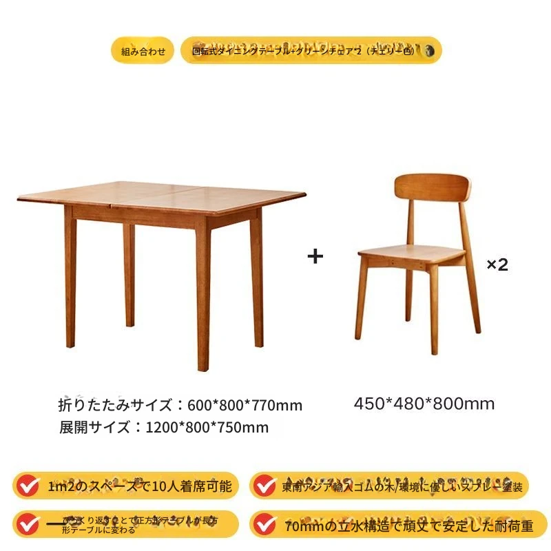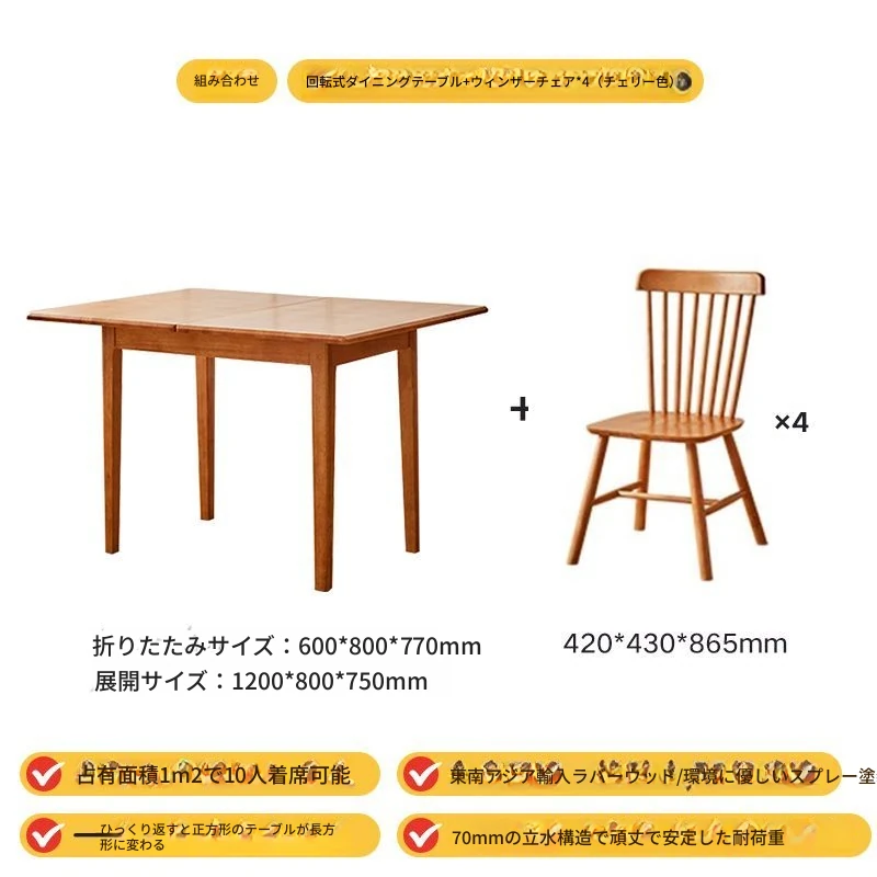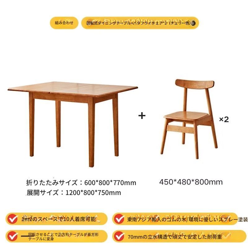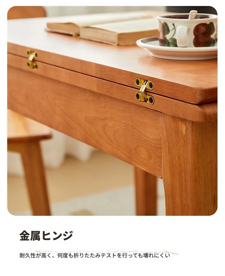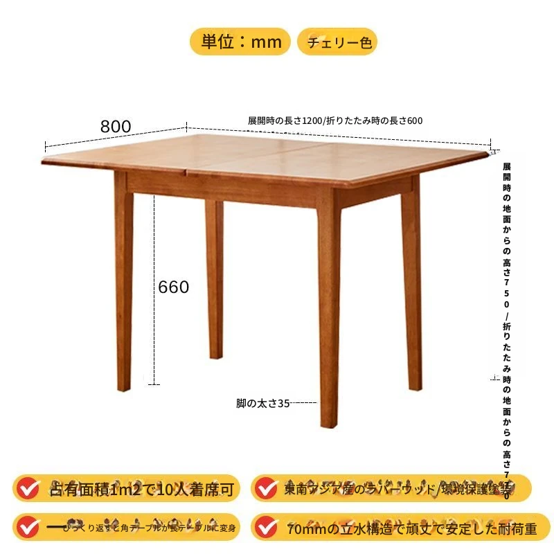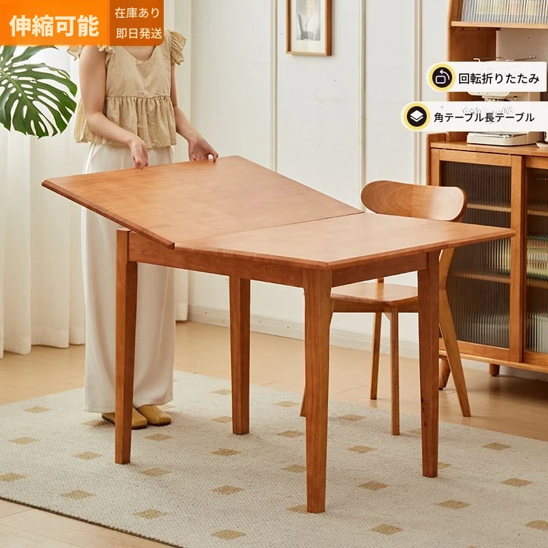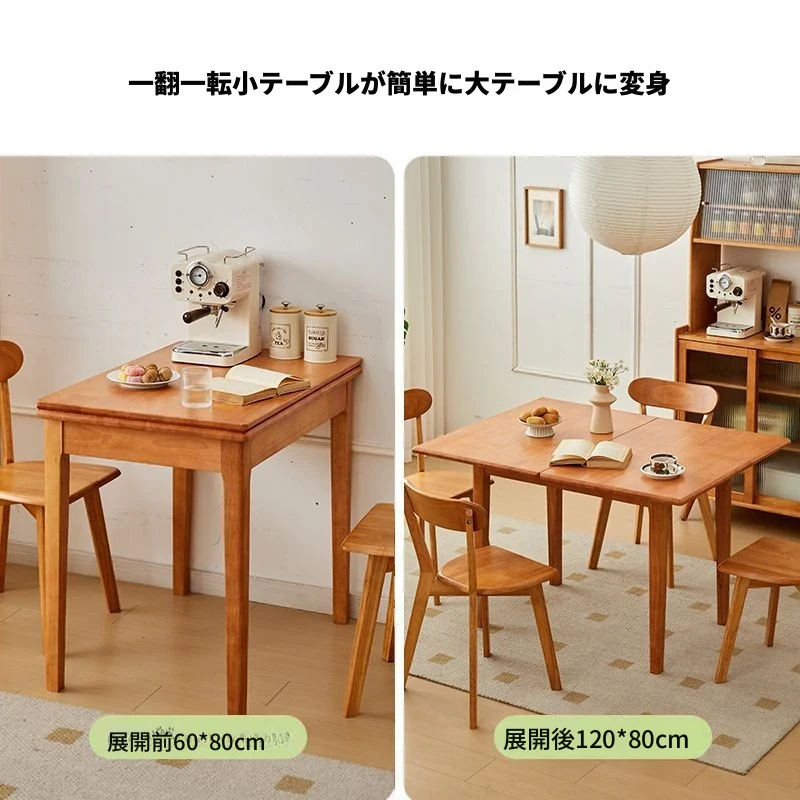 折りたたみ式実木ダイニングテーブル - スペースを有効活用!長方形&正方形のコンビネーション、コンパクトな家庭向け、チェリーウッドカラーでスタイリッシュな食事空間を演出!