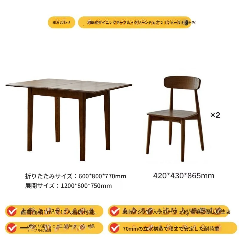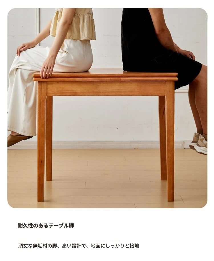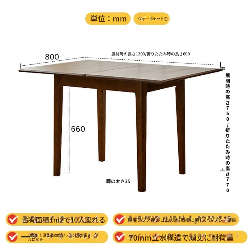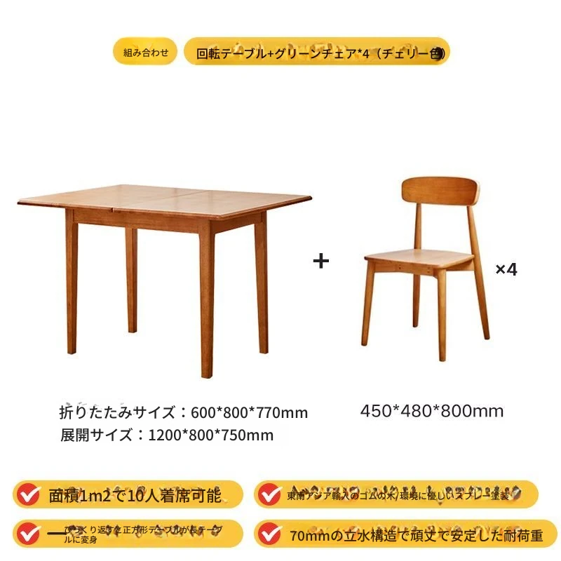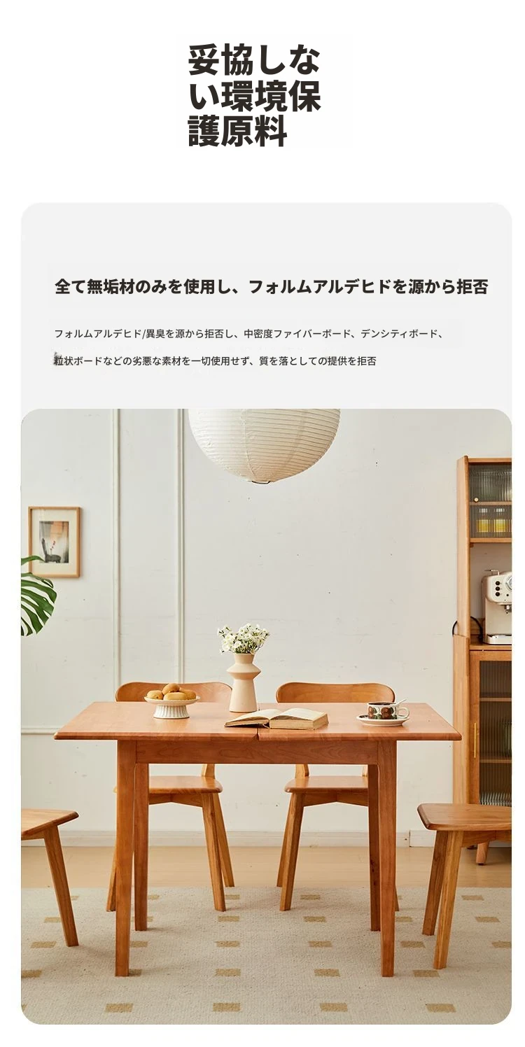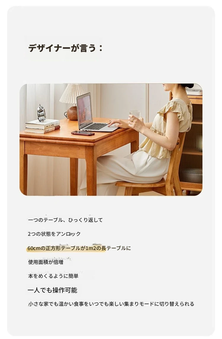 折りたたみ式実木ダイニングテーブル - スペースを有効活用!長方形&正方形のコンビネーション、コンパクトな家庭向け、チェリーウッドカラーでスタイリッシュな食事空間を演出!